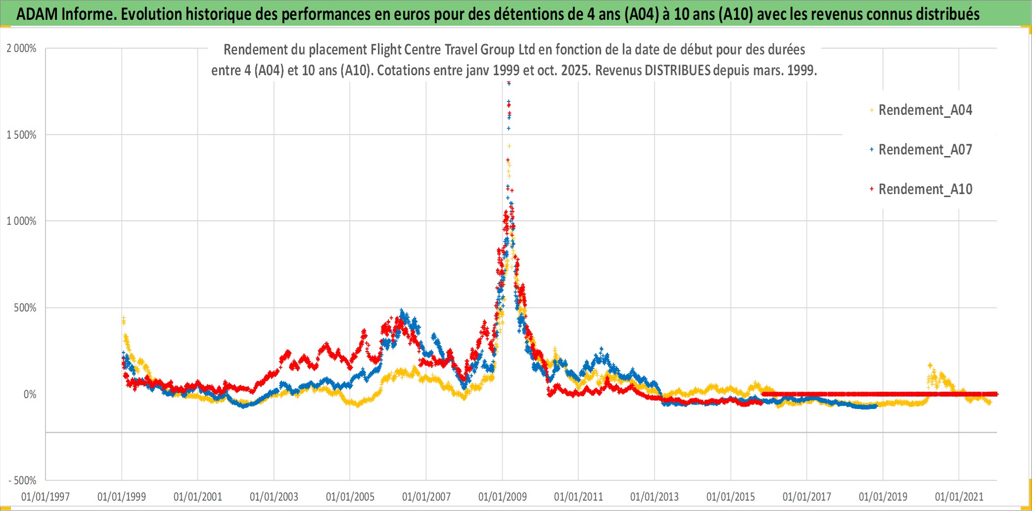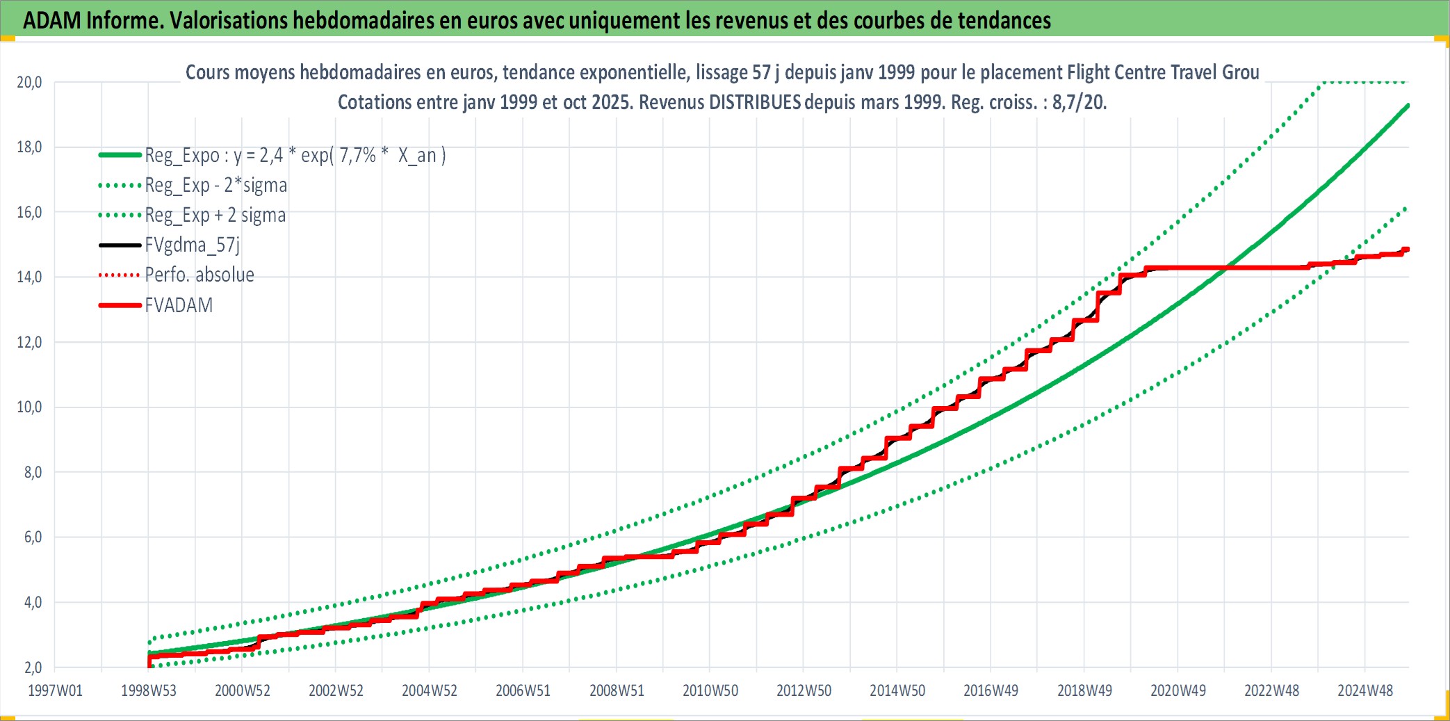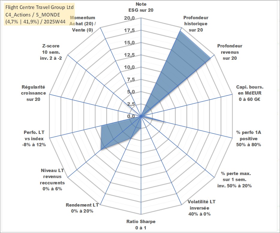 Site dédié aux investisseursPage dédiée sur site financeAnalyse des valorisations hebdomadaires de l'action Flight Centre Travel Group Ltd. Cet actif est cote en AUD. Les valorisations sont en contrevaleur EURO et couvrent les semaines 1999W01 a 2025W44. Les revenus de cet actif financier sont pris en compte depuis la semaine 1999W12. La note ESG de cet actif n'est pas connue.
