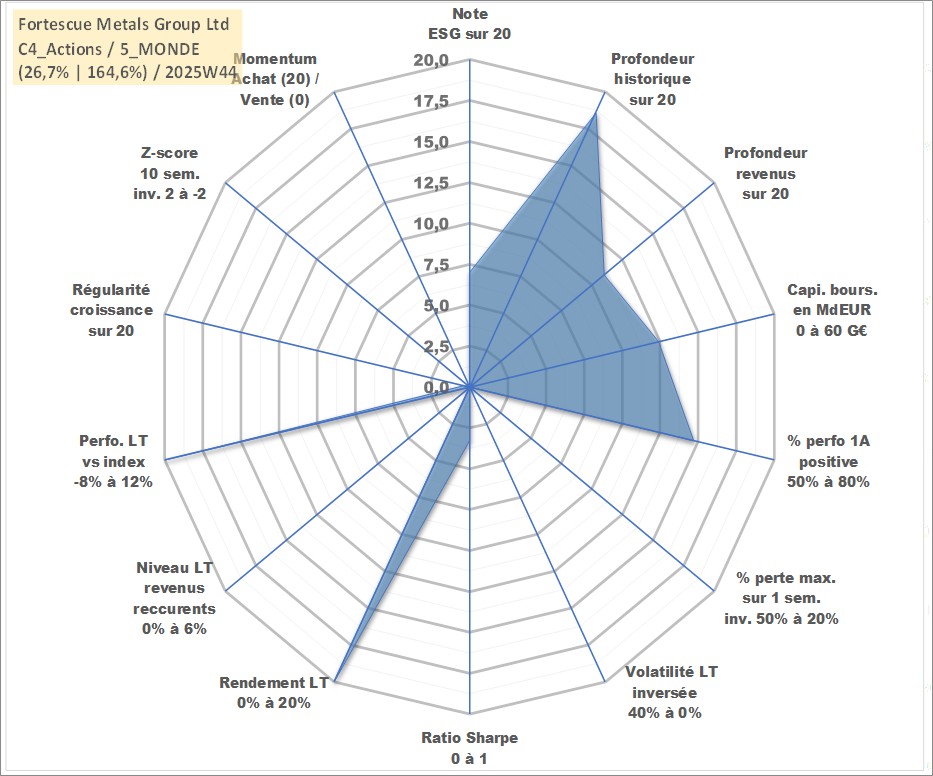 Site dédié aux investisseursPage dédiée sur site financeAnalyse des valorisations hebdomadaires de l'action Fortescue Metals Group Ltd. Cet actif est cote en AUD. Les valorisations sont en contrevaleur EURO et couvrent les semaines 1999W30 a 2025W44. Les revenus de cet actif financier sont pris en compte depuis la semaine 2011W10. La note globale ESG de cet actif est estimee a 7.0 (apres rebasage entre 0 et 20).