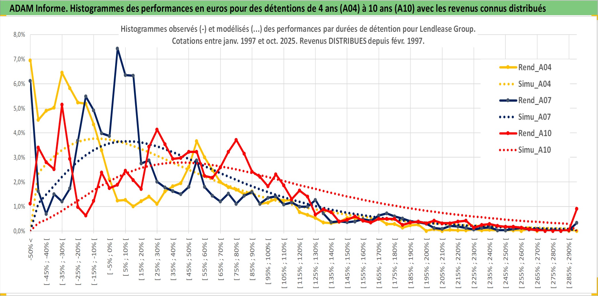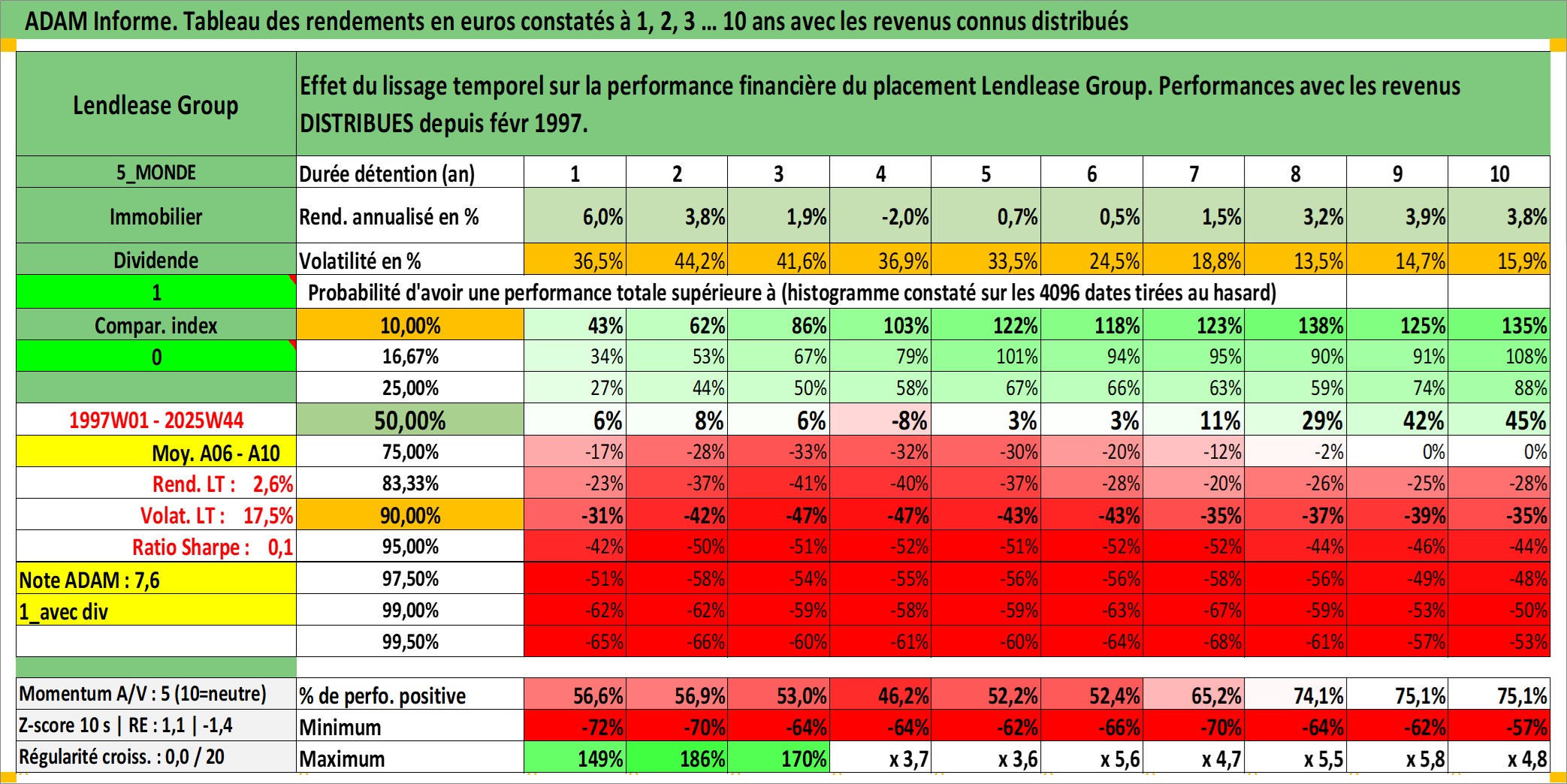 Site dédié aux investisseursPage dédiée sur site financeAnalyse des valorisations hebdomadaires de l'action Lendlease Group. Cet actif est cote en AUD. Les valorisations sont en contrevaleur EURO et couvrent les semaines 1997W01 a 2025W44. Les revenus de cet actif financier sont pris en compte depuis la semaine 1997W09. La note globale ESG de cet actif est estimee a 10.0 (apres rebasage entre 0 et 20).