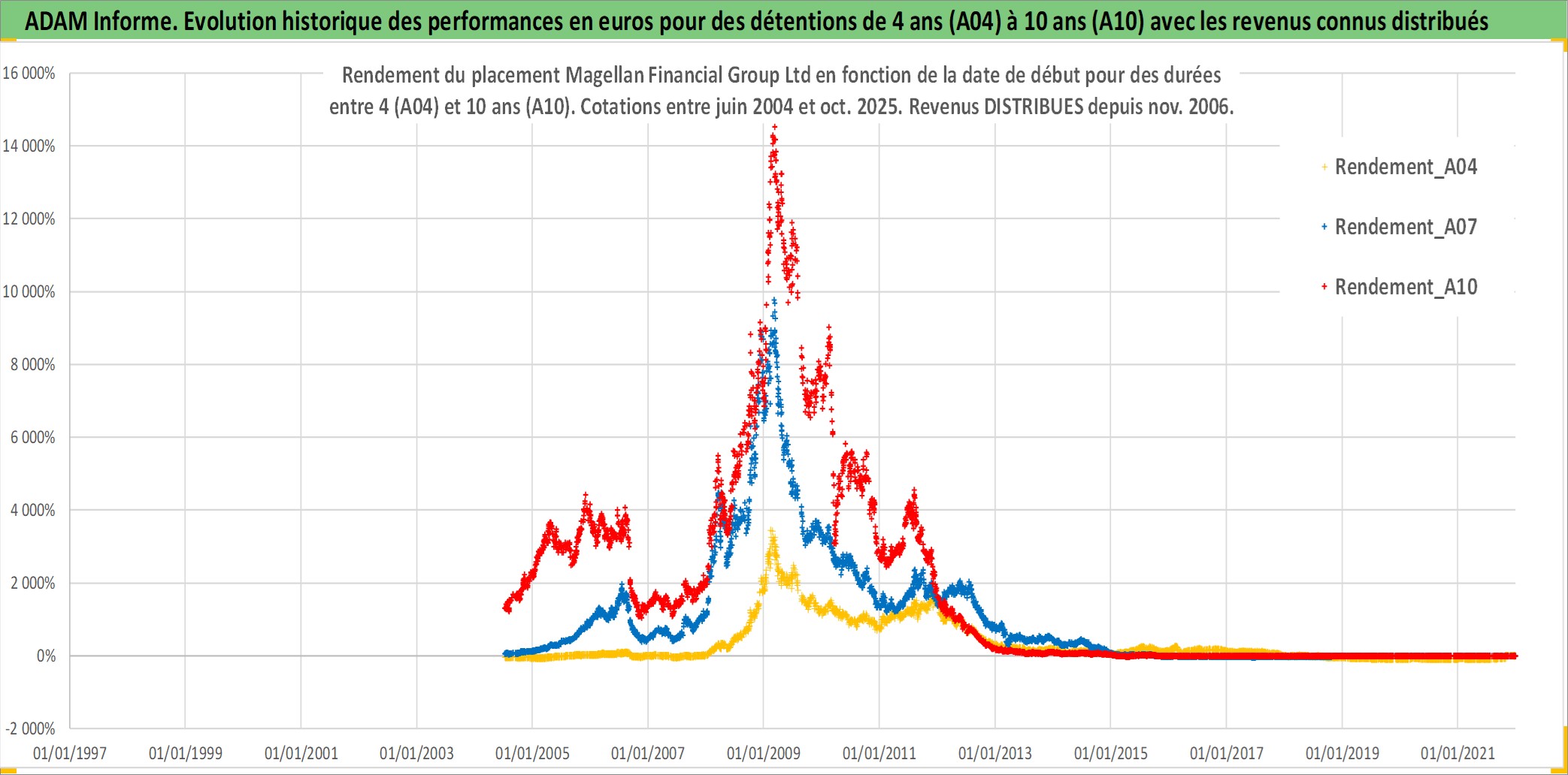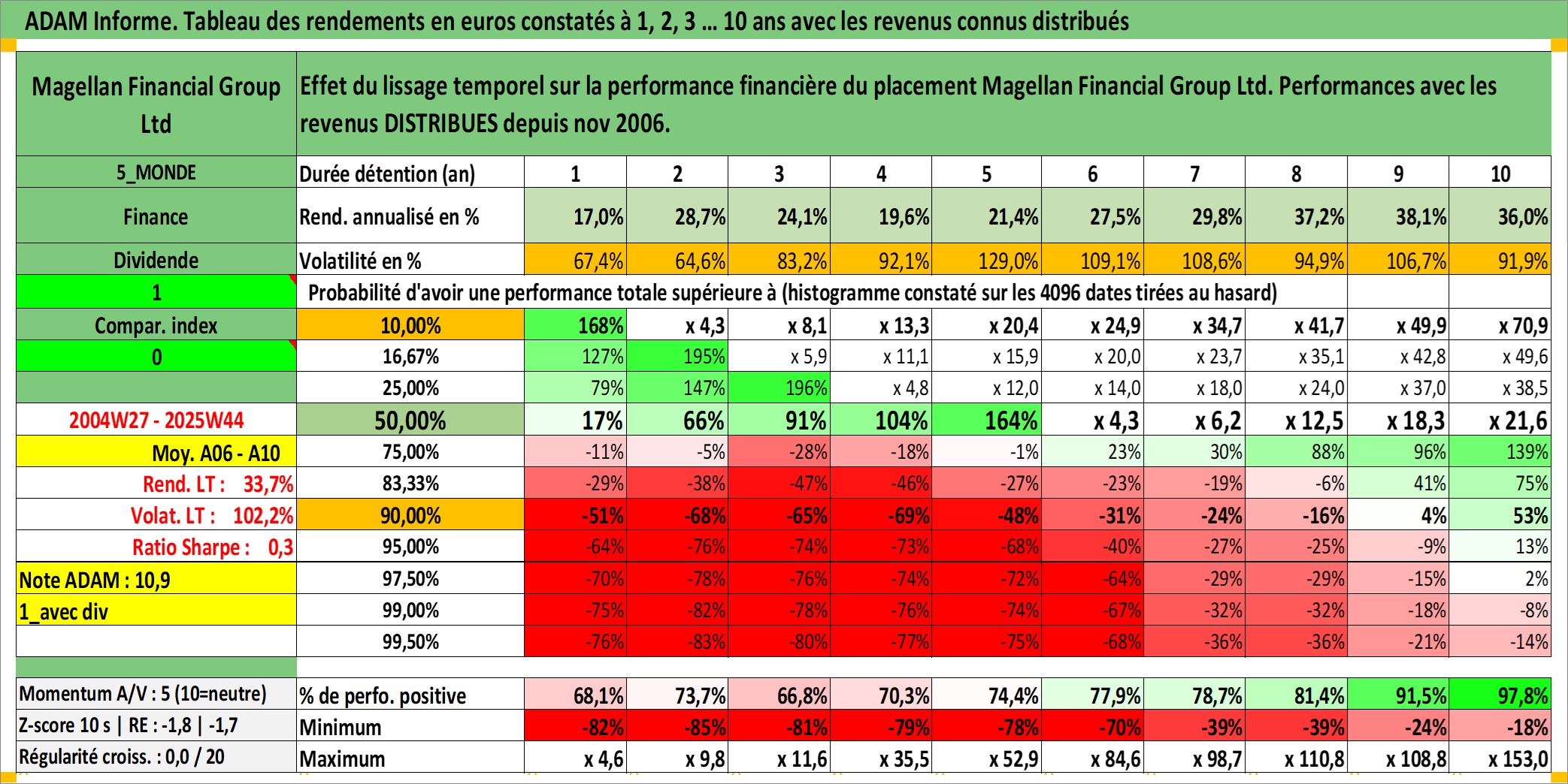 Site dédié aux investisseursPage dédiée sur site financeAnalyse des valorisations hebdomadaires de l'action Magellan Financial Group Ltd. Cet actif est cote en AUD. Les valorisations sont en contrevaleur EURO et couvrent les semaines 2004W27 a 2025W44. Les revenus de cet actif financier sont pris en compte depuis la semaine 2006W46. La note ESG de cet actif n'est pas connue.