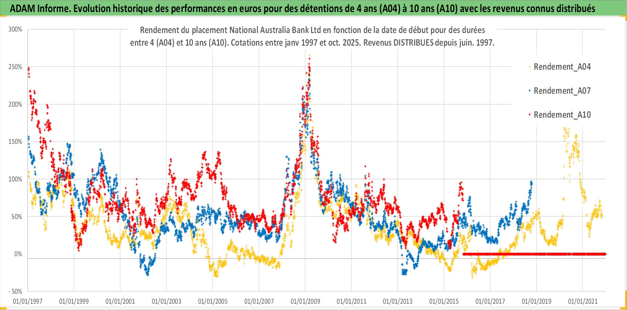 Site dédié aux investisseursPage dédiée sur site financeAnalyse des valorisations hebdomadaires de l'action National Australia Bank Ltd. Cet actif est cote en AUD. Les valorisations sont en contrevaleur EURO et couvrent les semaines 1997W01 a 2025W44. Les revenus de cet actif financier sont pris en compte depuis la semaine 1997W27. La note globale ESG de cet actif est estimee a 8.0 (apres rebasage entre 0 et 20).
