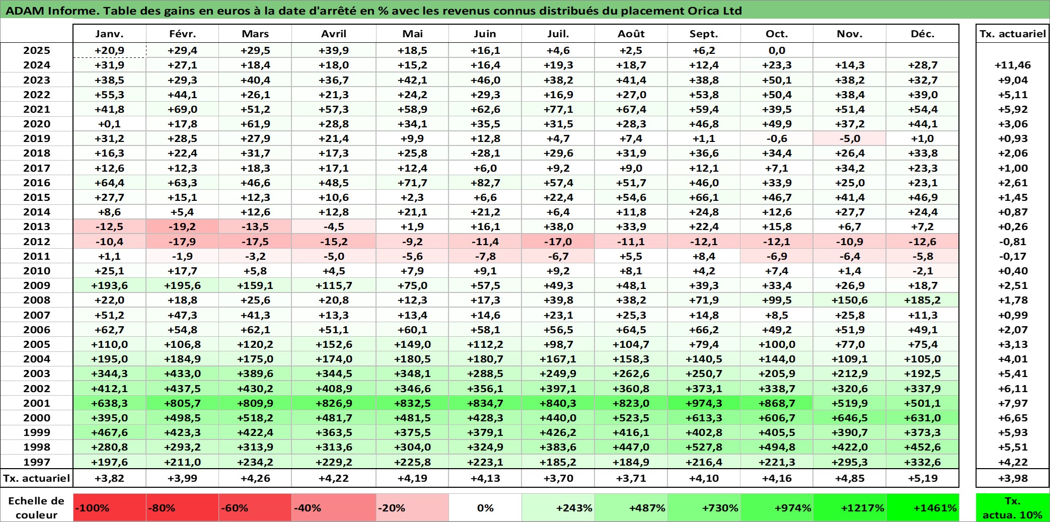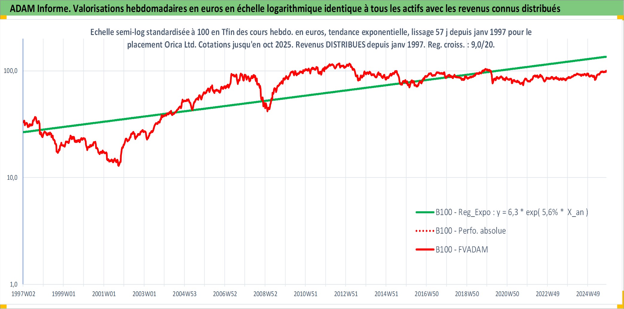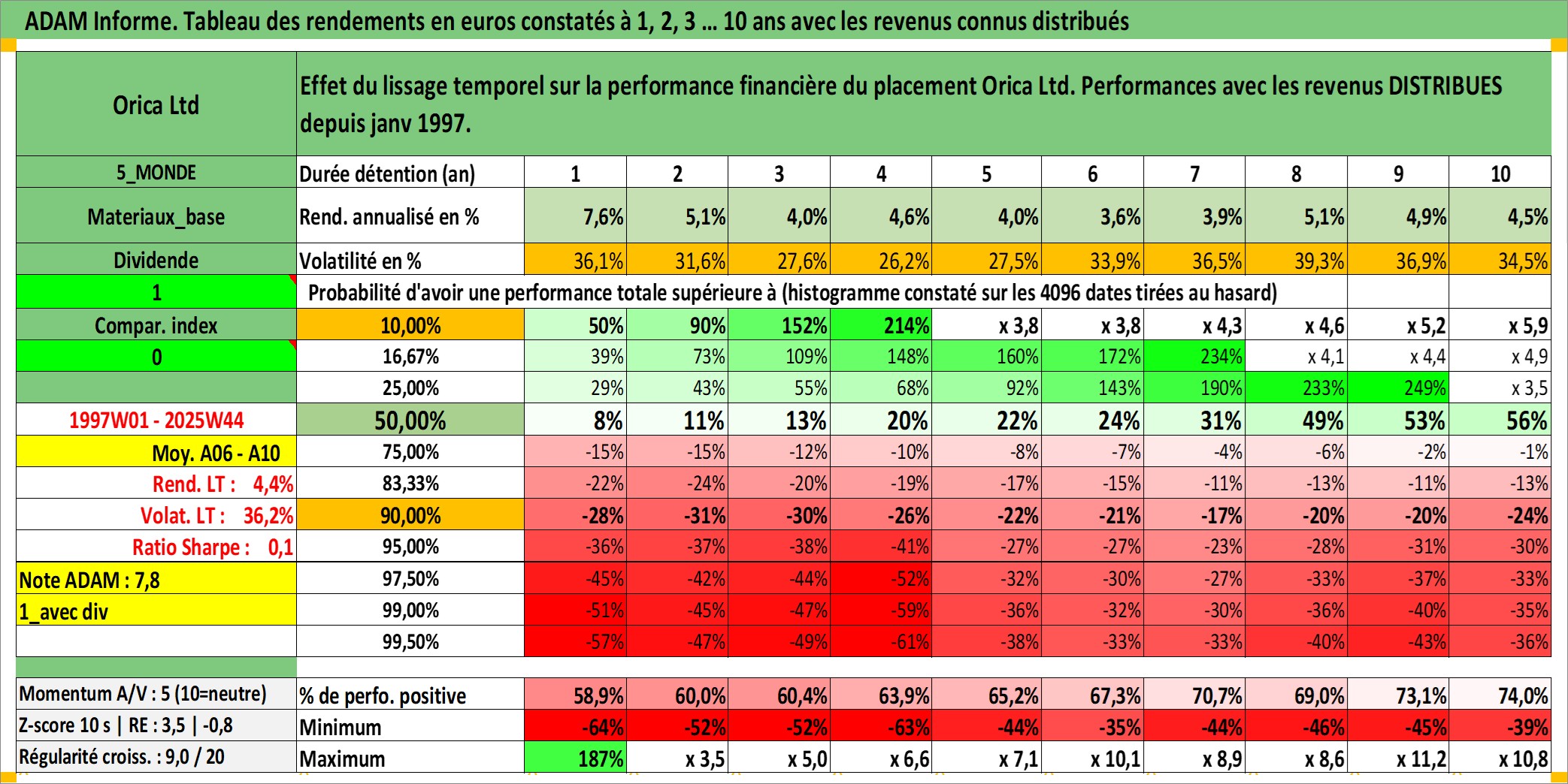 Site dédié aux investisseursPage dédiée sur site financeAnalyse des valorisations hebdomadaires de l'action Orica Ltd. Cet actif est cote en AUD. Les valorisations sont en contrevaleur EURO et couvrent les semaines 1997W01 a 2025W44. Les revenus de cet actif financier sont pris en compte depuis la semaine 1997W01. La note globale ESG de cet actif est estimee a 5.0 (apres rebasage entre 0 et 20).