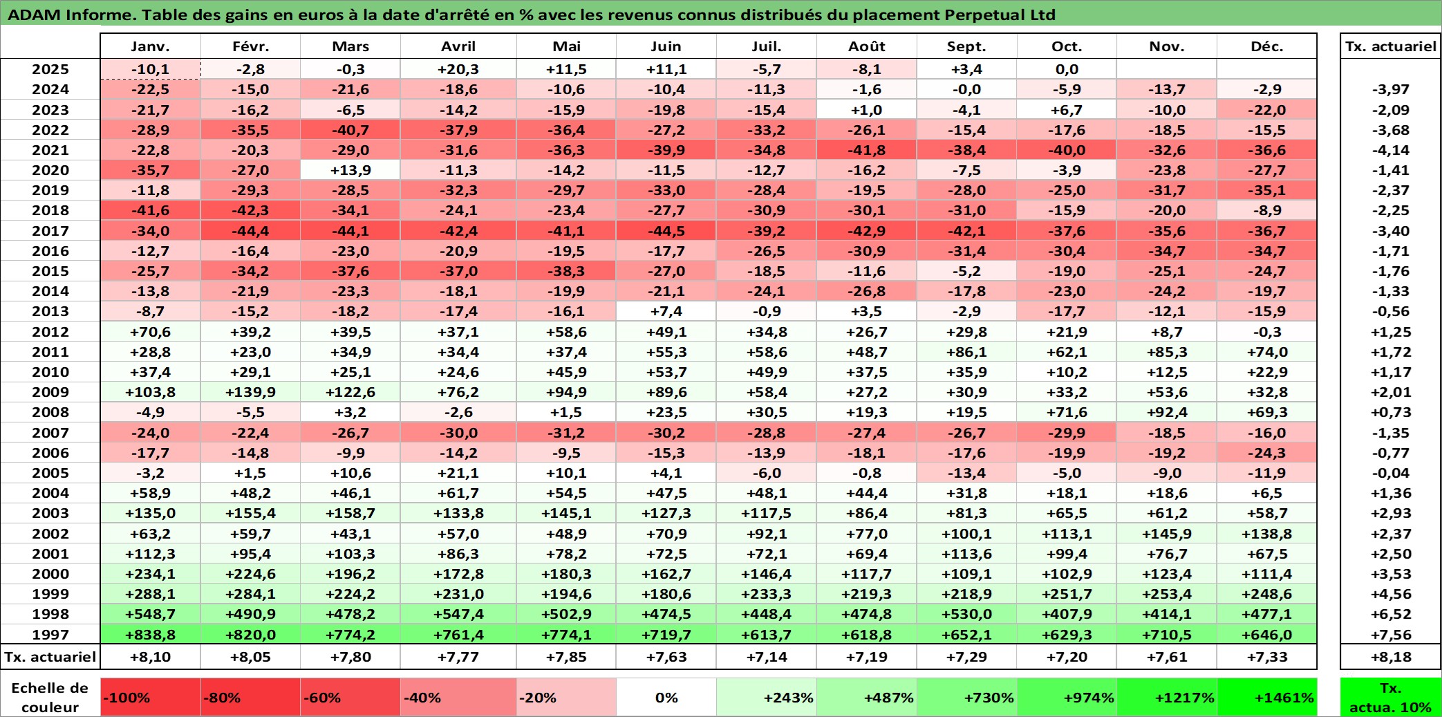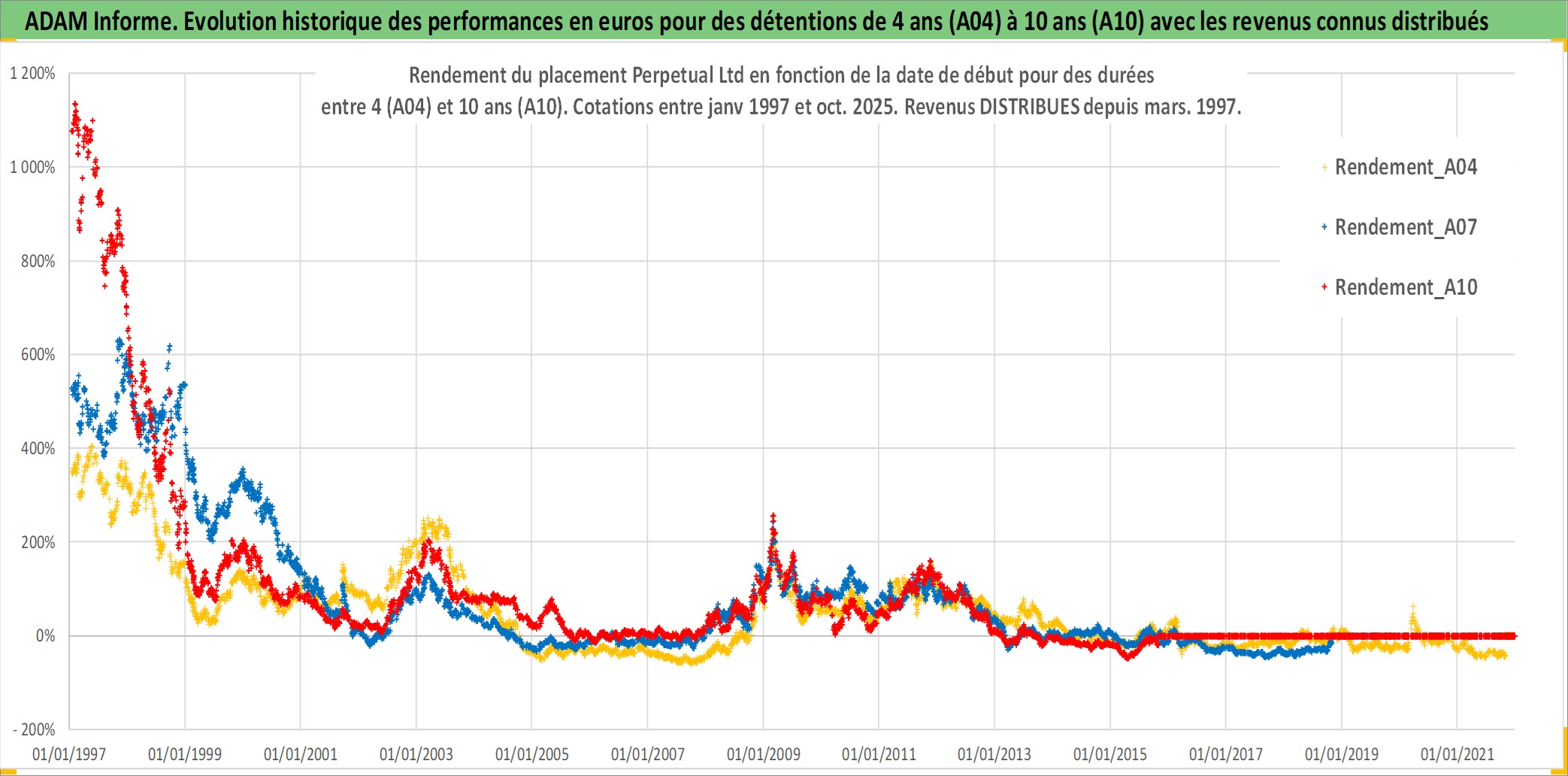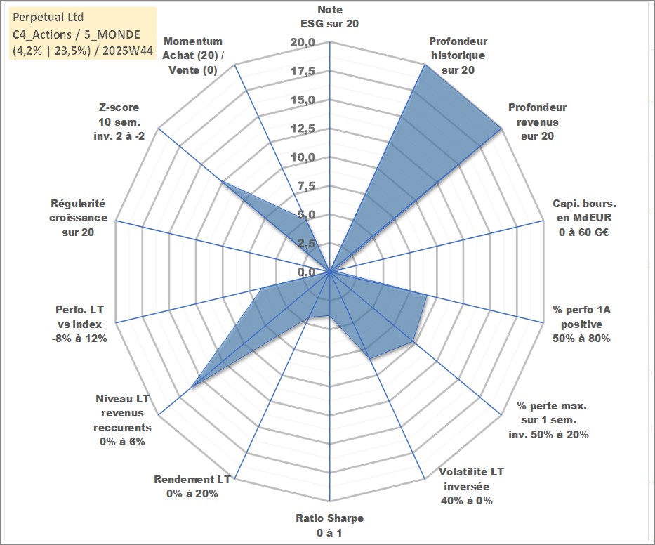 Site dédié aux investisseursPage dédiée sur site financeAnalyse des valorisations hebdomadaires de l'action Perpetual Ltd. Cet actif est cote en AUD. Les valorisations sont en contrevaleur EURO et couvrent les semaines 1997W01 a 2025W44. Les revenus de cet actif financier sont pris en compte depuis la semaine 1997W09. La note ESG de cet actif n'est pas connue.