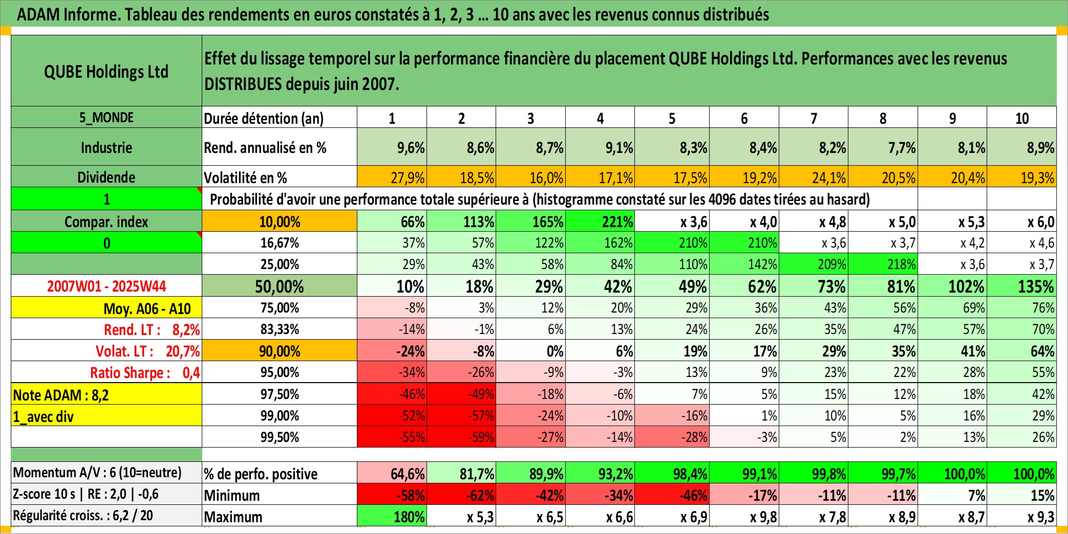 Site dédié aux investisseursPage dédiée sur site financeAnalyse des valorisations hebdomadaires de l'action QUBE Holdings Ltd. Cet actif est cote en AUD. Les valorisations sont en contrevaleur EURO et couvrent les semaines 2007W01 a 2025W44. Les revenus de cet actif financier sont pris en compte depuis la semaine 2007W26. La note ESG de cet actif n'est pas connue.