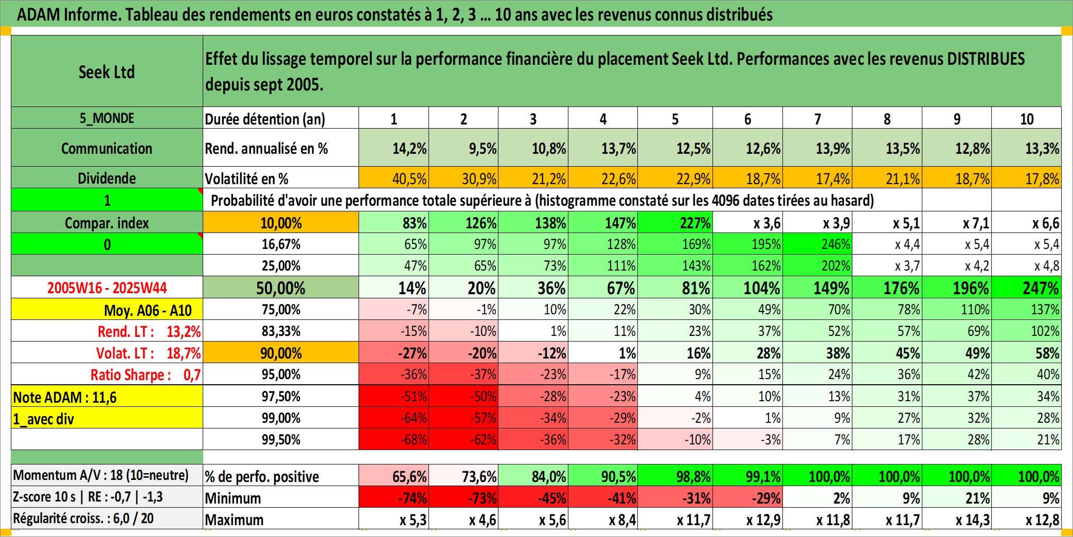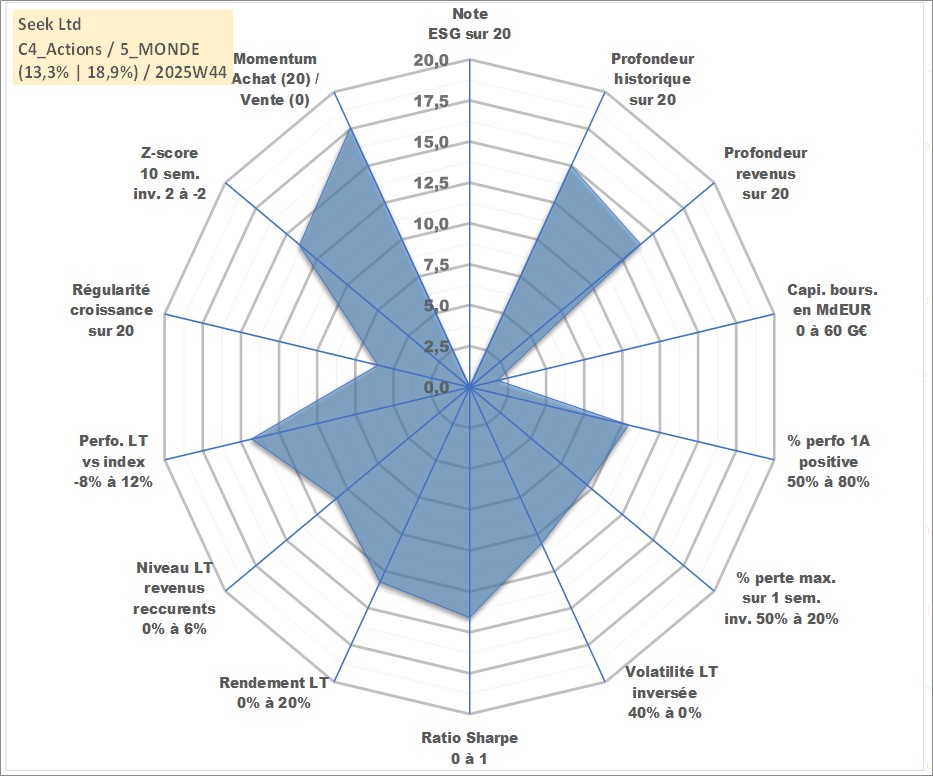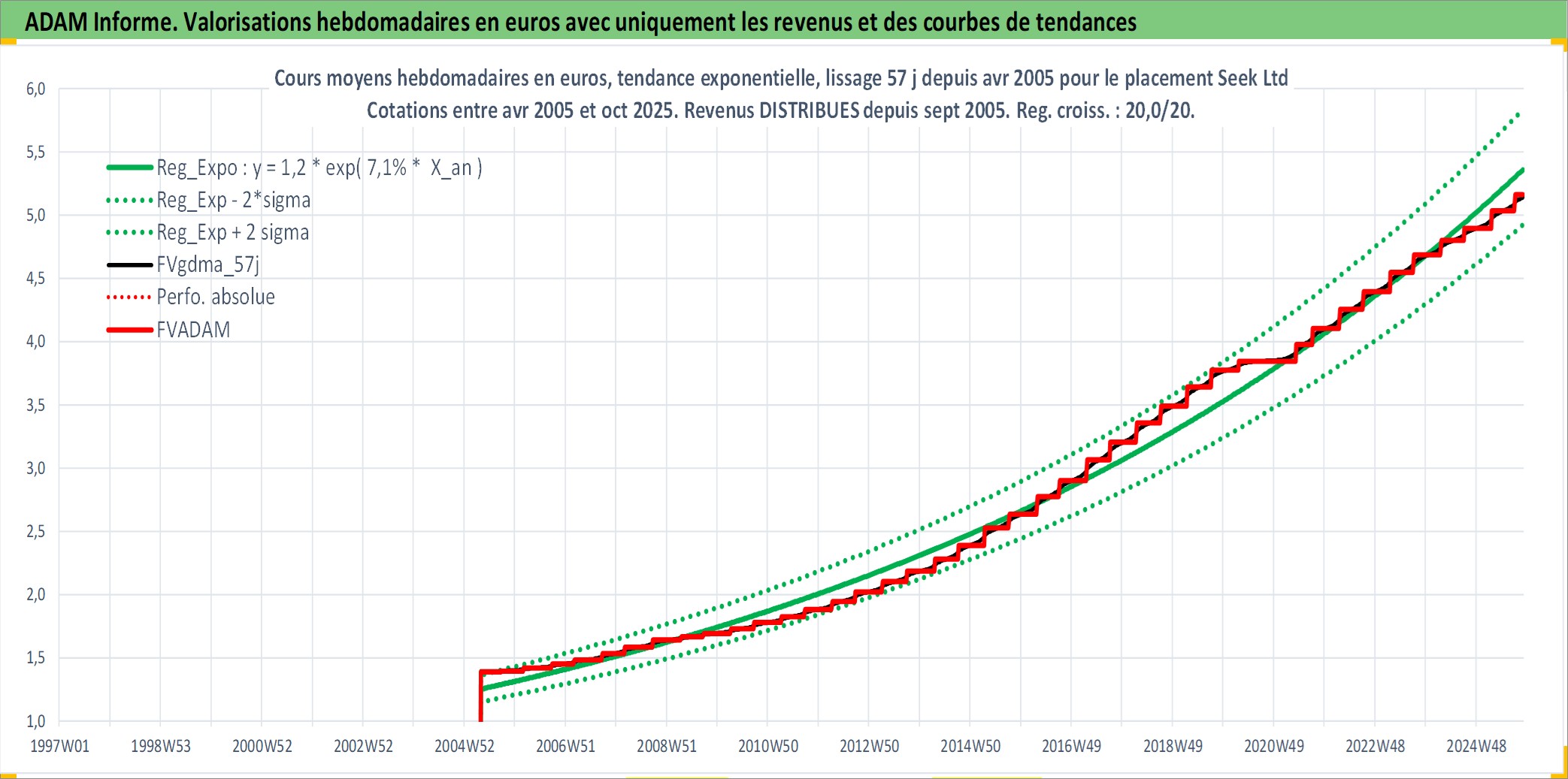 Site dédié aux investisseursPage dédiée sur site financeAnalyse des valorisations hebdomadaires de l'action Seek Ltd. Cet actif est cote en AUD. Les valorisations sont en contrevaleur EURO et couvrent les semaines 2005W16 a 2025W44. Les revenus de cet actif financier sont pris en compte depuis la semaine 2005W37. La note ESG de cet actif n'est pas connue.