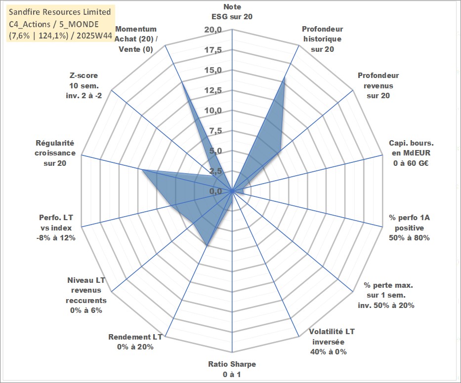 Site dédié aux investisseursPage dédiée sur site financeAnalyse des valorisations hebdomadaires de l'action Sandfire Resources Limited. Cet actif est cote en AUD. Les valorisations sont en contrevaleur EURO et couvrent les semaines 2004W10 a 2025W44. Les revenus de cet actif financier sont pris en compte depuis la semaine 2014W37. La note ESG de cet actif n'est pas connue.