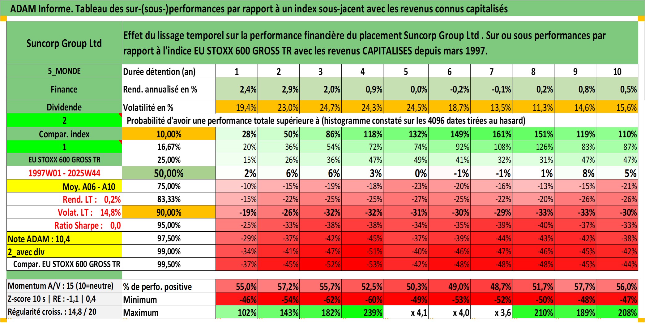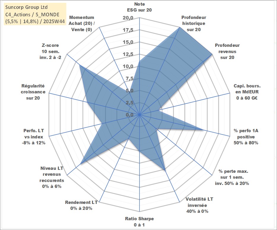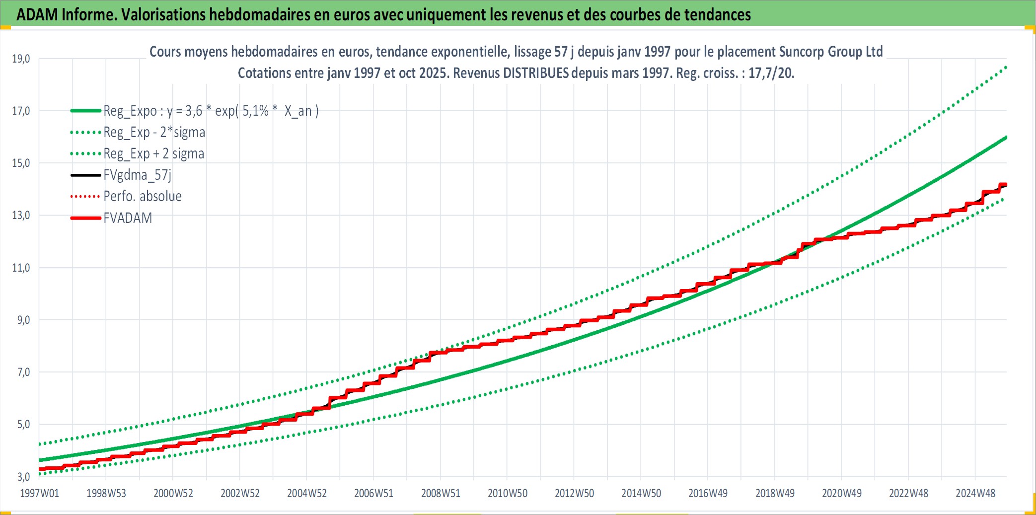 Site dédié aux investisseursPage dédiée sur site financeAnalyse des valorisations hebdomadaires de l'action Suncorp Group Ltd . Cet actif est cote en AUD. Les valorisations sont en contrevaleur EURO et couvrent les semaines 1997W01 a 2025W44. Les revenus de cet actif financier sont pris en compte depuis la semaine 1997W11. La note globale ESG de cet actif est estimee a 11.0 (apres rebasage entre 0 et 20).