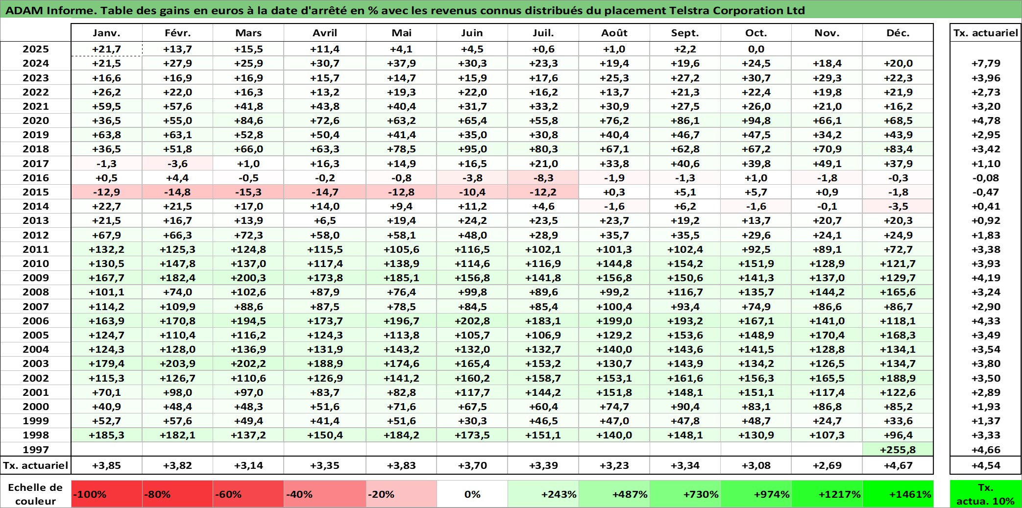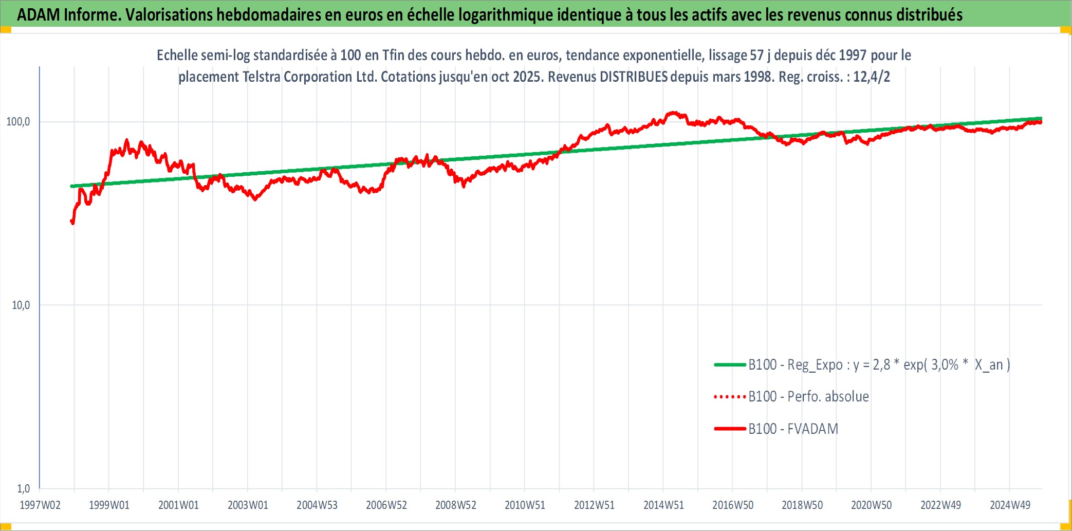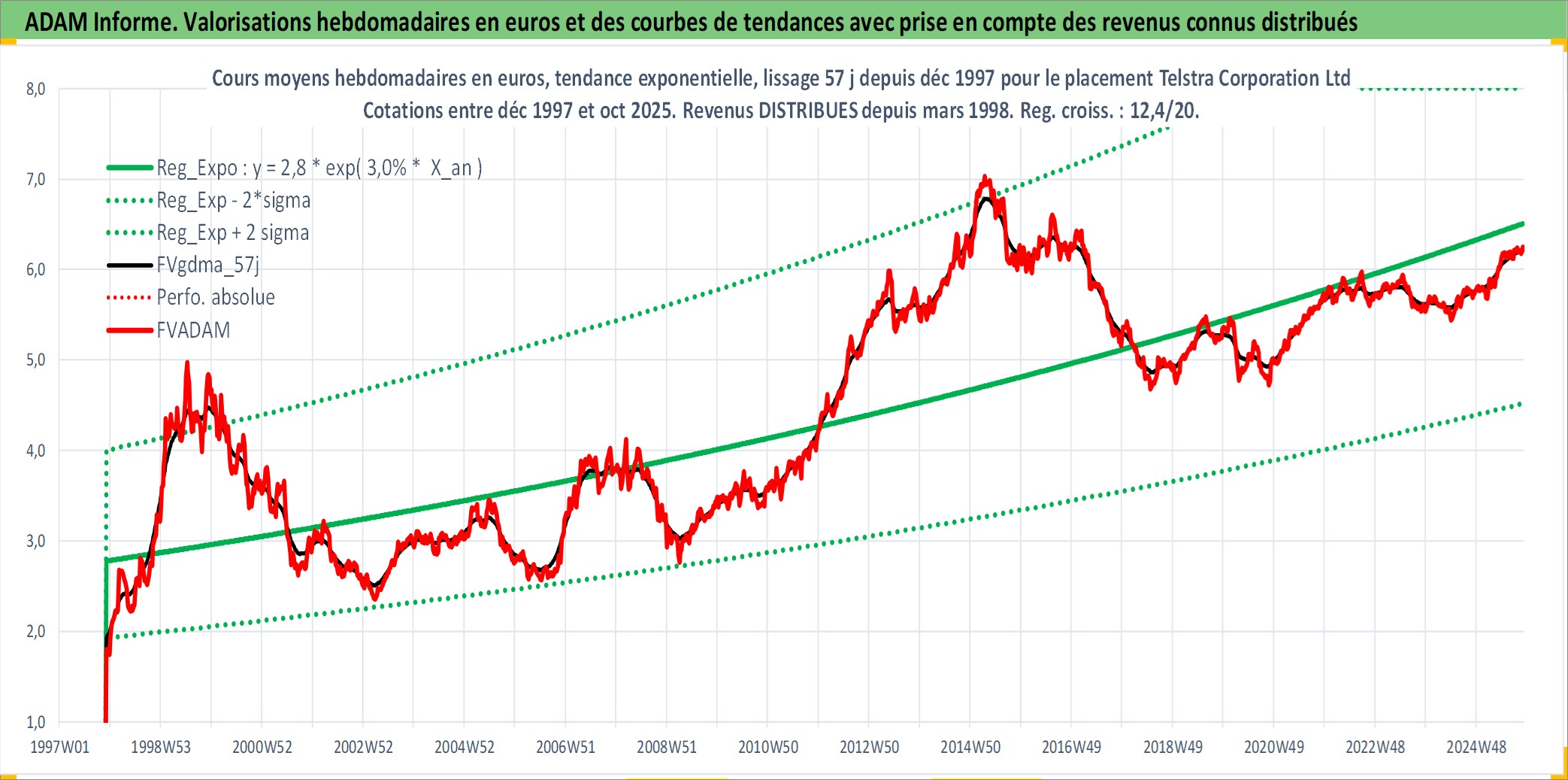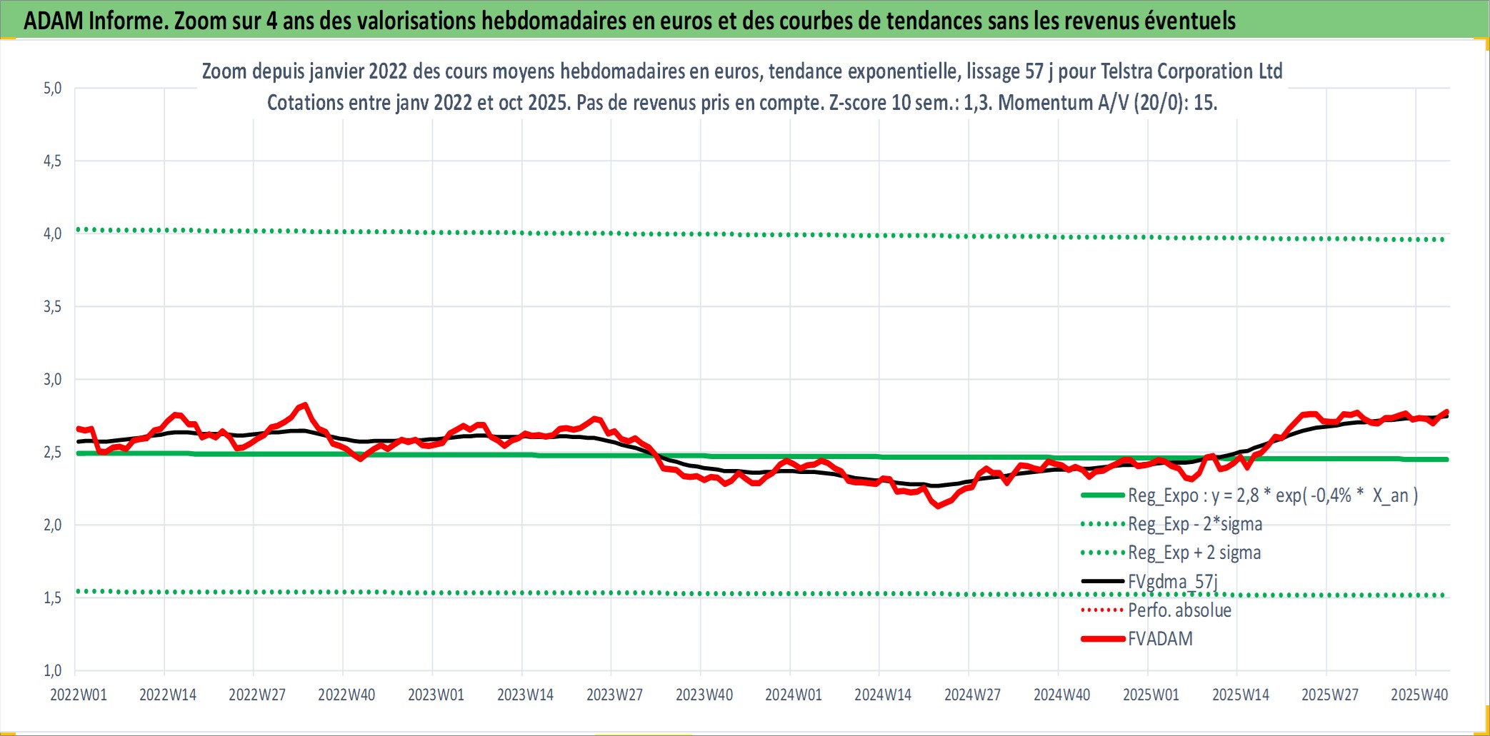 Site dédié aux investisseursPage dédiée sur site financeAnalyse des valorisations hebdomadaires de l'action Telstra Corporation Ltd. Cet actif est cote en AUD. Les valorisations sont en contrevaleur EURO et couvrent les semaines 1997W49 a 2025W44. Les revenus de cet actif financier sont pris en compte depuis la semaine 1998W09. La note globale ESG de cet actif est estimee a 8.0 (apres rebasage entre 0 et 20).