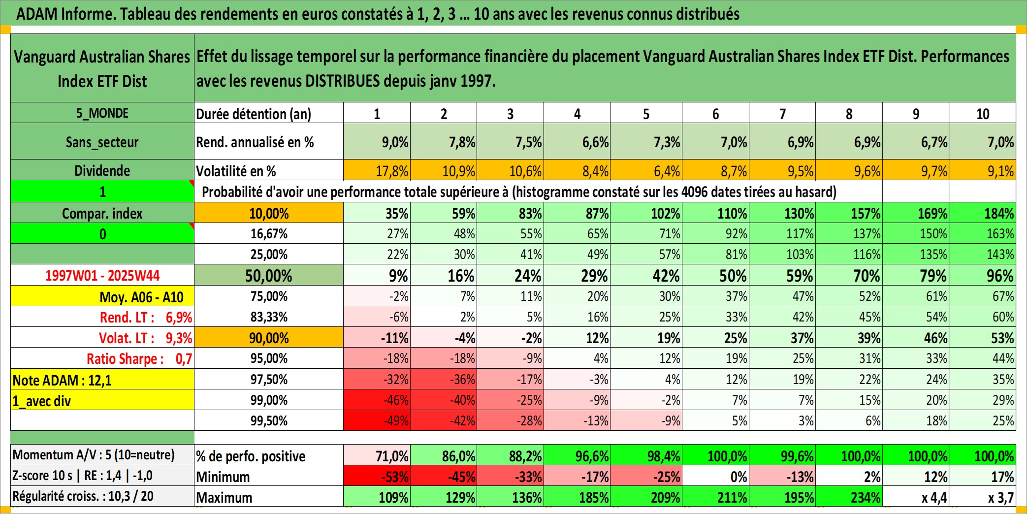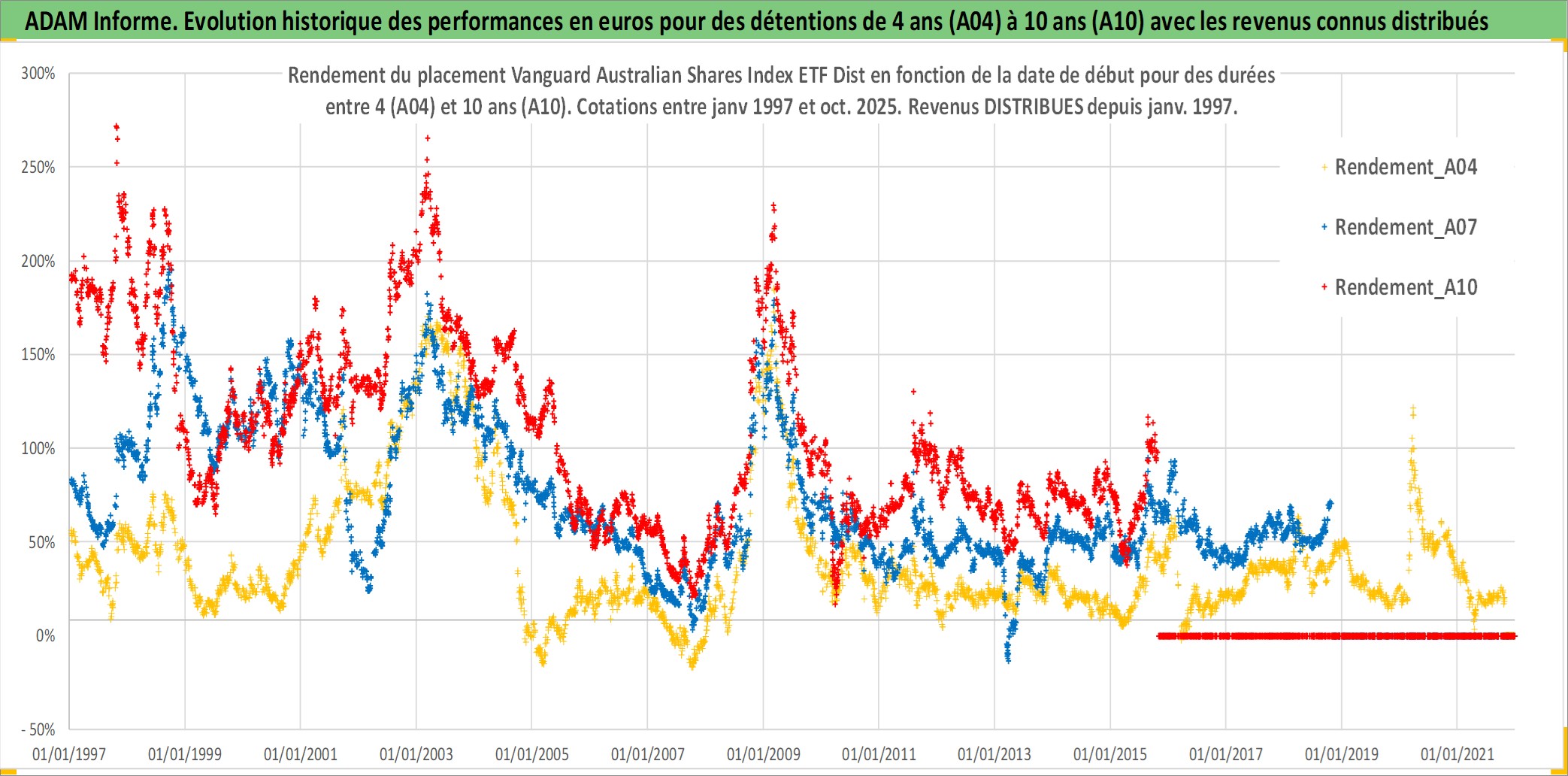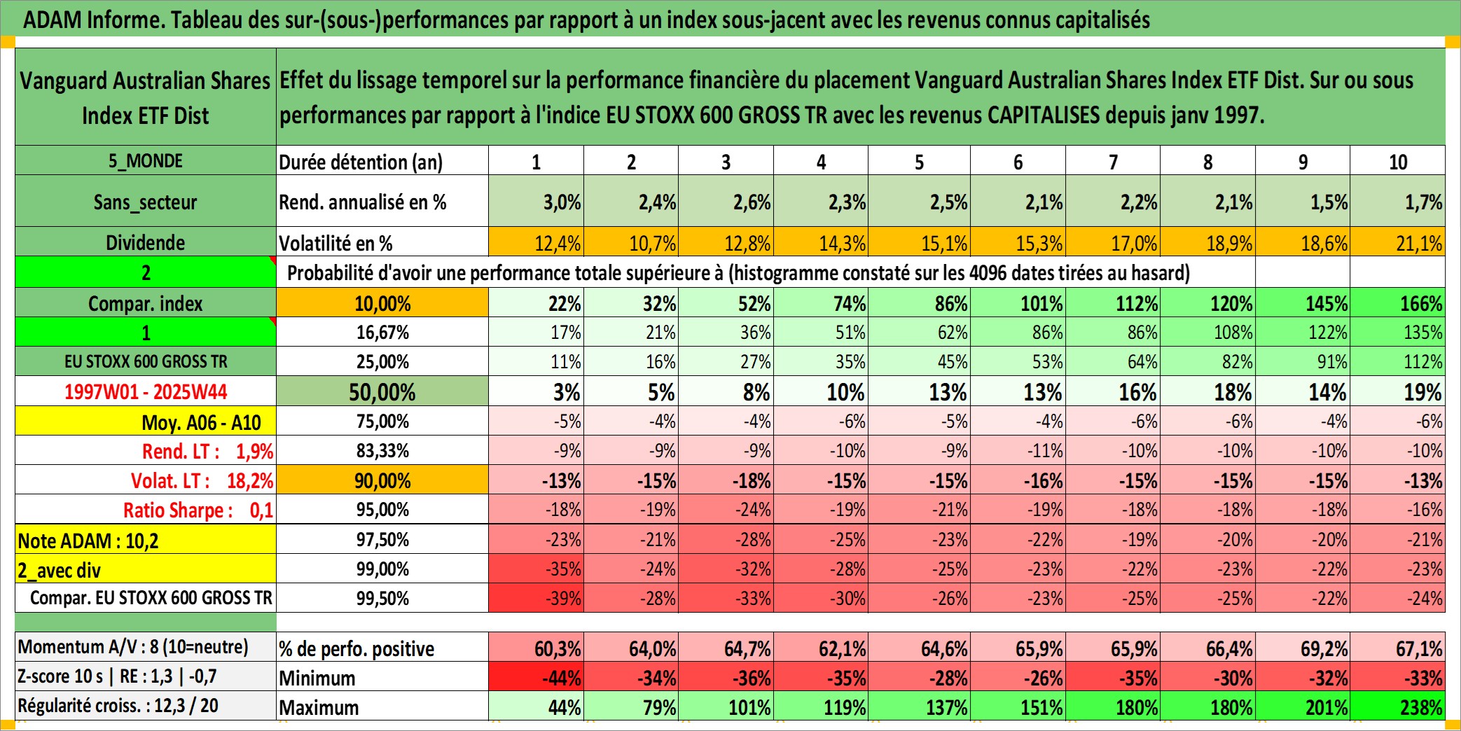 Site dédié aux investisseursPage dédiée sur site financeAnalyse des valorisations hebdomadaires du fonds Vanguard Australian Shares Index ETF Dist. Cet actif est cote en AUD. Les valorisations sont en contrevaleur EURO et couvrent les semaines 1997W01 a 2025W44. Les revenus de cet actif financier sont pris en compte depuis la semaine 1997W01. La note ESG de cet actif n'est pas connue.