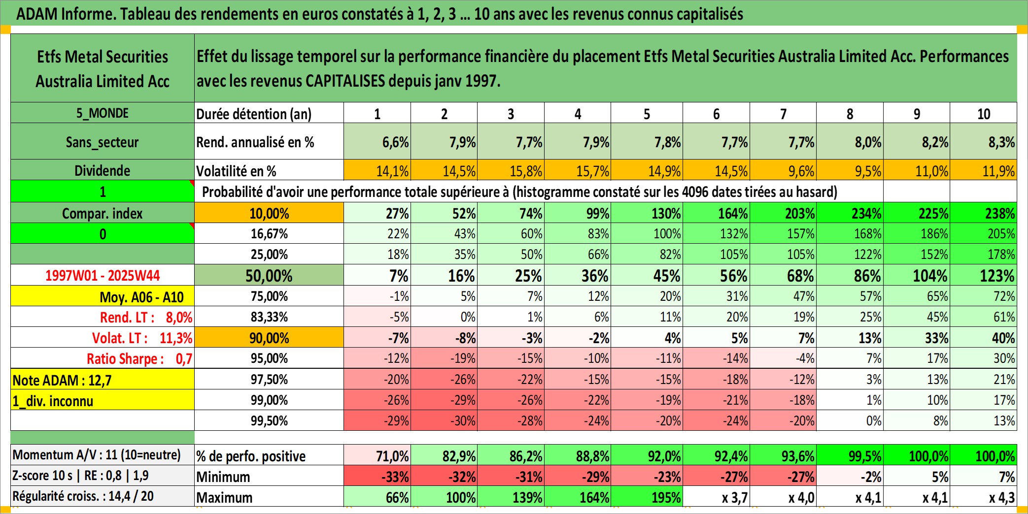 Site dédié aux investisseursPage dédiée sur site financeAnalyse des valorisations hebdomadaires du fonds Etfs Metal Securities Australia Limited Acc. Cet actif est cote en AUD. Les valorisations sont en contrevaleur EURO et couvrent les semaines 1997W01 a 2025W44. Les revenus de cet actif financier sont pris en compte depuis la semaine 1997W01. La note ESG de cet actif n'est pas connue.