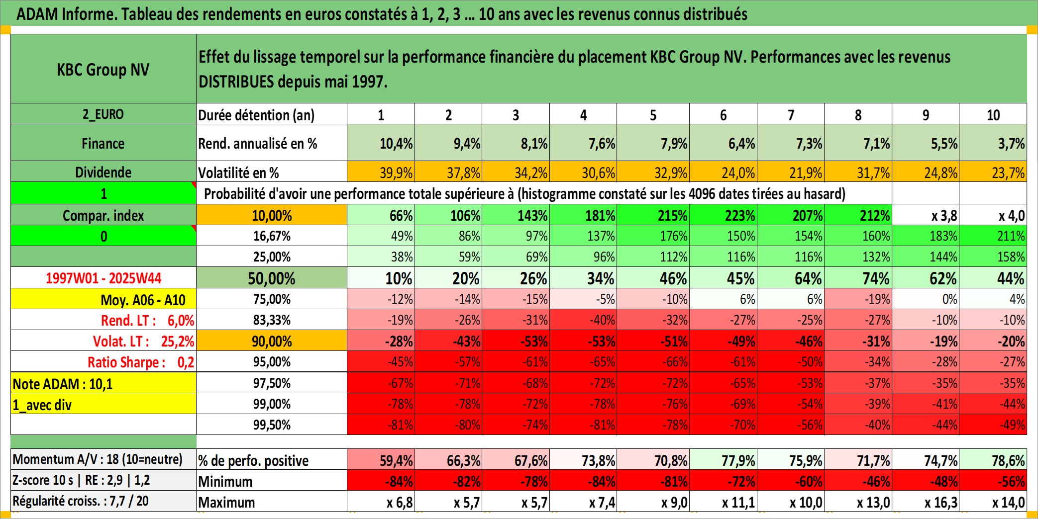 Site dédié aux investisseursPage dédiée sur site financeAnalyse des valorisations hebdomadaires de l'action KBC Group NV. Cet actif est cote en EUR. Les valorisations couvrent les semaines 1997W01 a 2025W44. Les revenus de cet actif financier sont pris en compte depuis la semaine 1997W19. La note globale ESG de cet actif est estimee a 15.0 (apres rebasage entre 0 et 20).