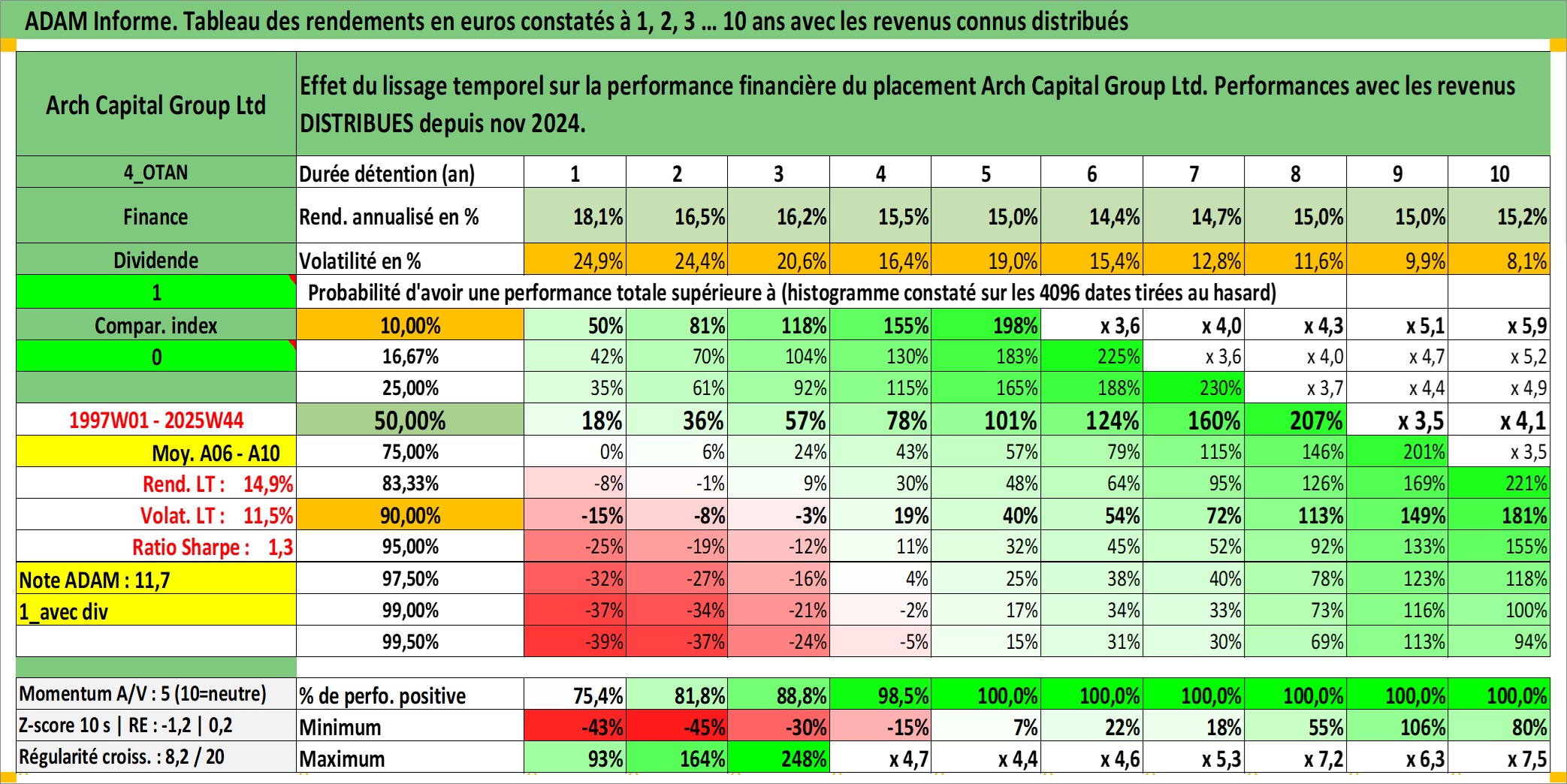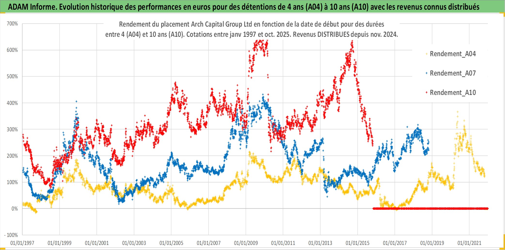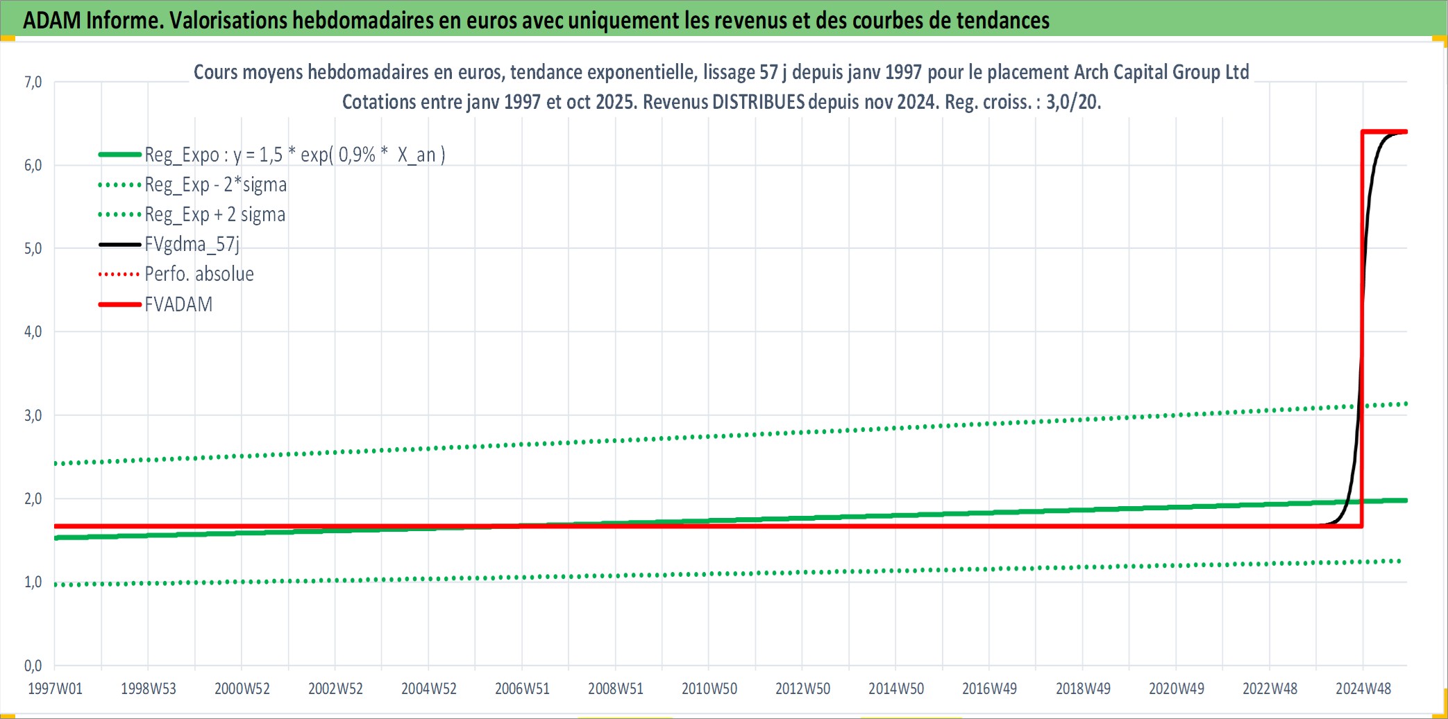 Site dédié aux investisseursPage dédiée sur site financeAnalyse des valorisations hebdomadaires de l'action Arch Capital Group Ltd. Cet actif est cote en USD. Les valorisations sont en contrevaleur EURO et couvrent les semaines 1997W01 a 2025W44. Les revenus de cet actif financier sont pris en compte depuis la semaine 2024W47. La note globale ESG de cet actif est estimee a 10.0 (apres rebasage entre 0 et 20).