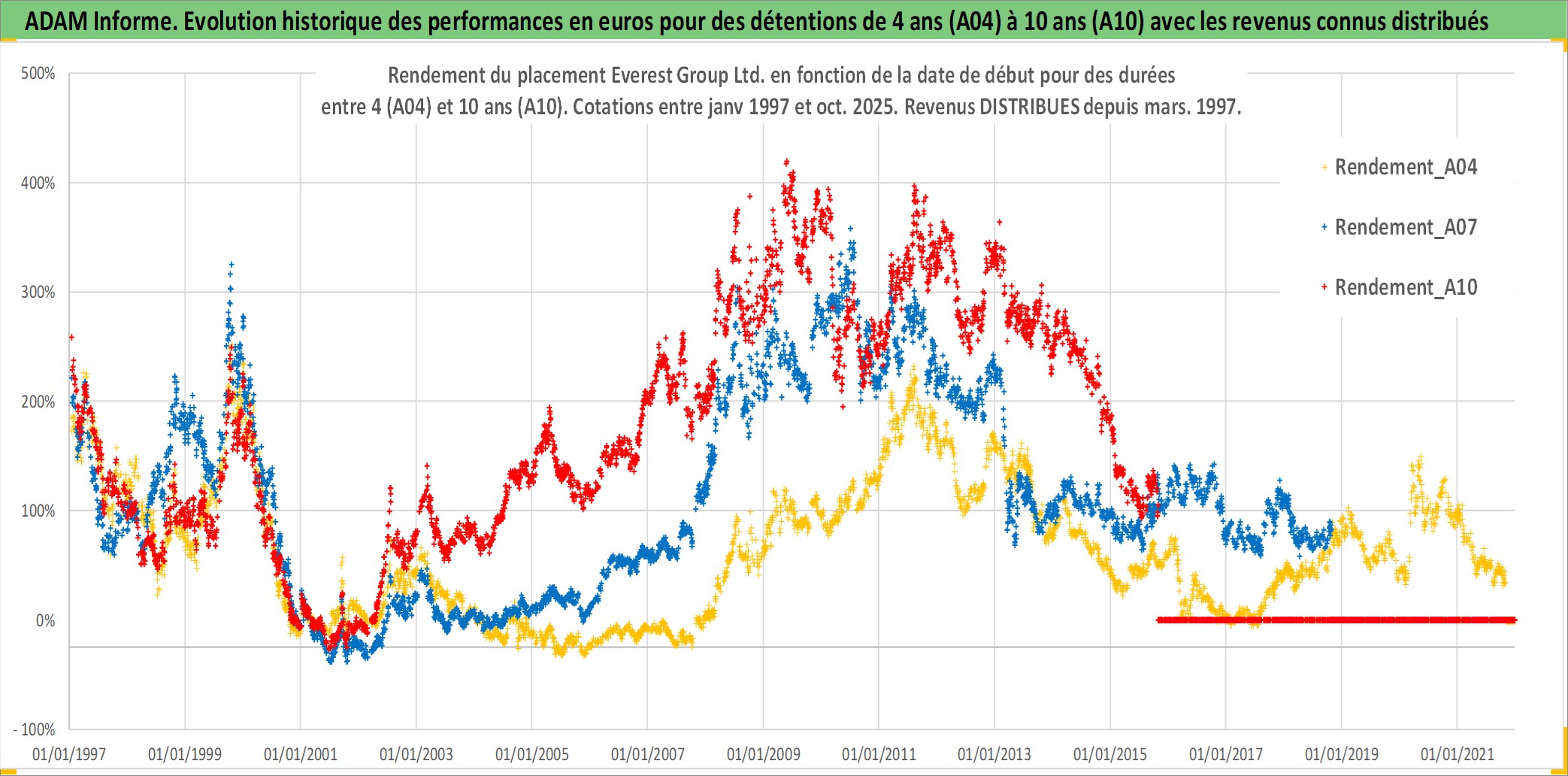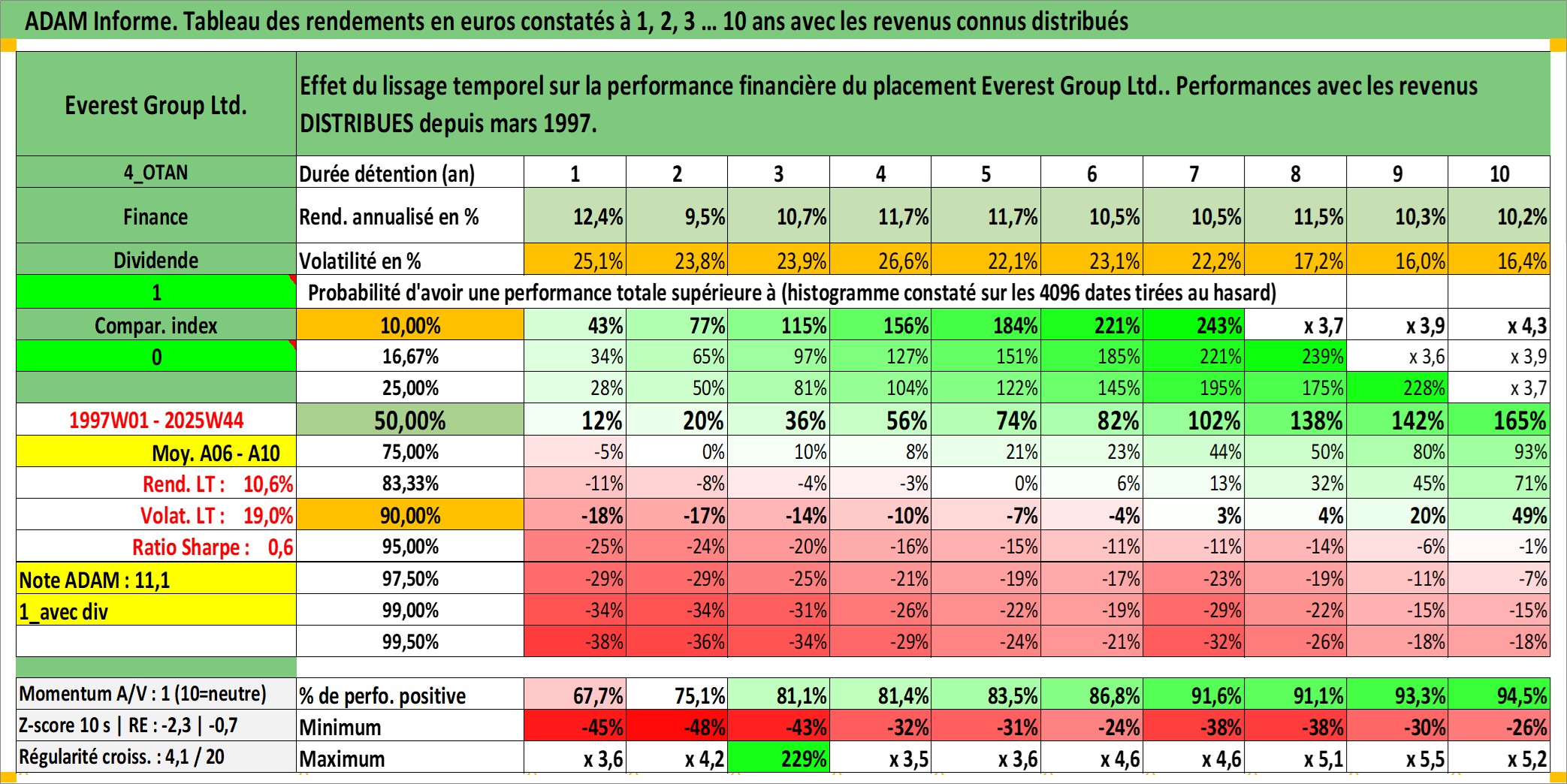 Site dédié aux investisseursPage dédiée sur site financeAnalyse des valorisations hebdomadaires de l'action Everest Group Ltd.. Cet actif est cote en USD. Les valorisations sont en contrevaleur EURO et couvrent les semaines 1997W01 a 2025W44. Les revenus de cet actif financier sont pris en compte depuis la semaine 1997W10. La note ESG de cet actif n'est pas connue.