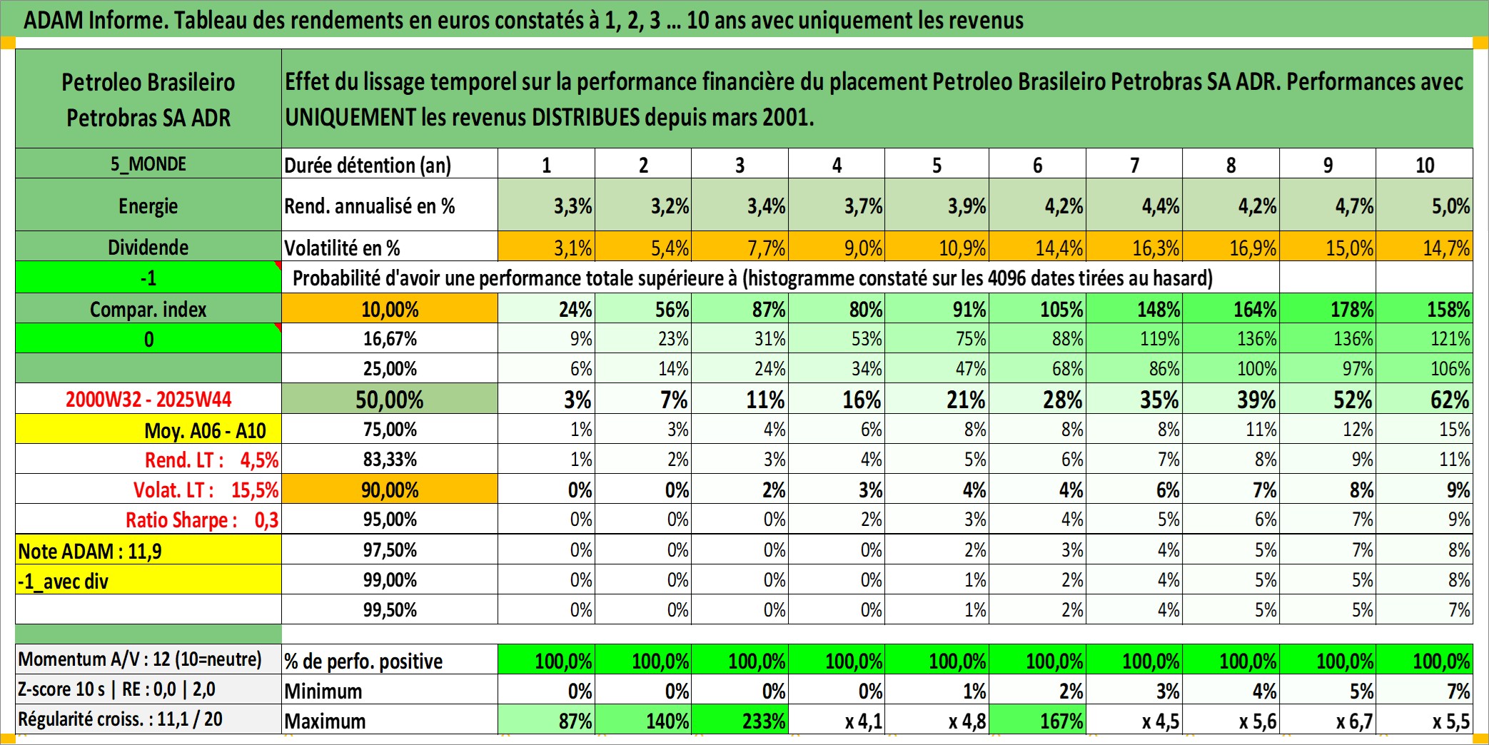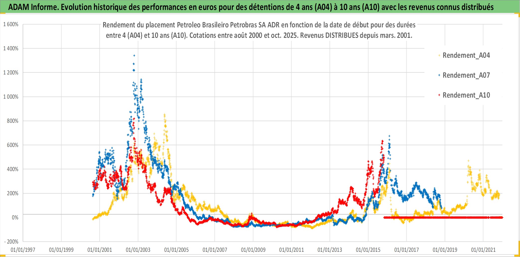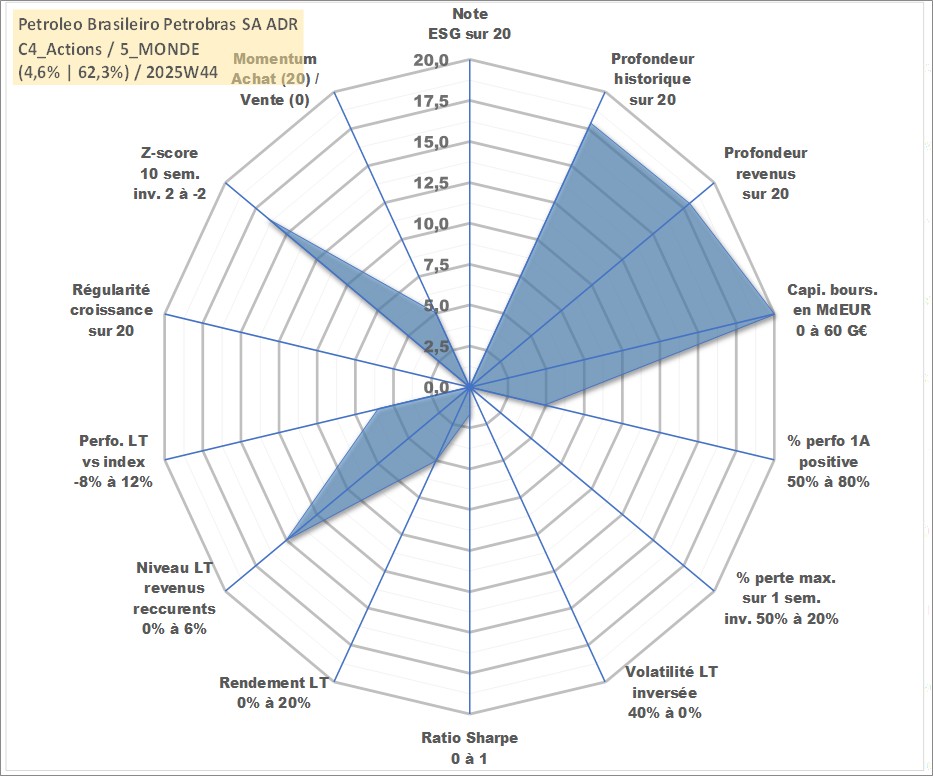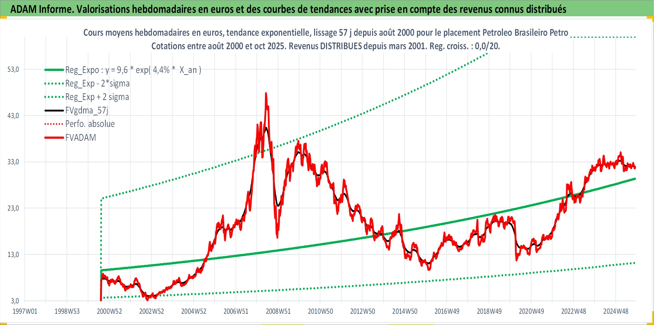 Site dédié aux investisseursPage dédiée sur site financeAnalyse des valorisations hebdomadaires de l'action Petroleo Brasileiro Petrobras SA ADR. Cet actif est cote en USD. Les valorisations sont en contrevaleur EURO et couvrent les semaines 2000W32 a 2025W44. Les revenus de cet actif financier sont pris en compte depuis la semaine 2001W12. La note ESG de cet actif n'est pas connue.