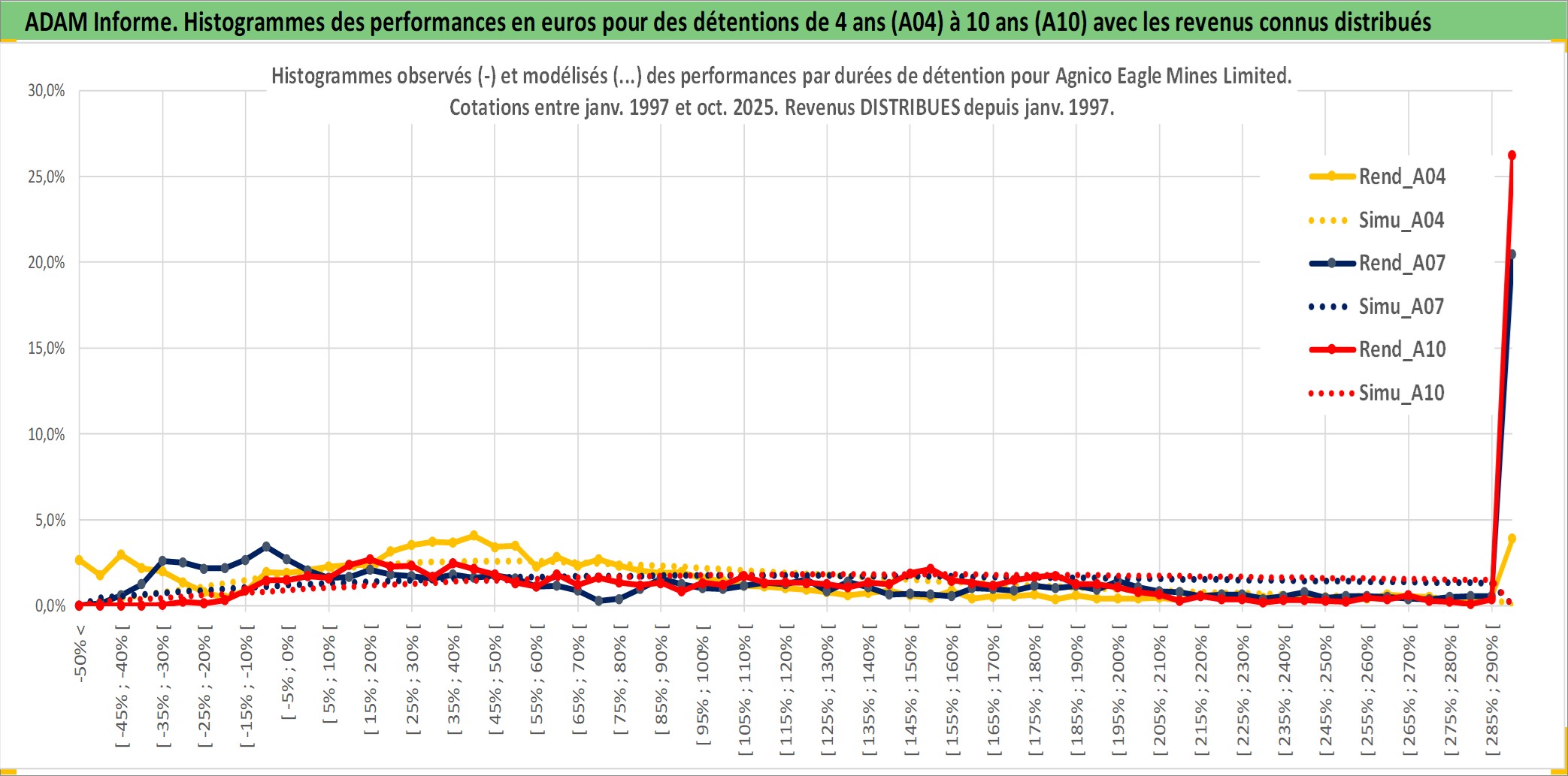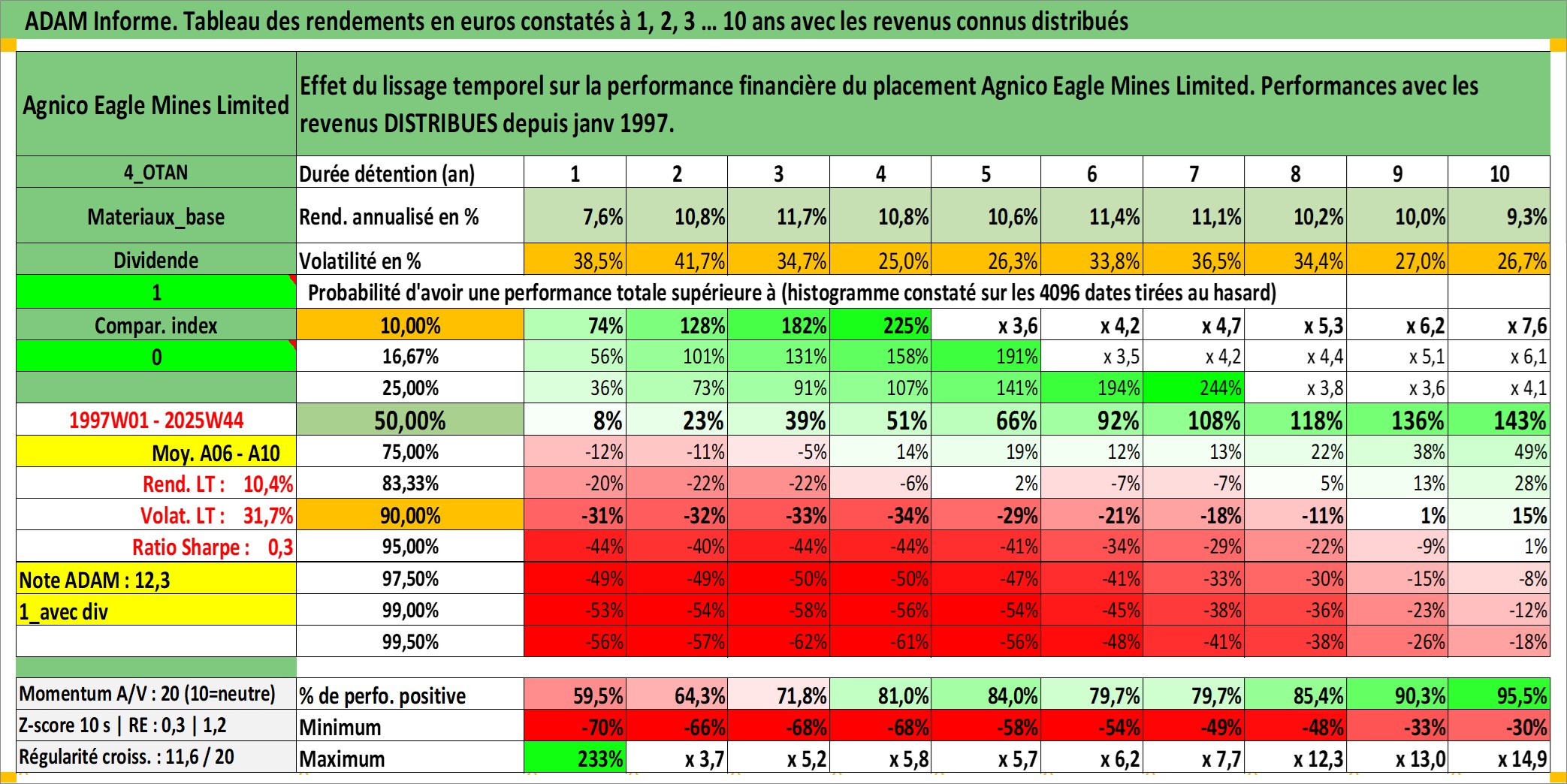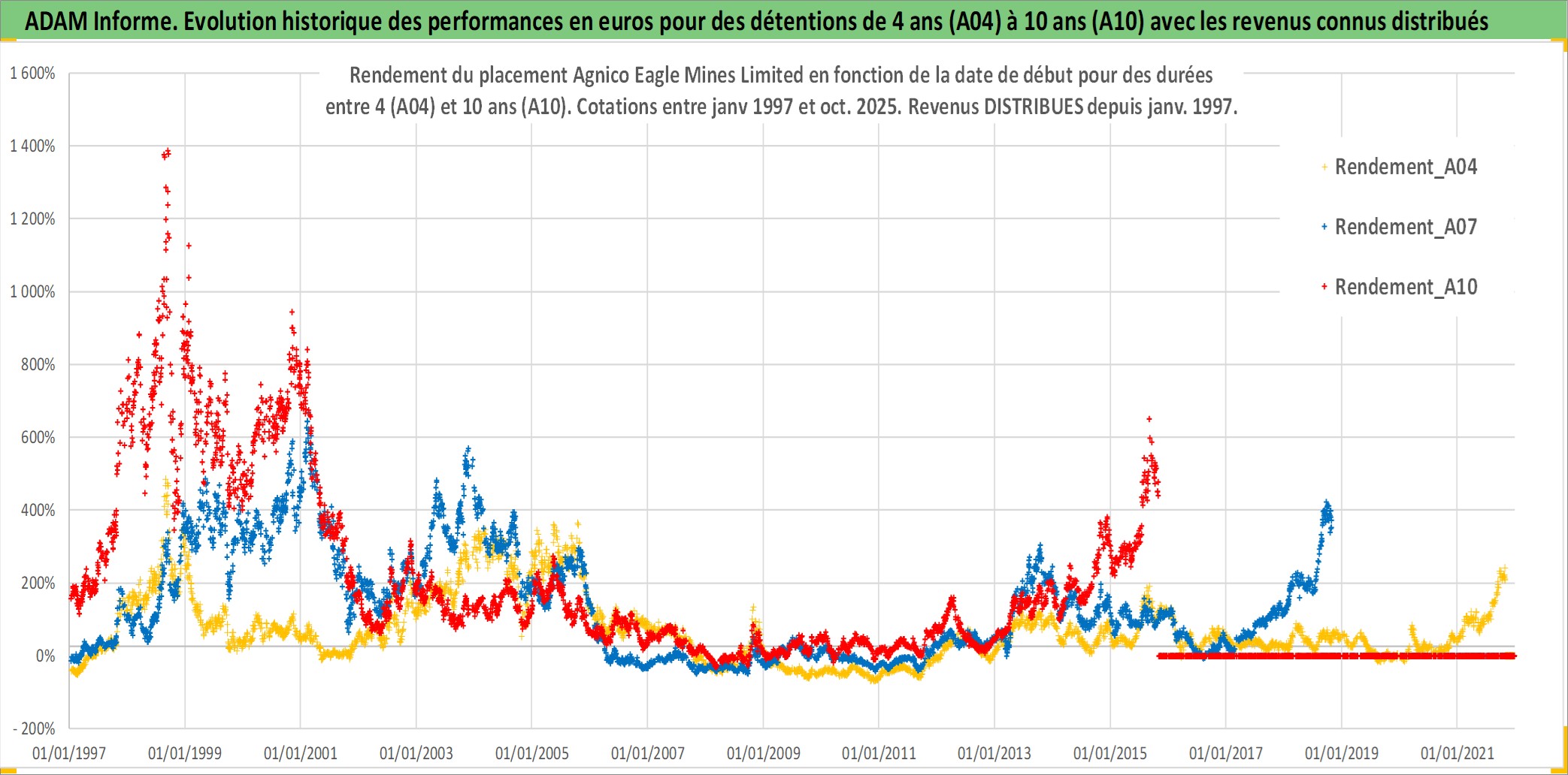 Site dédié aux investisseursPage dédiée sur site financeAnalyse des valorisations hebdomadaires de l'action Agnico Eagle Mines Limited. Cet actif est cote en CAD. Les valorisations sont en contrevaleur EURO et couvrent les semaines 1997W01 a 2025W44. Les revenus de cet actif financier sont pris en compte depuis la semaine 1997W01. La note globale ESG de cet actif est estimee a 9.0 (apres rebasage entre 0 et 20).