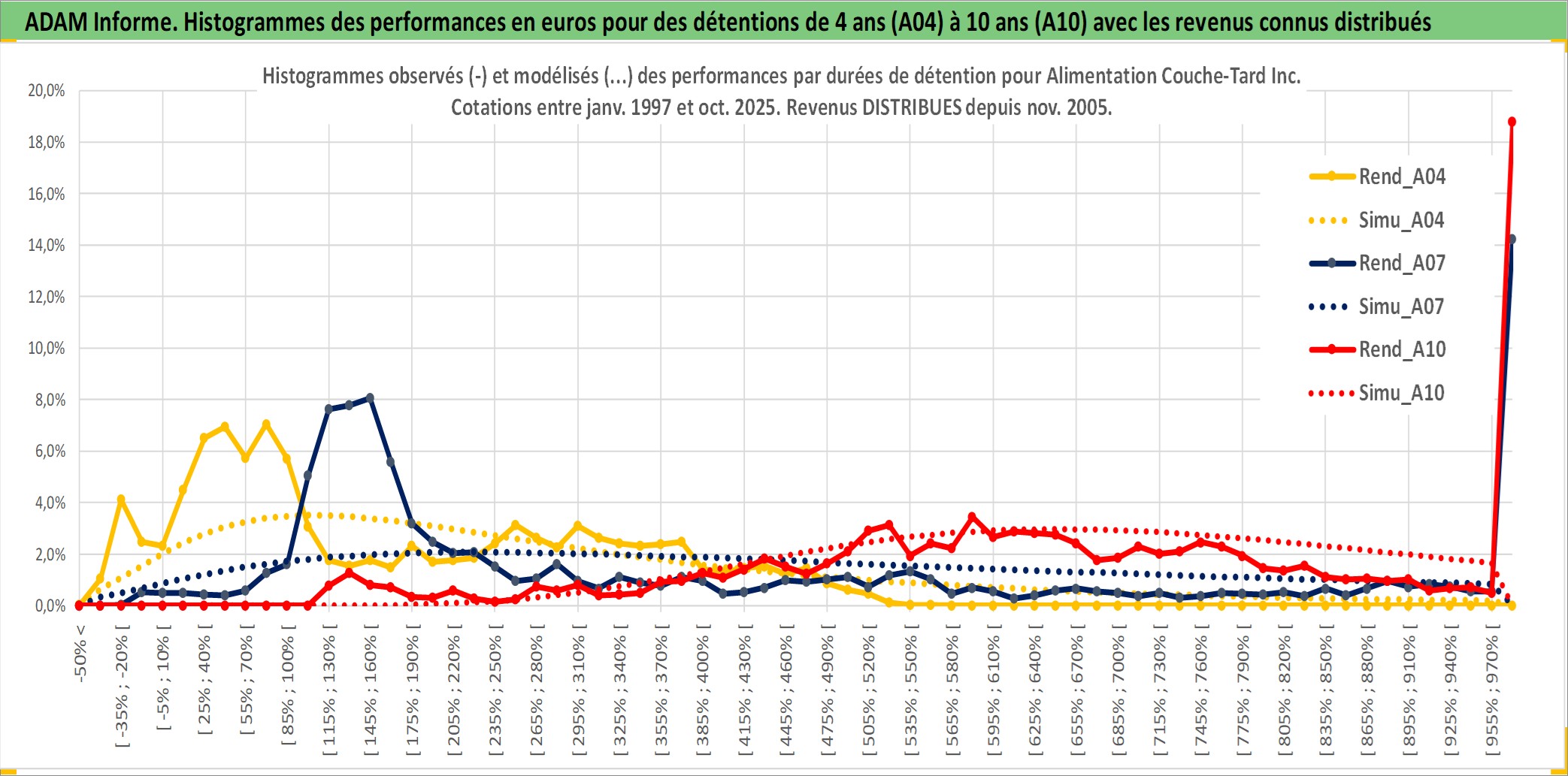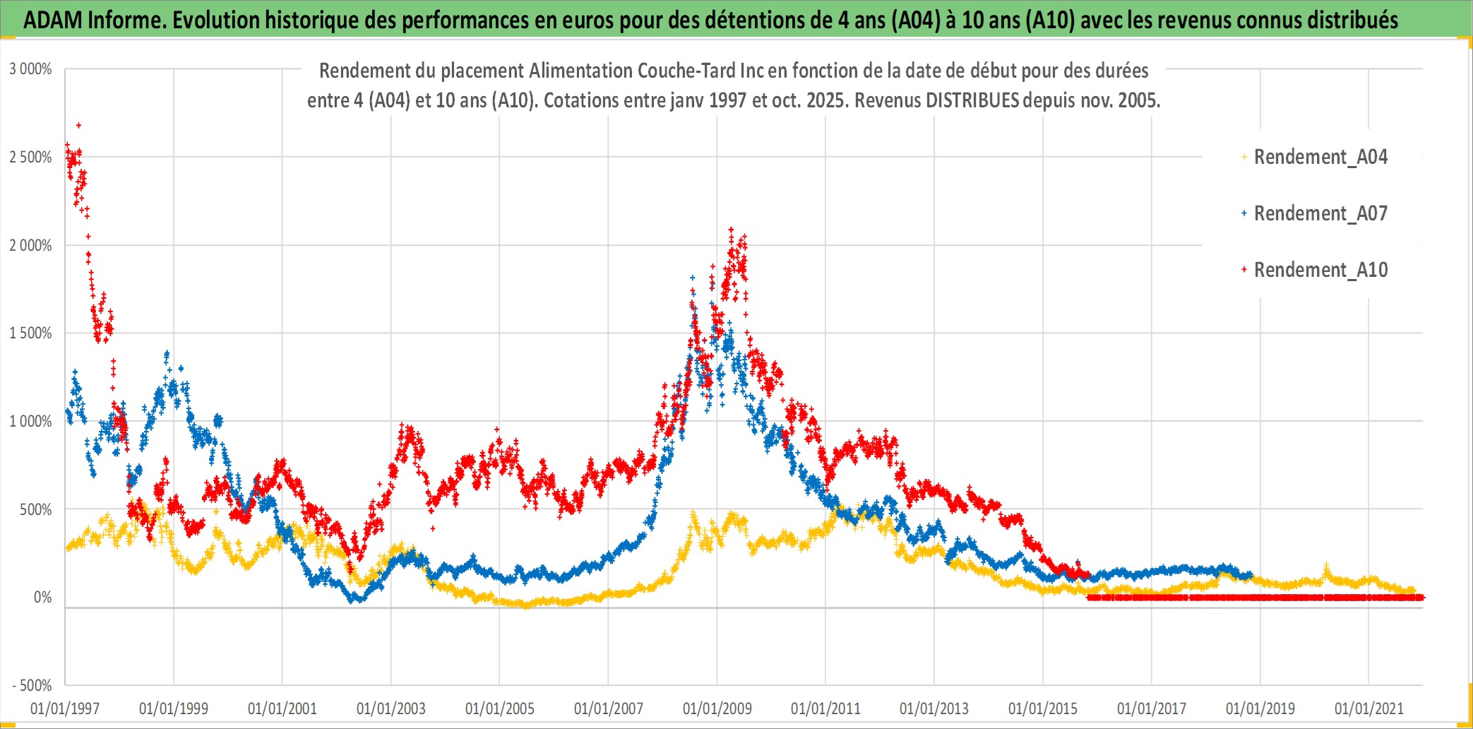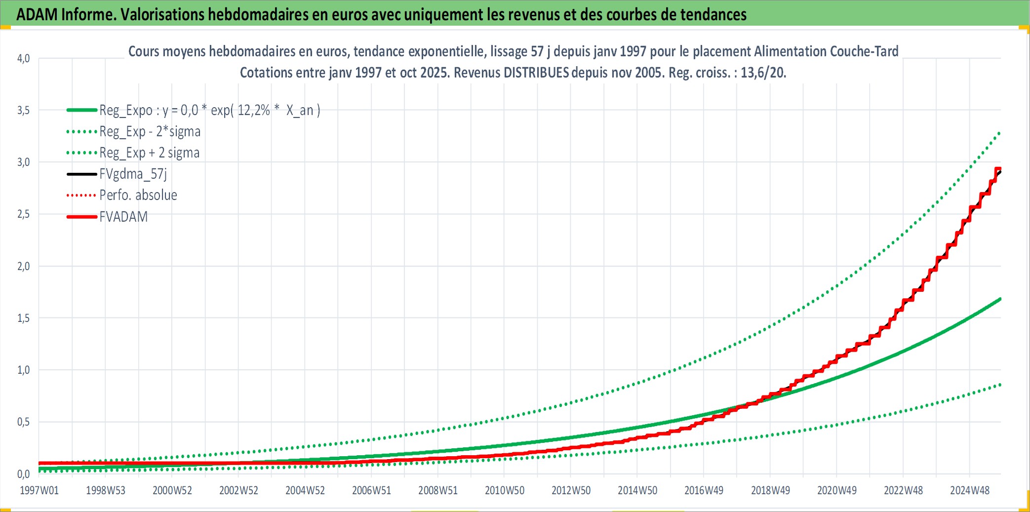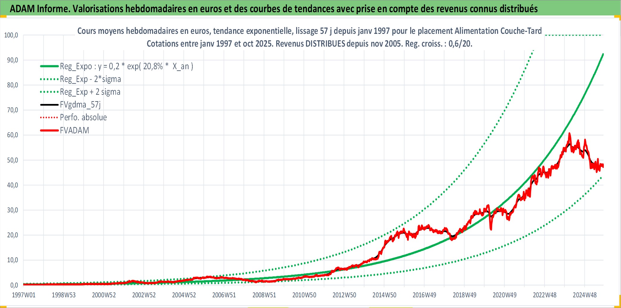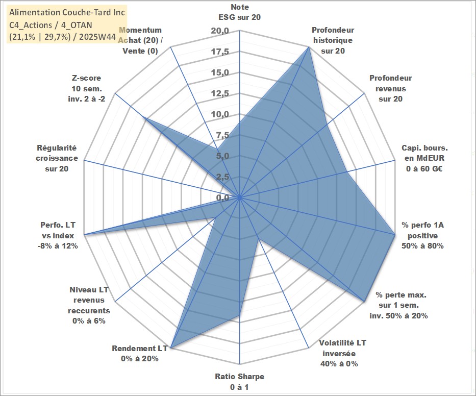 Site dédié aux investisseursPage dédiée sur site financeAnalyse des valorisations hebdomadaires de l'action Alimentation Couche-Tard Inc. Cet actif est cote en CAD. Les valorisations sont en contrevaleur EURO et couvrent les semaines 1997W01 a 2025W44. Les revenus de cet actif financier sont pris en compte depuis la semaine 2005W47. La note globale ESG de cet actif est estimee a 9.0 (apres rebasage entre 0 et 20).