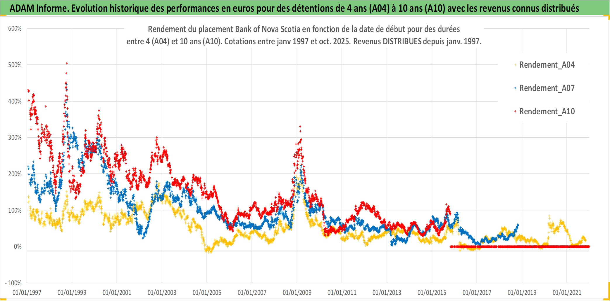 Site dédié aux investisseursPage dédiée sur site financeAnalyse des valorisations hebdomadaires de l'action Bank of Nova Scotia. Cet actif est cote en CAD. Les valorisations sont en contrevaleur EURO et couvrent les semaines 1997W01 a 2025W44. Les revenus de cet actif financier sont pris en compte depuis la semaine 1997W01. La note globale ESG de cet actif est estimee a 10.0 (apres rebasage entre 0 et 20).