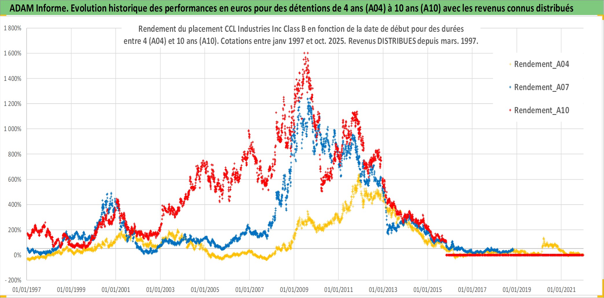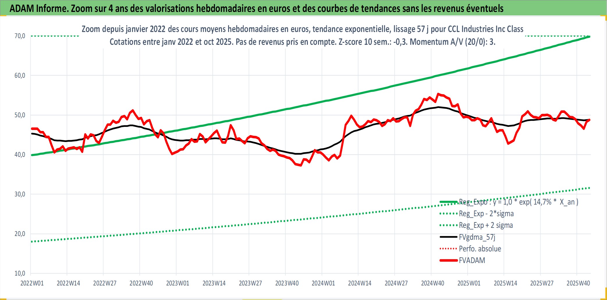 Site dédié aux investisseursPage dédiée sur site financeAnalyse des valorisations hebdomadaires de l'action CCL Industries Inc Class B. Cet actif est cote en CAD. Les valorisations sont en contrevaleur EURO et couvrent les semaines 1997W01 a 2025W44. Les revenus de cet actif financier sont pris en compte depuis la semaine 1997W11. La note globale ESG de cet actif est estimee a 11.0 (apres rebasage entre 0 et 20).