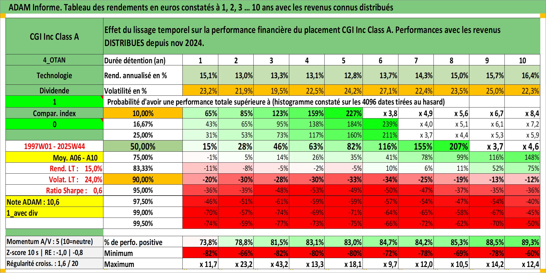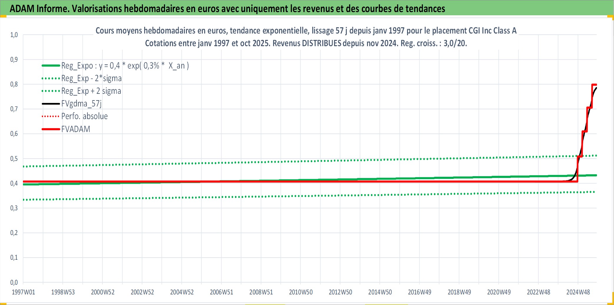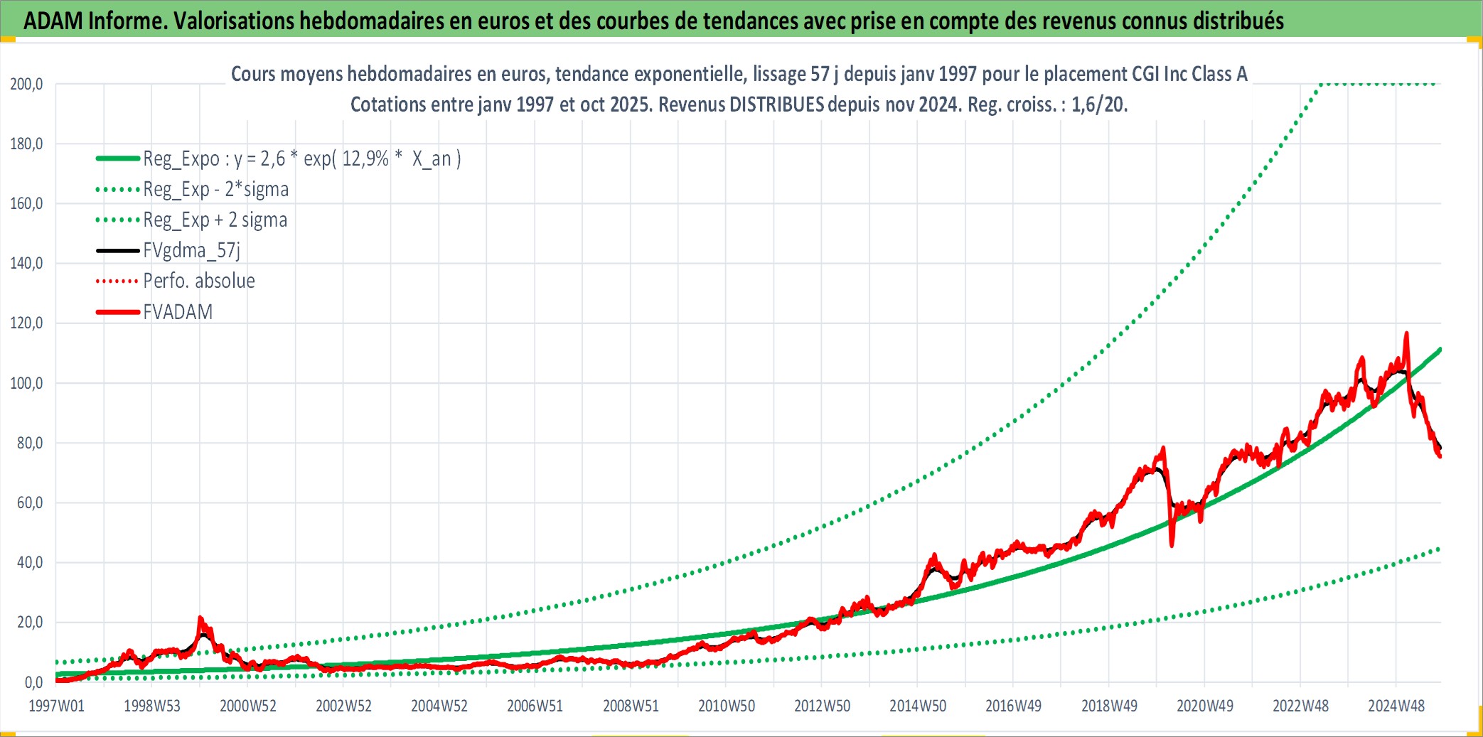 Site dédié aux investisseursPage dédiée sur site financeAnalyse des valorisations hebdomadaires de l'action CGI Inc Class A. Cet actif est cote en CAD. Les valorisations sont en contrevaleur EURO et couvrent les semaines 1997W01 a 2025W44. Les revenus de cet actif financier sont pris en compte depuis la semaine 2024W47. La note globale ESG de cet actif est estimee a 13.0 (apres rebasage entre 0 et 20).
