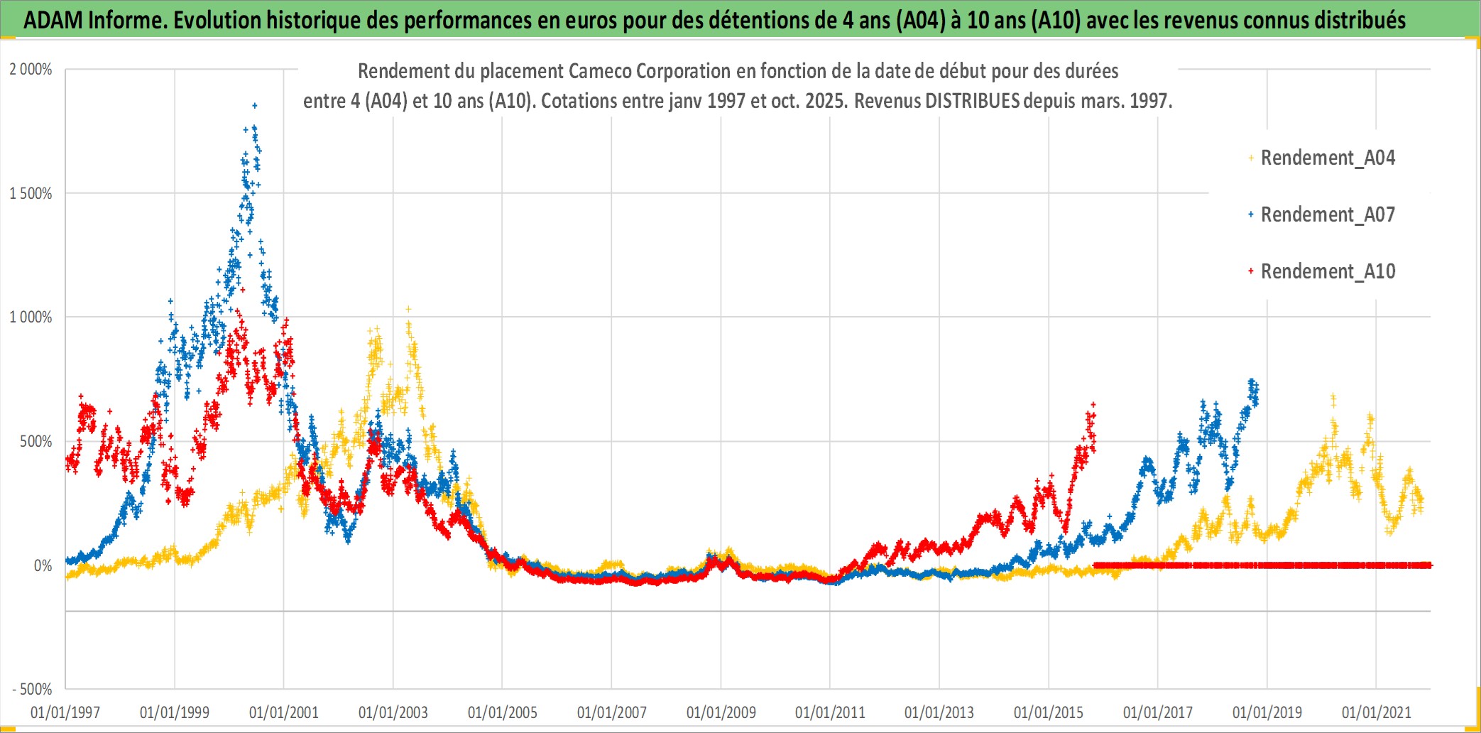 Site dédié aux investisseursPage dédiée sur site financeAnalyse des valorisations hebdomadaires de l'action Cameco Corporation. Cet actif est cote en CAD. Les valorisations sont en contrevaleur EURO et couvrent les semaines 1997W01 a 2025W44. Les revenus de cet actif financier sont pris en compte depuis la semaine 1997W13. La note ESG de cet actif n'est pas connue.