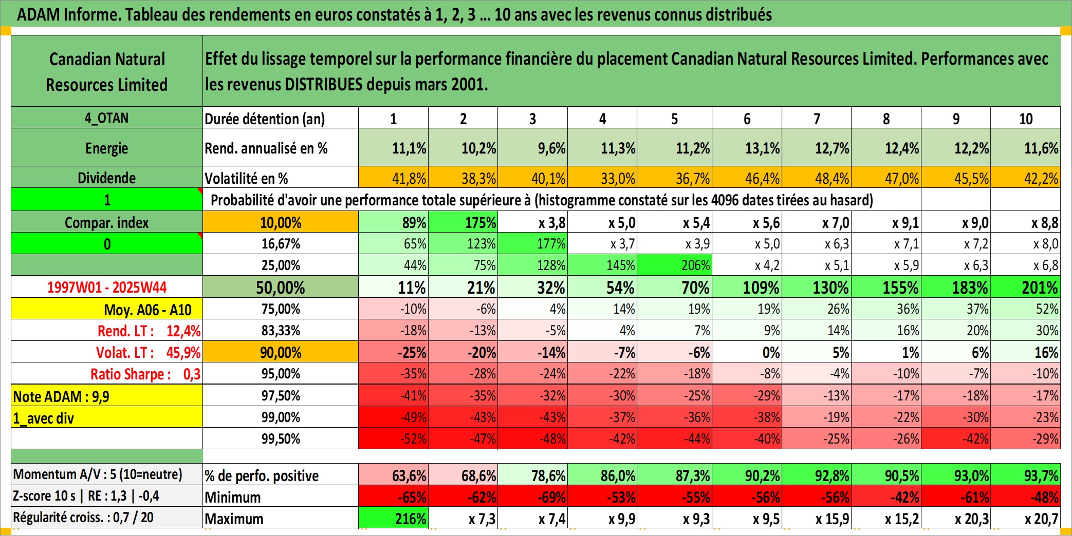 Site dédié aux investisseursPage dédiée sur site financeAnalyse des valorisations hebdomadaires de l'action Canadian Natural Resources Limited. Cet actif est cote en CAD. Les valorisations sont en contrevaleur EURO et couvrent les semaines 1997W01 a 2025W44. Les revenus de cet actif financier sont pris en compte depuis la semaine 2001W11. La note globale ESG de cet actif est estimee a 4.0 (apres rebasage entre 0 et 20).
