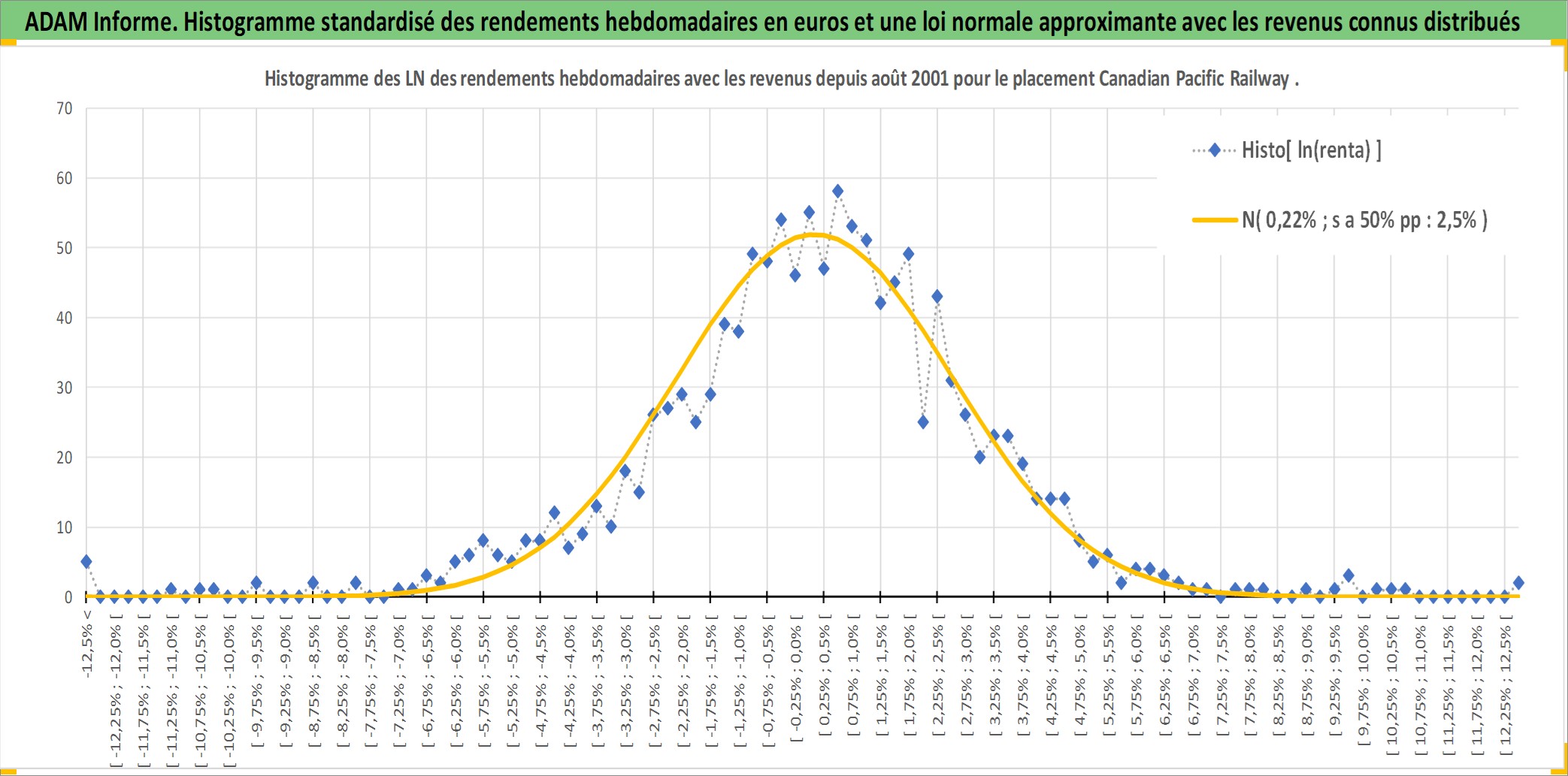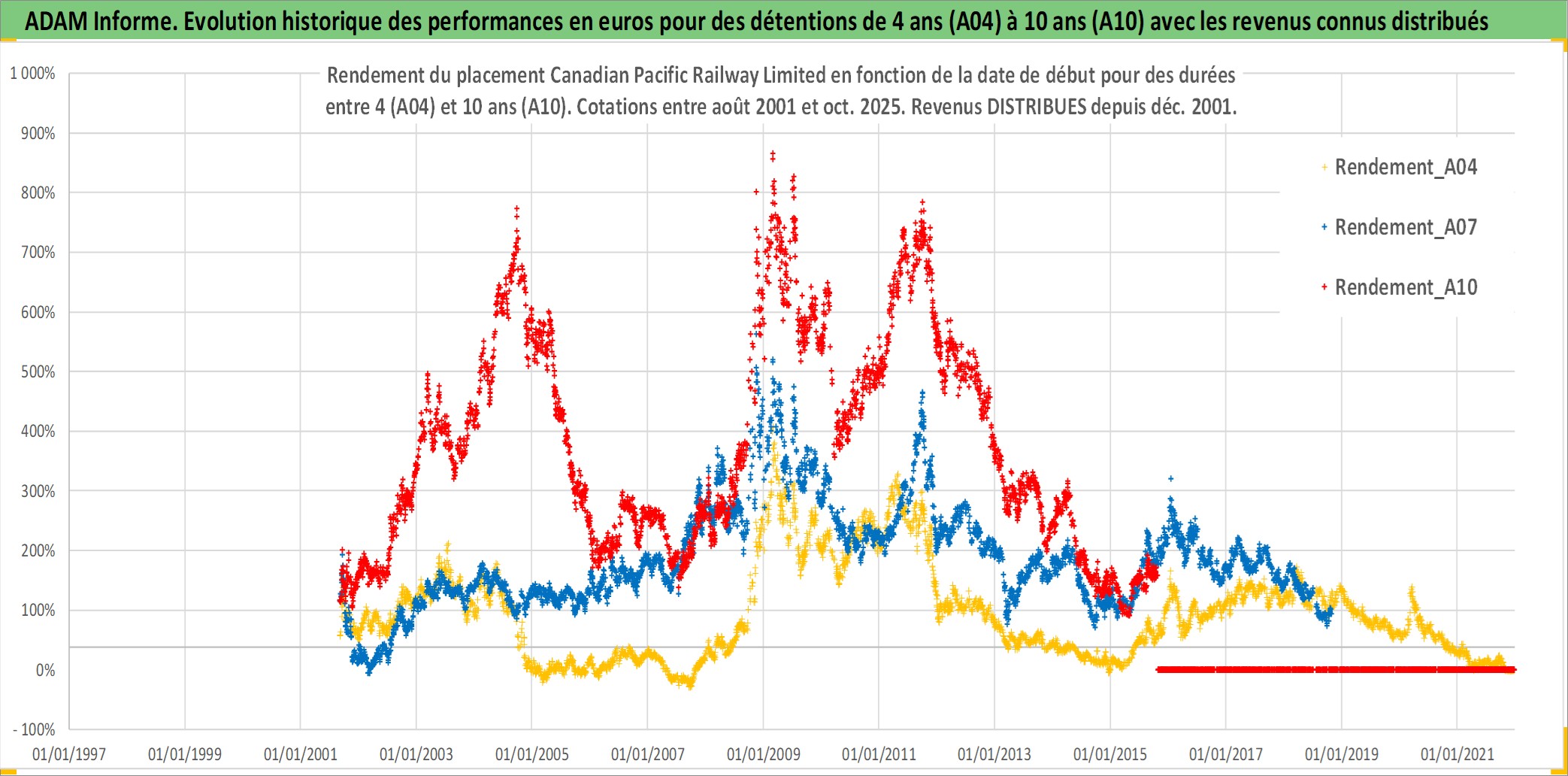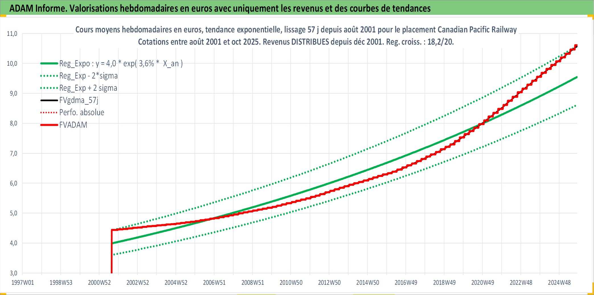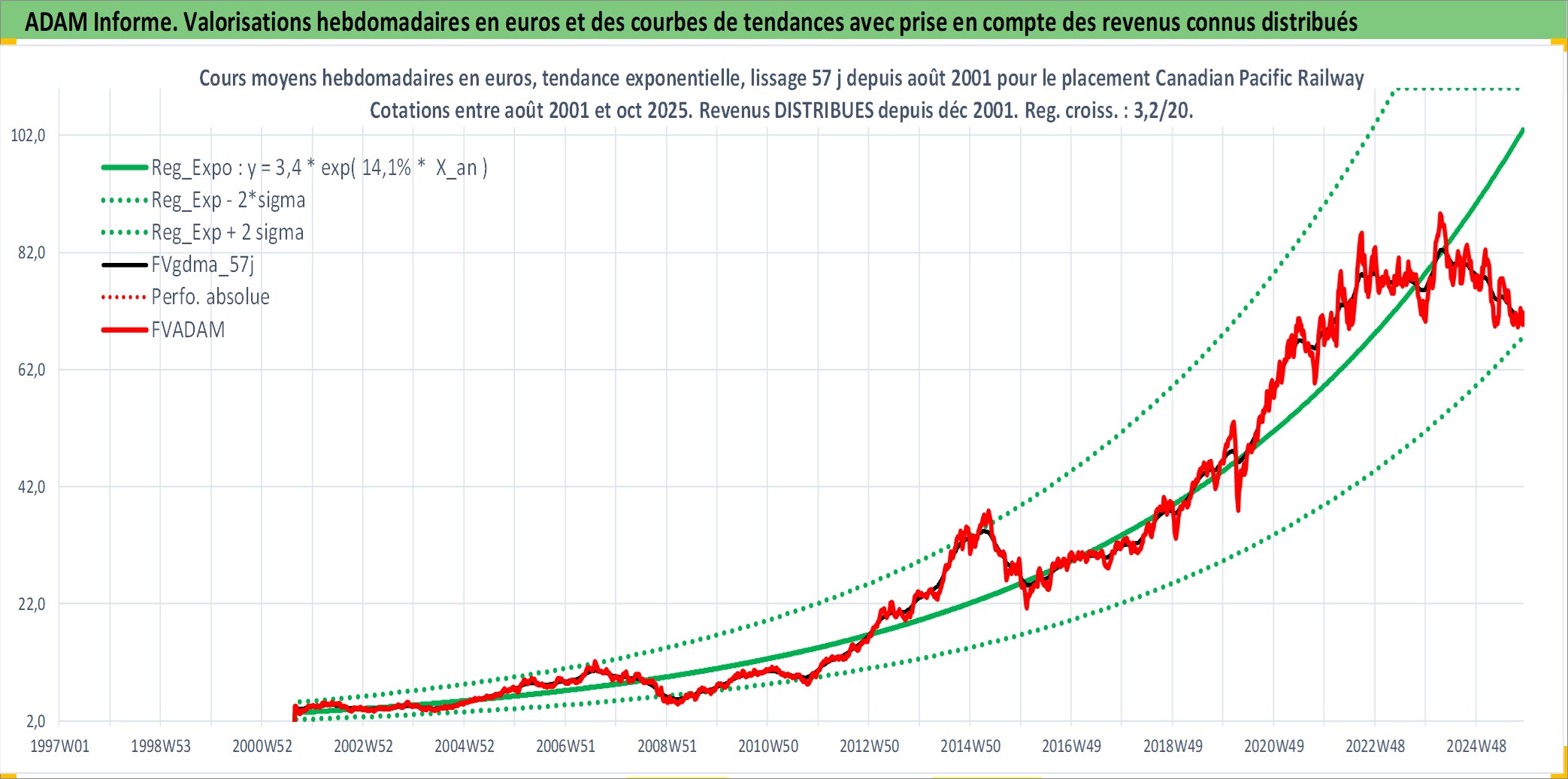 Site dédié aux investisseursPage dédiée sur site financeAnalyse des valorisations hebdomadaires de l'action Canadian Pacific Railway Limited. Cet actif est cote en CAD. Les valorisations sont en contrevaleur EURO et couvrent les semaines 2001W34 a 2025W44. Les revenus de cet actif financier sont pris en compte depuis la semaine 2001W51. La note globale ESG de cet actif est estimee a 12.0 (apres rebasage entre 0 et 20).