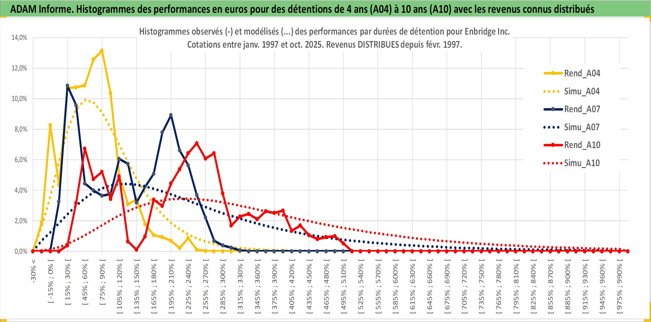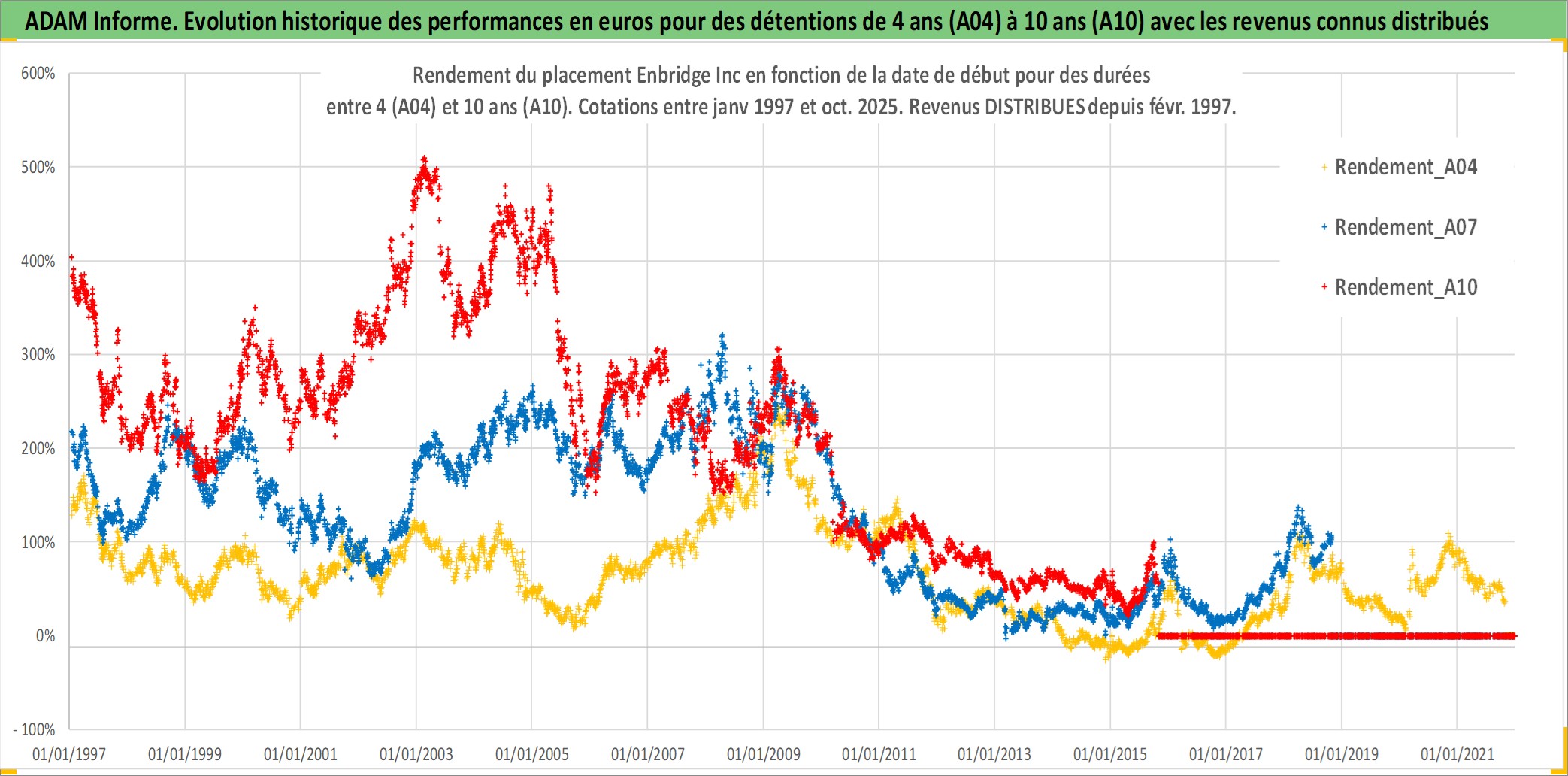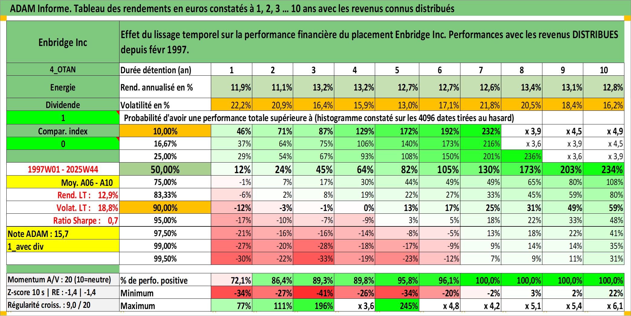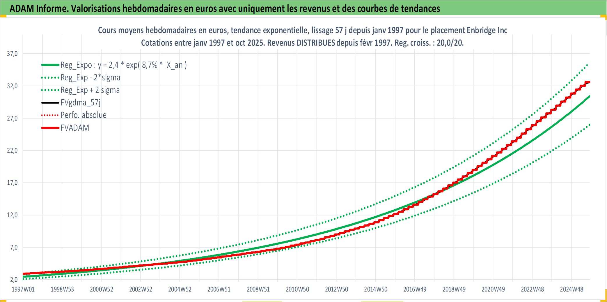 Site dédié aux investisseursPage dédiée sur site financeAnalyse des valorisations hebdomadaires de l'action Enbridge Inc. Cet actif est cote en CAD. Les valorisations sont en contrevaleur EURO et couvrent les semaines 1997W01 a 2025W44. Les revenus de cet actif financier sont pris en compte depuis la semaine 1997W07. La note globale ESG de cet actif est estimee a 9.0 (apres rebasage entre 0 et 20).