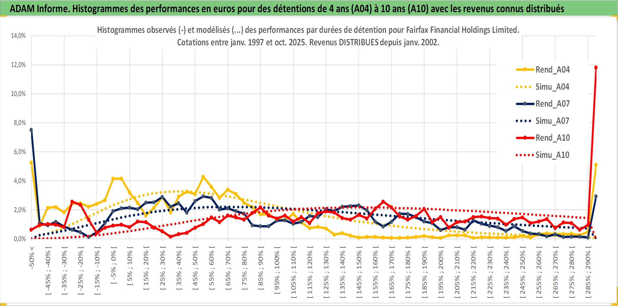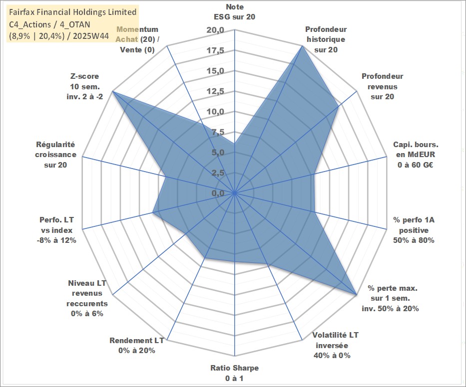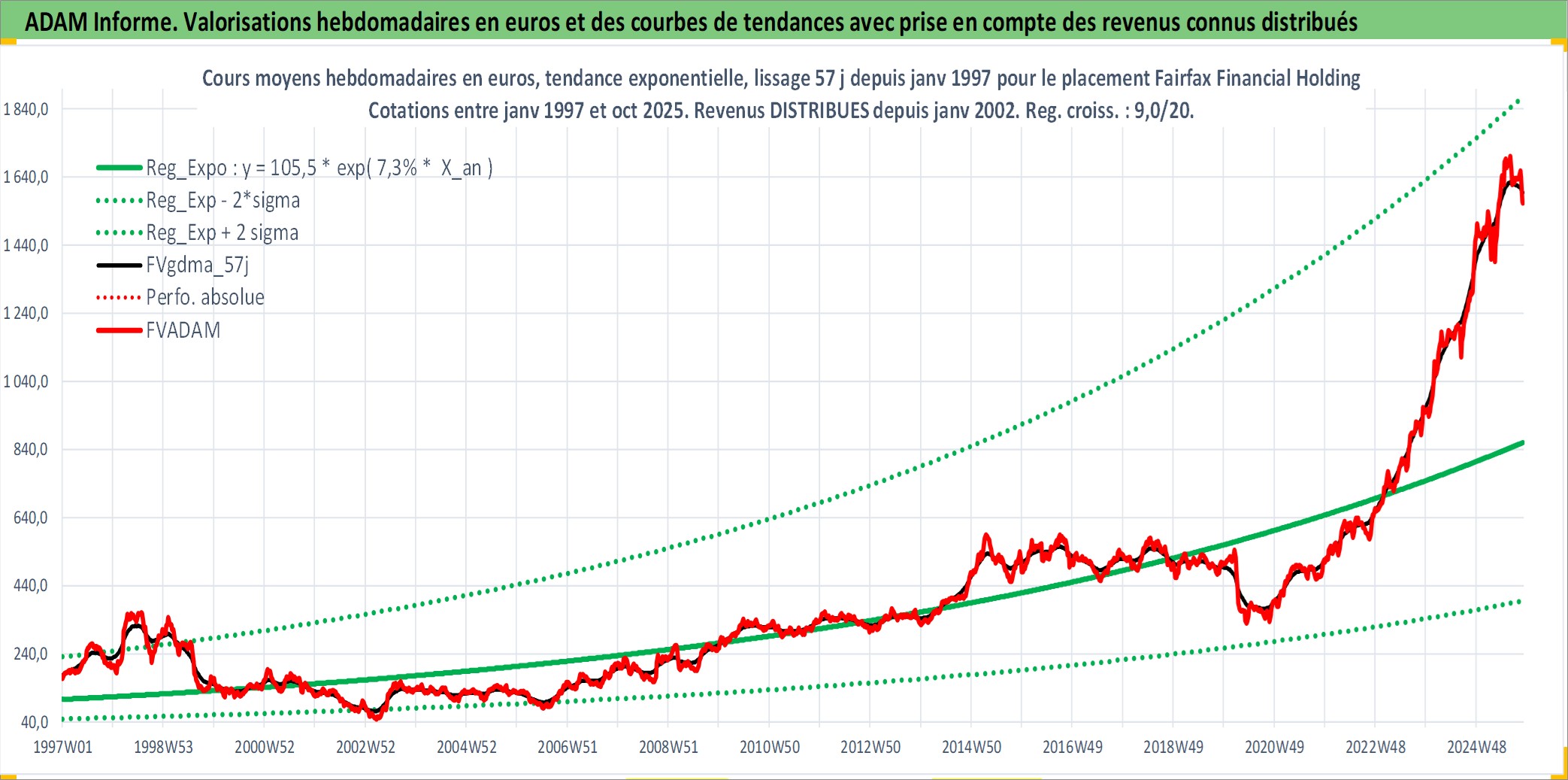 Site dédié aux investisseursPage dédiée sur site financeAnalyse des valorisations hebdomadaires de l'action Fairfax Financial Holdings Limited. Cet actif est cote en CAD. Les valorisations sont en contrevaleur EURO et couvrent les semaines 1997W01 a 2025W44. Les revenus de cet actif financier sont pris en compte depuis la semaine 2002W02. La note globale ESG de cet actif est estimee a 6.0 (apres rebasage entre 0 et 20).