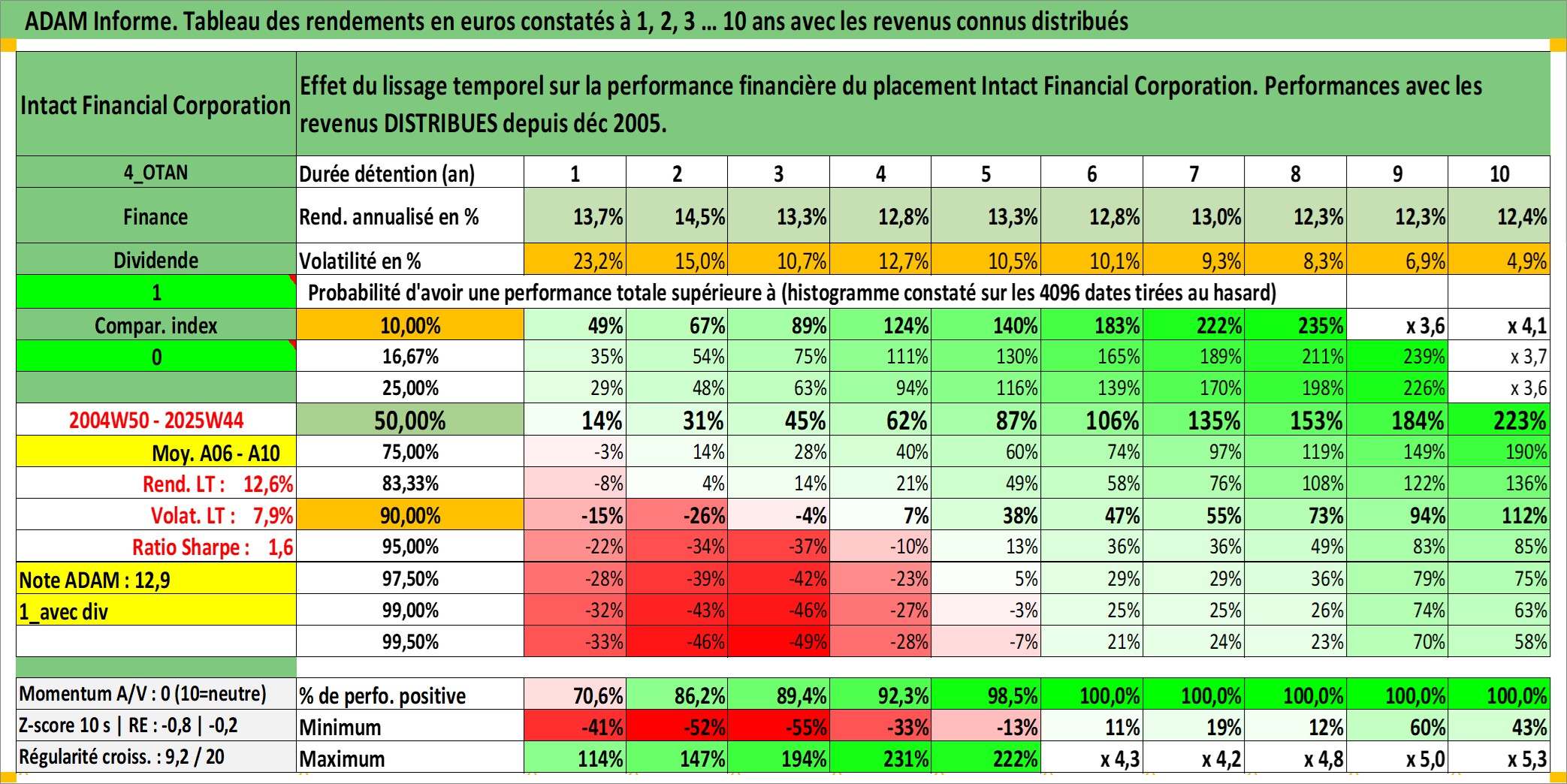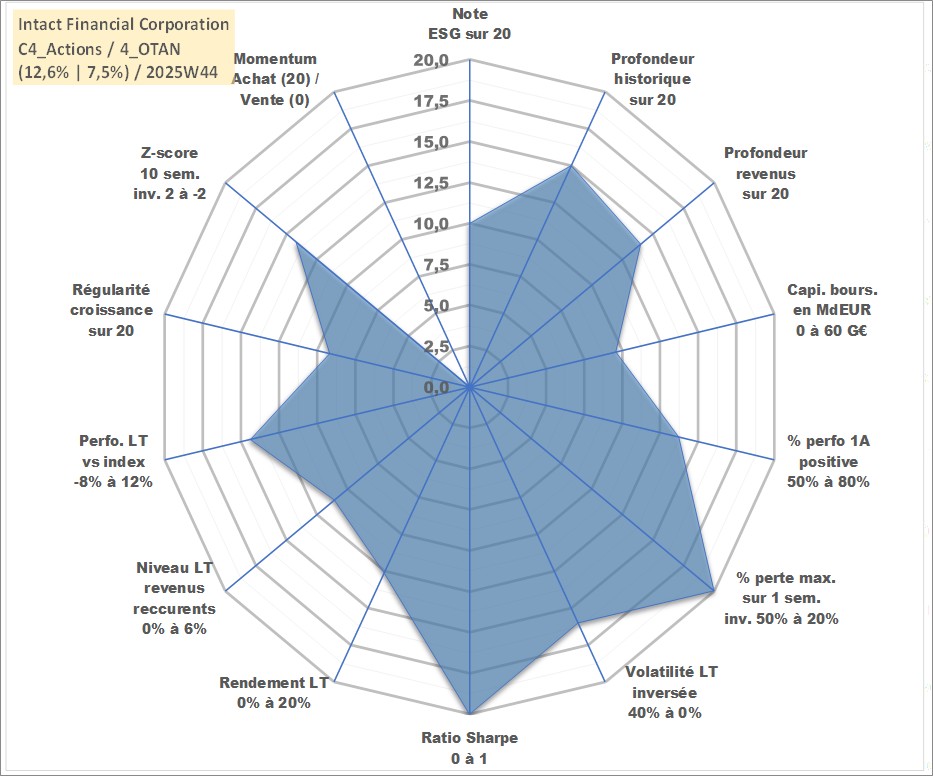Site dédié aux investisseursPage dédiée sur site financeAnalyse des valorisations hebdomadaires de l'action Intact Financial Corporation. Cet actif est cote en CAD. Les valorisations sont en contrevaleur EURO et couvrent les semaines 2004W50 a 2025W44. Les revenus de cet actif financier sont pris en compte depuis la semaine 2005W50. La note globale ESG de cet actif est estimee a 10.0 (apres rebasage entre 0 et 20).