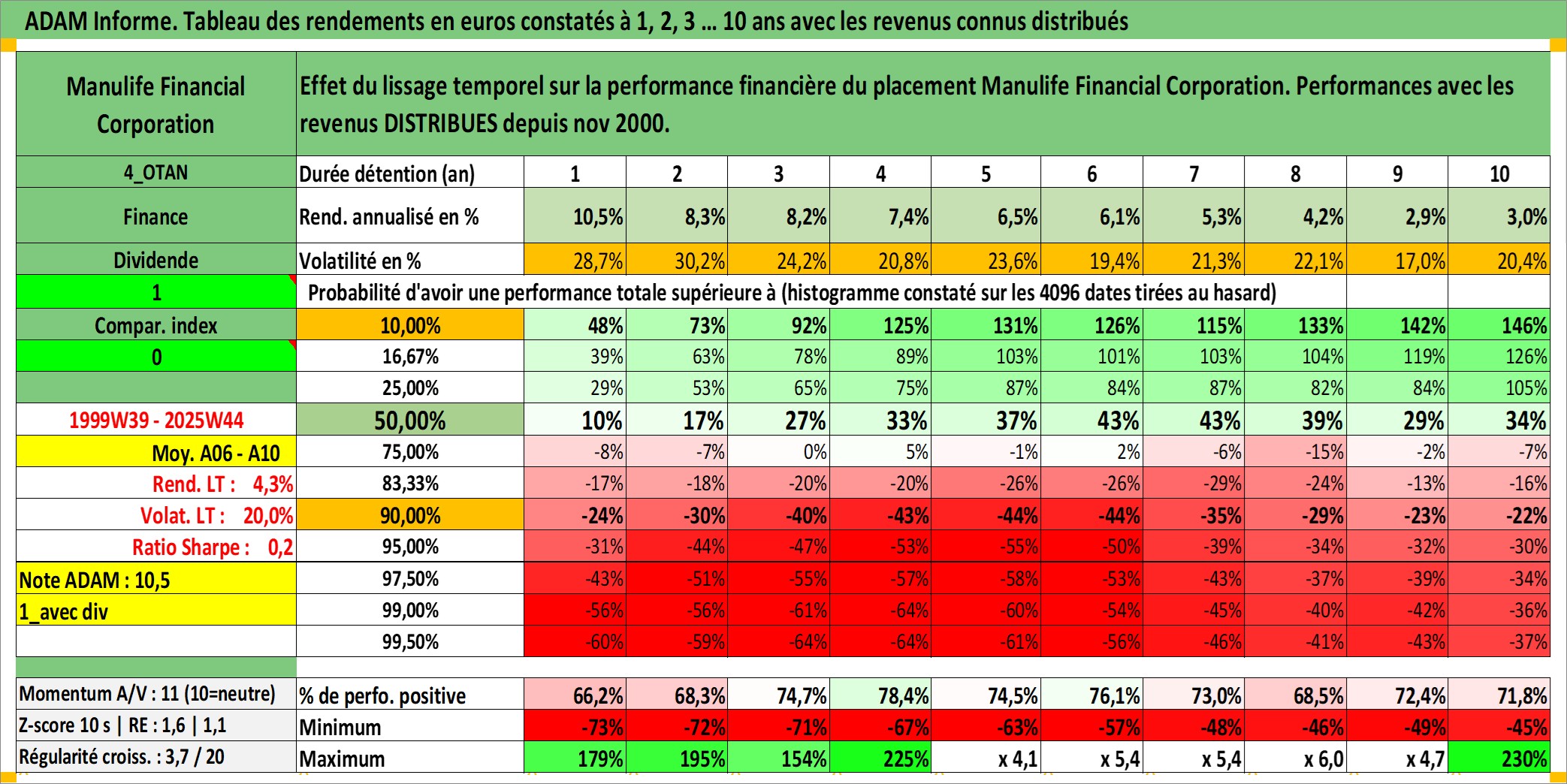 Site dédié aux investisseursPage dédiée sur site financeAnalyse des valorisations hebdomadaires de l'action Manulife Financial Corporation. Cet actif est cote en CAD. Les valorisations sont en contrevaleur EURO et couvrent les semaines 1999W39 a 2025W44. Les revenus de cet actif financier sont pris en compte depuis la semaine 2000W46. La note globale ESG de cet actif est estimee a 12.0 (apres rebasage entre 0 et 20).