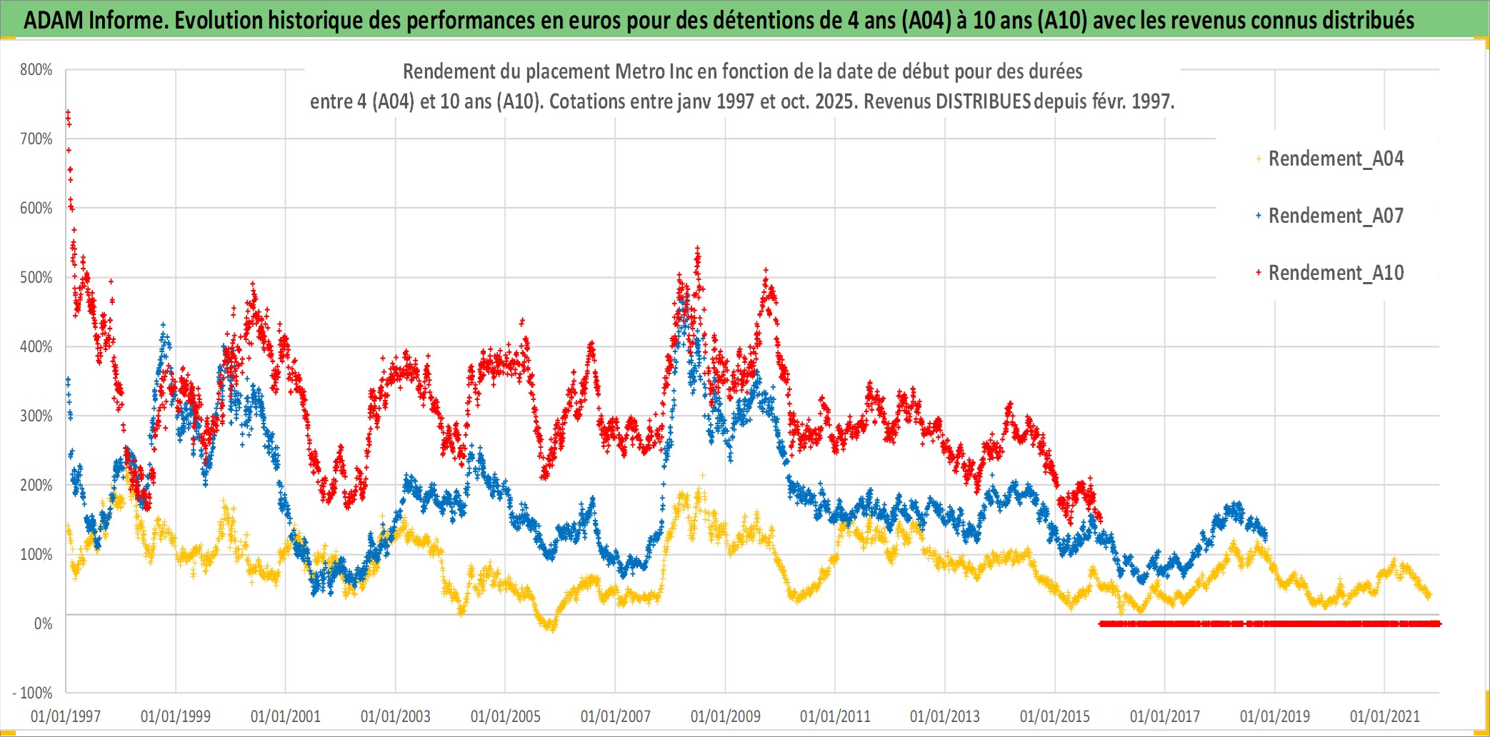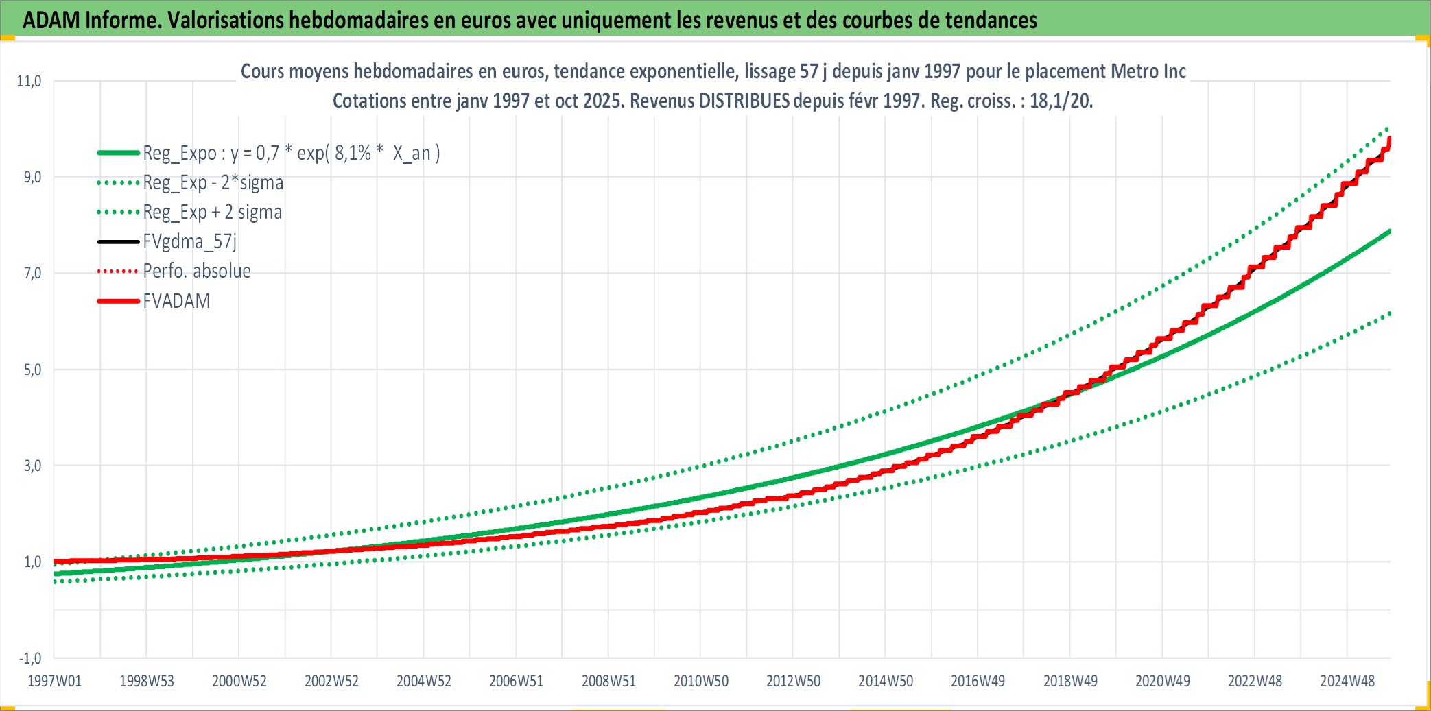 Site dédié aux investisseursPage dédiée sur site financeAnalyse des valorisations hebdomadaires de l'action Metro Inc. Cet actif est cote en CAD. Les valorisations sont en contrevaleur EURO et couvrent les semaines 1997W01 a 2025W44. Les revenus de cet actif financier sont pris en compte depuis la semaine 1997W06. La note globale ESG de cet actif est estimee a 10.0 (apres rebasage entre 0 et 20).