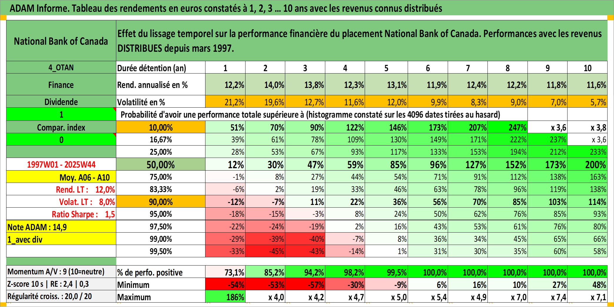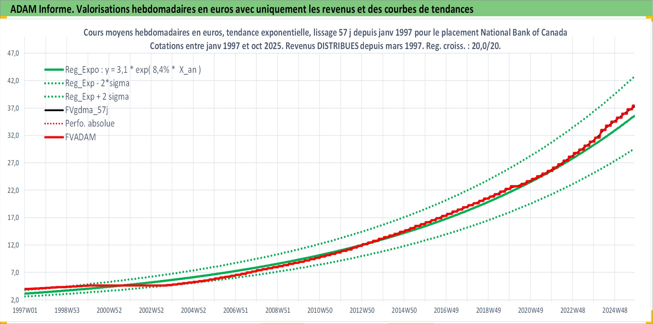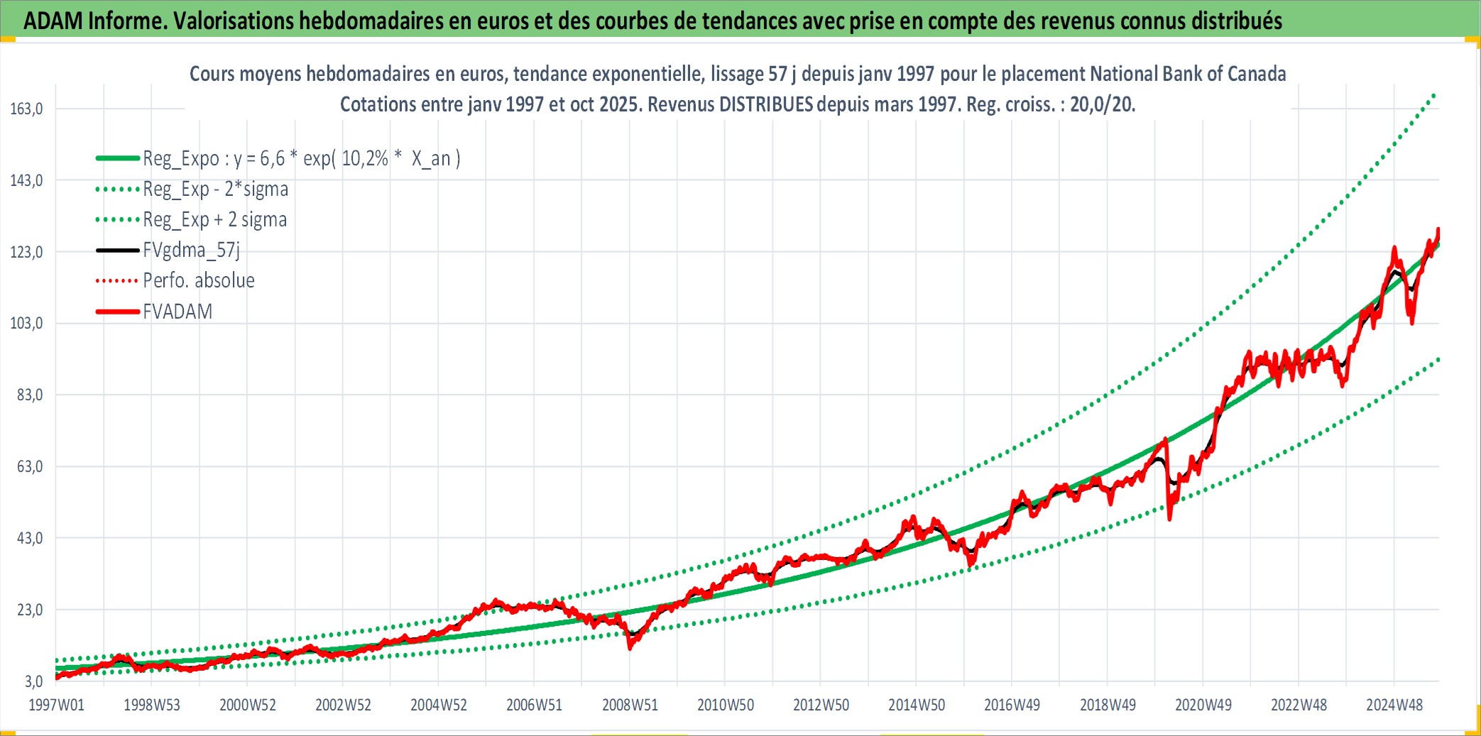 Site dédié aux investisseursPage dédiée sur site financeAnalyse des valorisations hebdomadaires de l'action National Bank of Canada. Cet actif est cote en CAD. Les valorisations sont en contrevaleur EURO et couvrent les semaines 1997W01 a 2025W44. Les revenus de cet actif financier sont pris en compte depuis la semaine 1997W13. La note globale ESG de cet actif est estimee a 13.0 (apres rebasage entre 0 et 20).