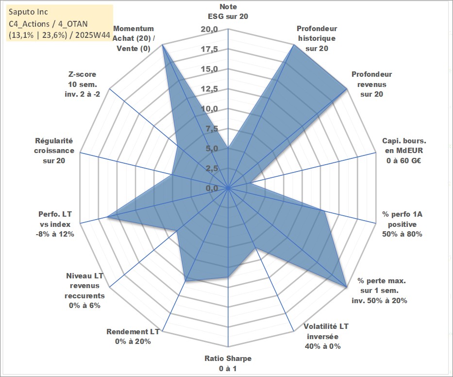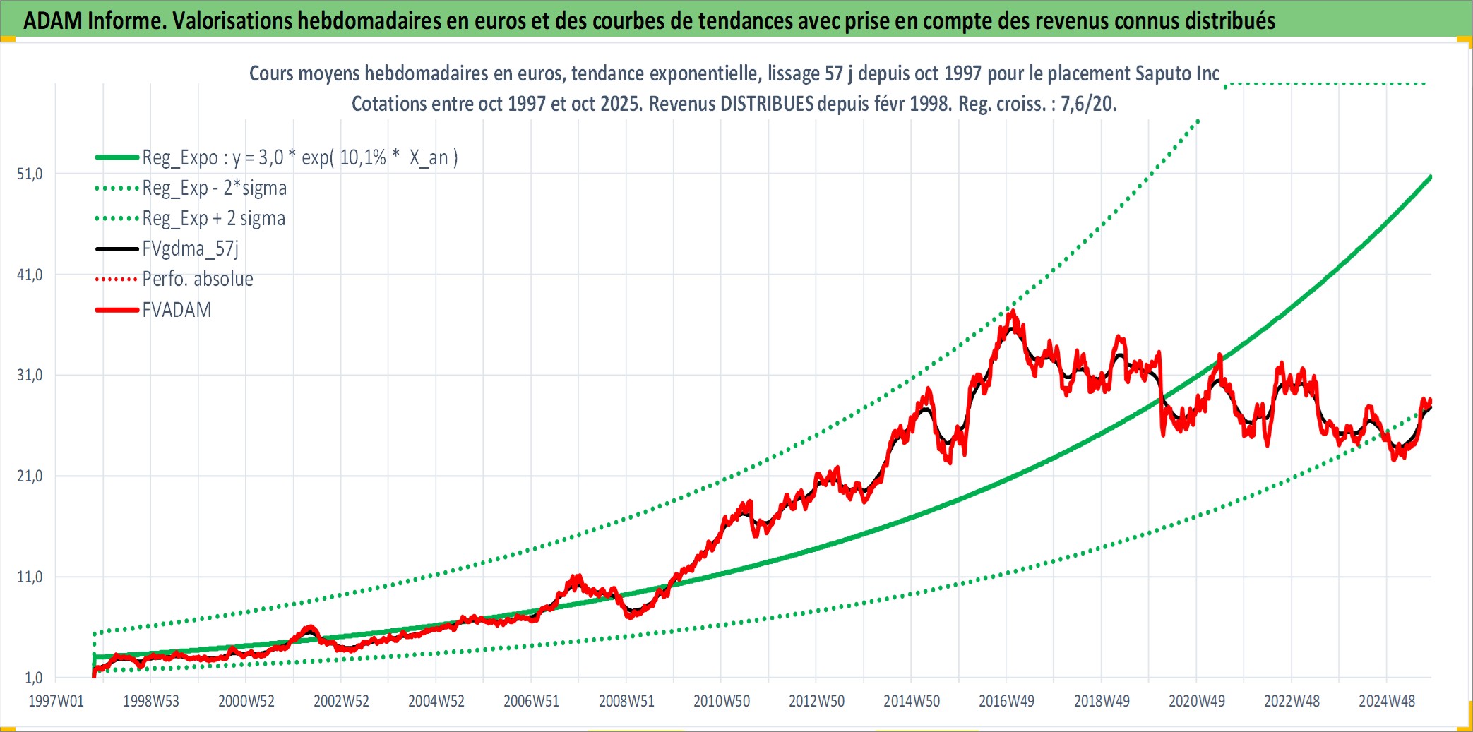 Site dédié aux investisseursPage dédiée sur site financeAnalyse des valorisations hebdomadaires de l'action Saputo Inc. Cet actif est cote en CAD. Les valorisations sont en contrevaleur EURO et couvrent les semaines 1997W43 a 2025W44. Les revenus de cet actif financier sont pris en compte depuis la semaine 1998W08. La note globale ESG de cet actif est estimee a 5.0 (apres rebasage entre 0 et 20).