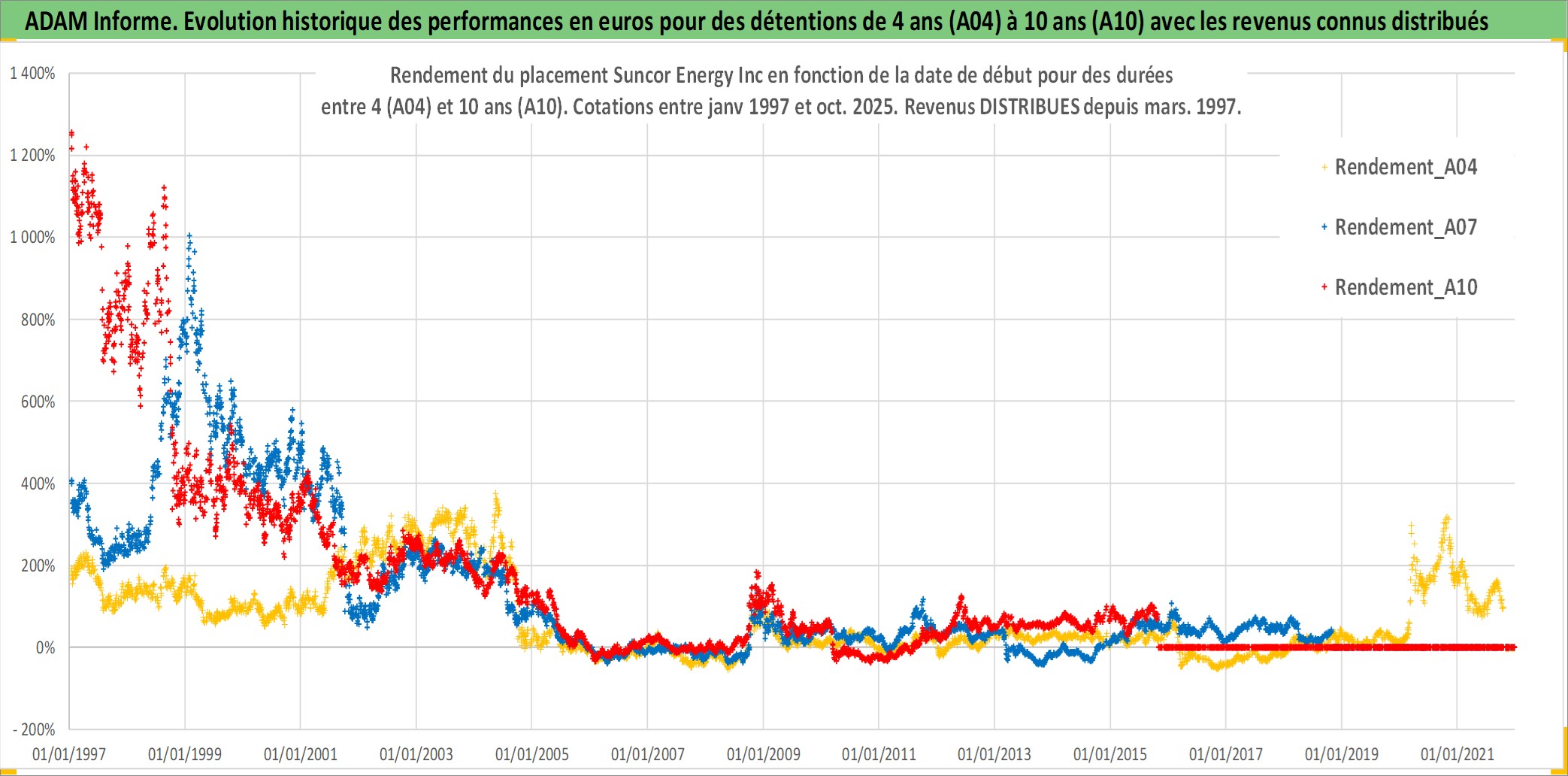 Site dédié aux investisseursPage dédiée sur site financeAnalyse des valorisations hebdomadaires de l'action Suncor Energy Inc. Cet actif est cote en CAD. Les valorisations sont en contrevaleur EURO et couvrent les semaines 1997W01 a 2025W44. Les revenus de cet actif financier sont pris en compte depuis la semaine 1997W11. La note globale ESG de cet actif est estimee a 5.0 (apres rebasage entre 0 et 20).