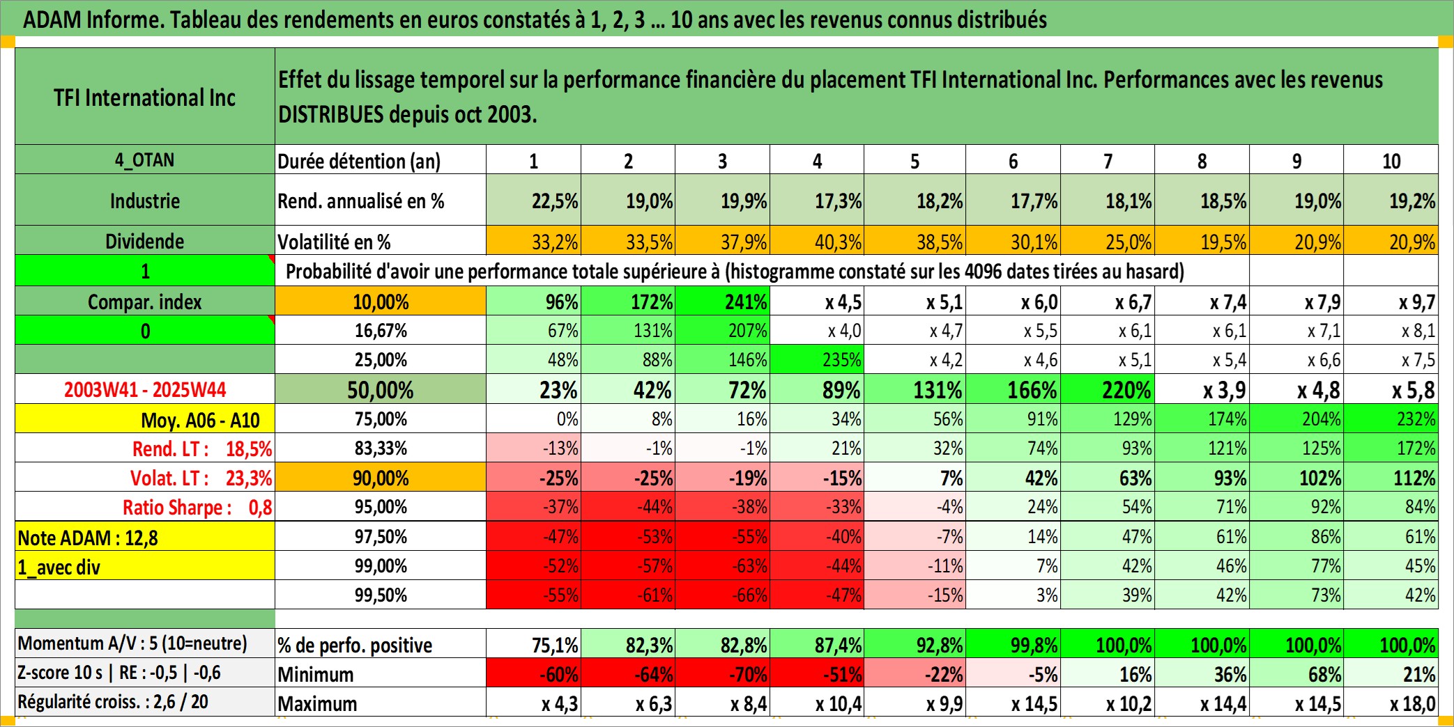Site dédié aux investisseursPage dédiée sur site financeAnalyse des valorisations hebdomadaires de l'action TFI International Inc. Cet actif est cote en CAD. Les valorisations sont en contrevaleur EURO et couvrent les semaines 2003W41 a 2025W44. Les revenus de cet actif financier sont pris en compte depuis la semaine 2003W44. La note ESG de cet actif n'est pas connue.