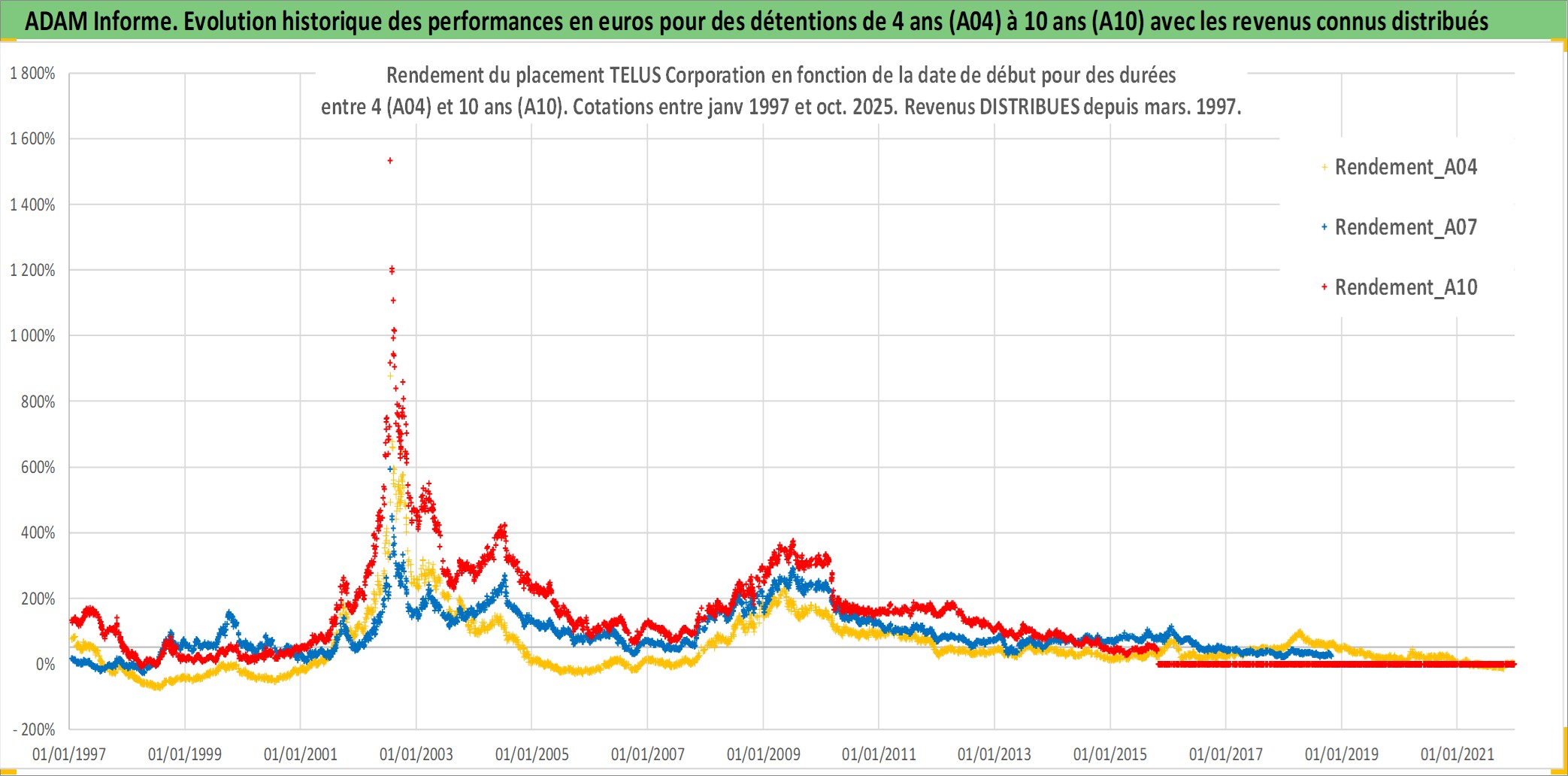 Site dédié aux investisseursPage dédiée sur site financeAnalyse des valorisations hebdomadaires de l'action TELUS Corporation. Cet actif est cote en CAD. Les valorisations sont en contrevaleur EURO et couvrent les semaines 1997W01 a 2025W44. Les revenus de cet actif financier sont pris en compte depuis la semaine 1997W10. La note globale ESG de cet actif est estimee a 12.0 (apres rebasage entre 0 et 20).