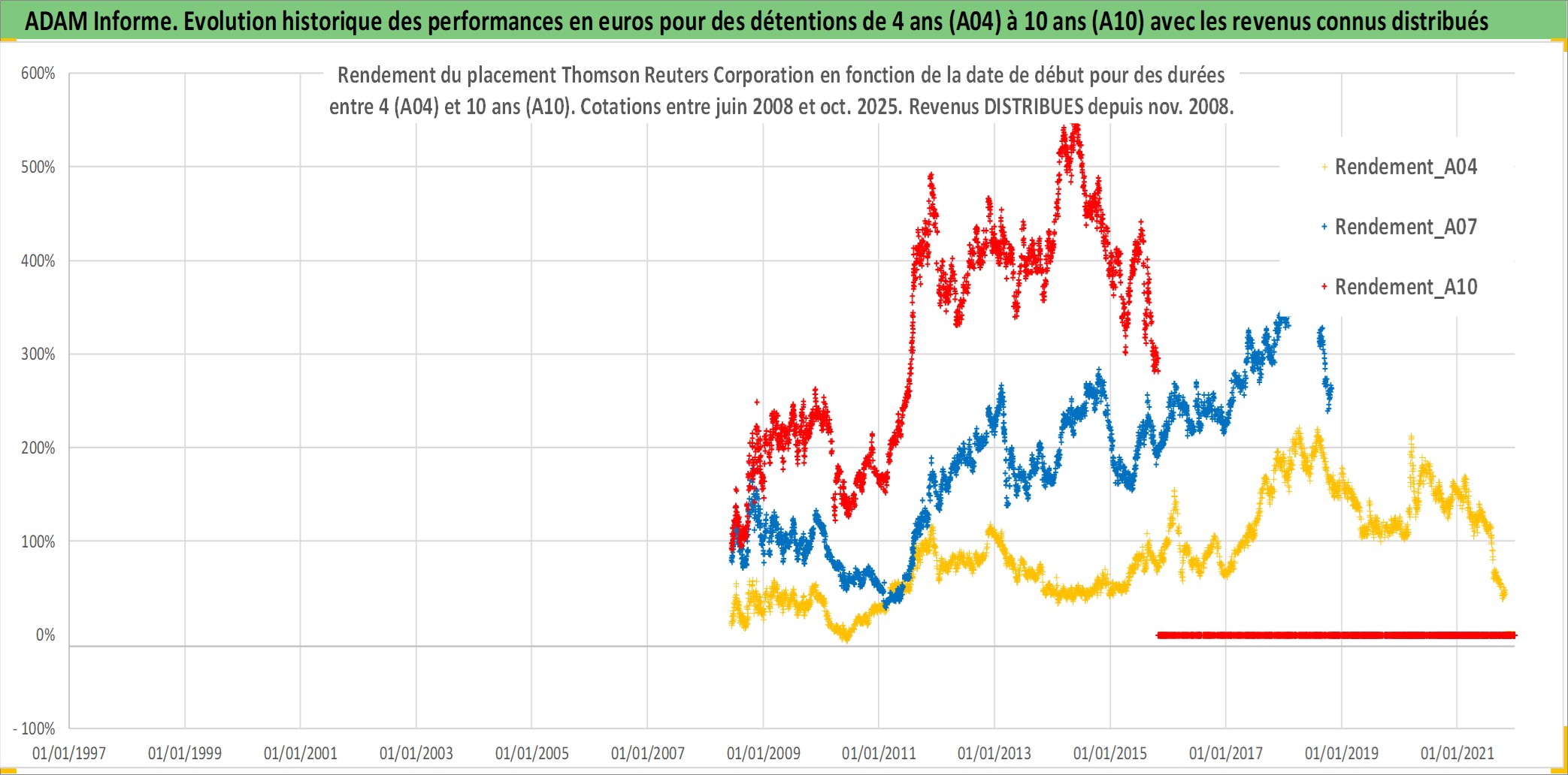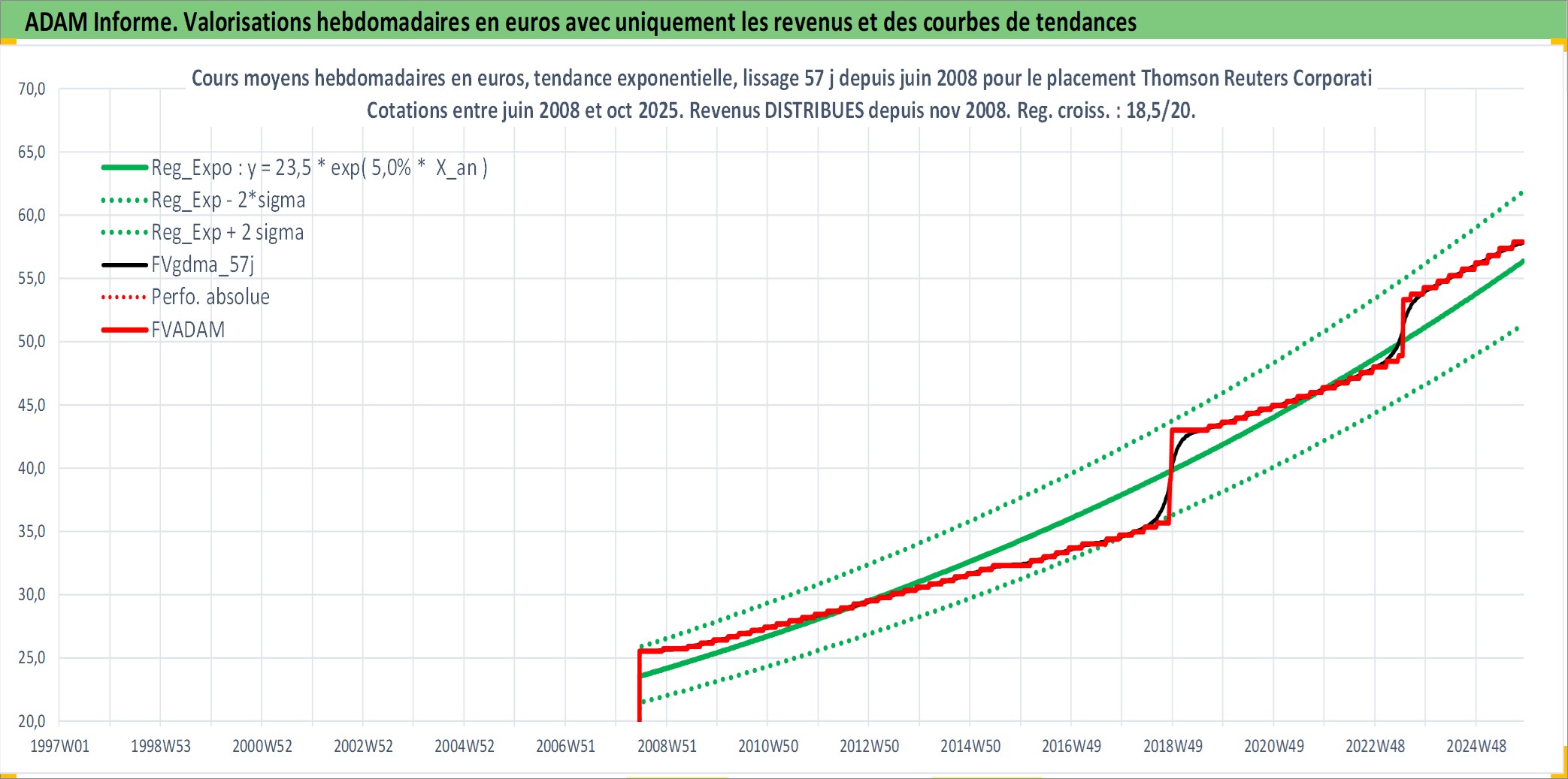 Site dédié aux investisseursPage dédiée sur site financeAnalyse des valorisations hebdomadaires de l'action Thomson Reuters Corporation. Cet actif est cote en CAD. Les valorisations sont en contrevaleur EURO et couvrent les semaines 2008W23 a 2025W44. Les revenus de cet actif financier sont pris en compte depuis la semaine 2008W47. La note globale ESG de cet actif est estimee a 18.0 (apres rebasage entre 0 et 20).