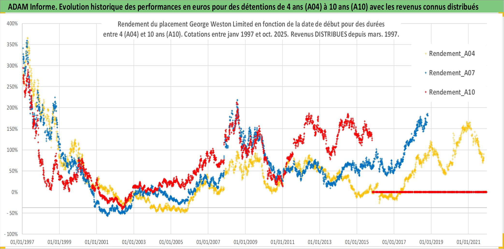 Site dédié aux investisseursPage dédiée sur site financeAnalyse des valorisations hebdomadaires de l'action George Weston Limited. Cet actif est cote en CAD. Les valorisations sont en contrevaleur EURO et couvrent les semaines 1997W01 a 2025W44. Les revenus de cet actif financier sont pris en compte depuis la semaine 1997W11. La note globale ESG de cet actif est estimee a 7.0 (apres rebasage entre 0 et 20).