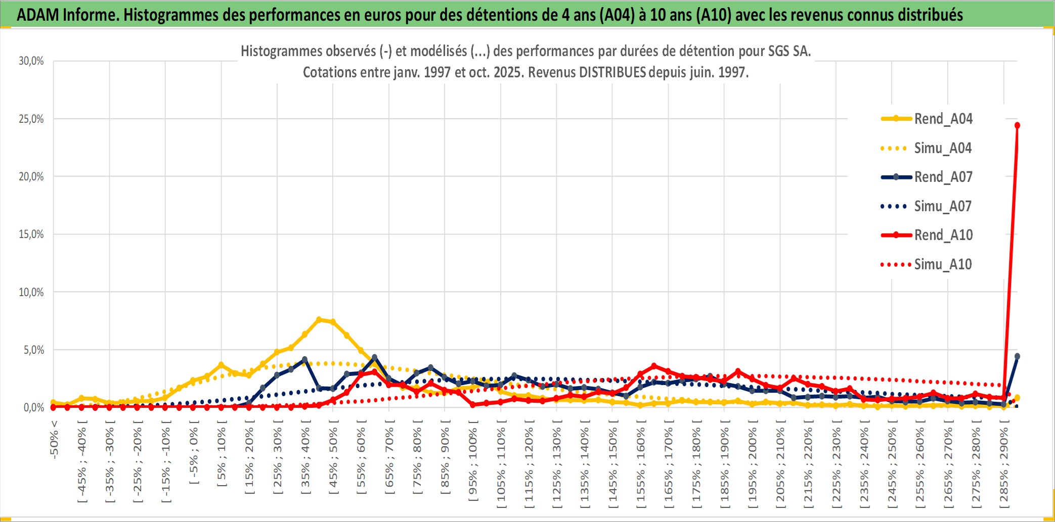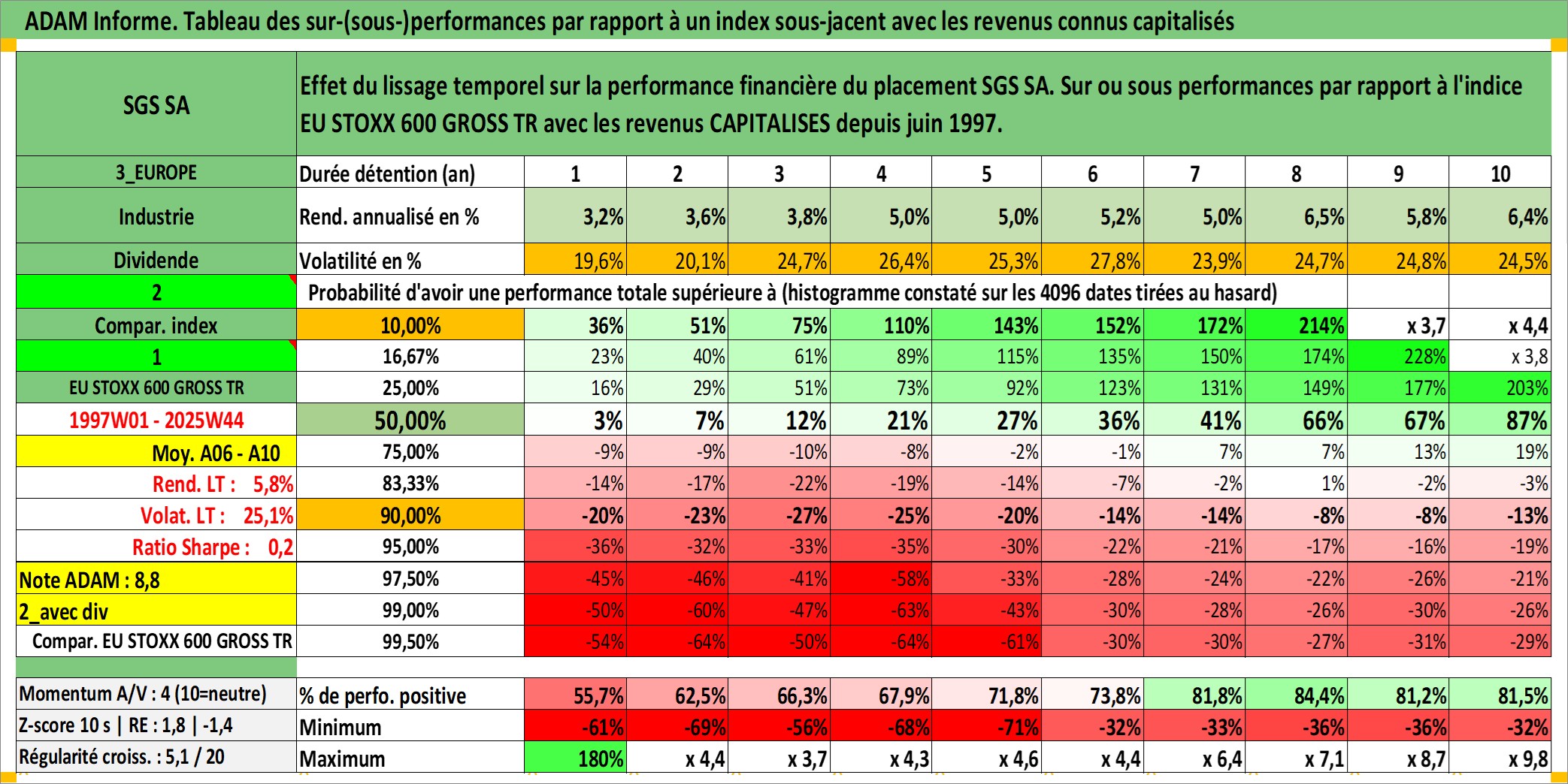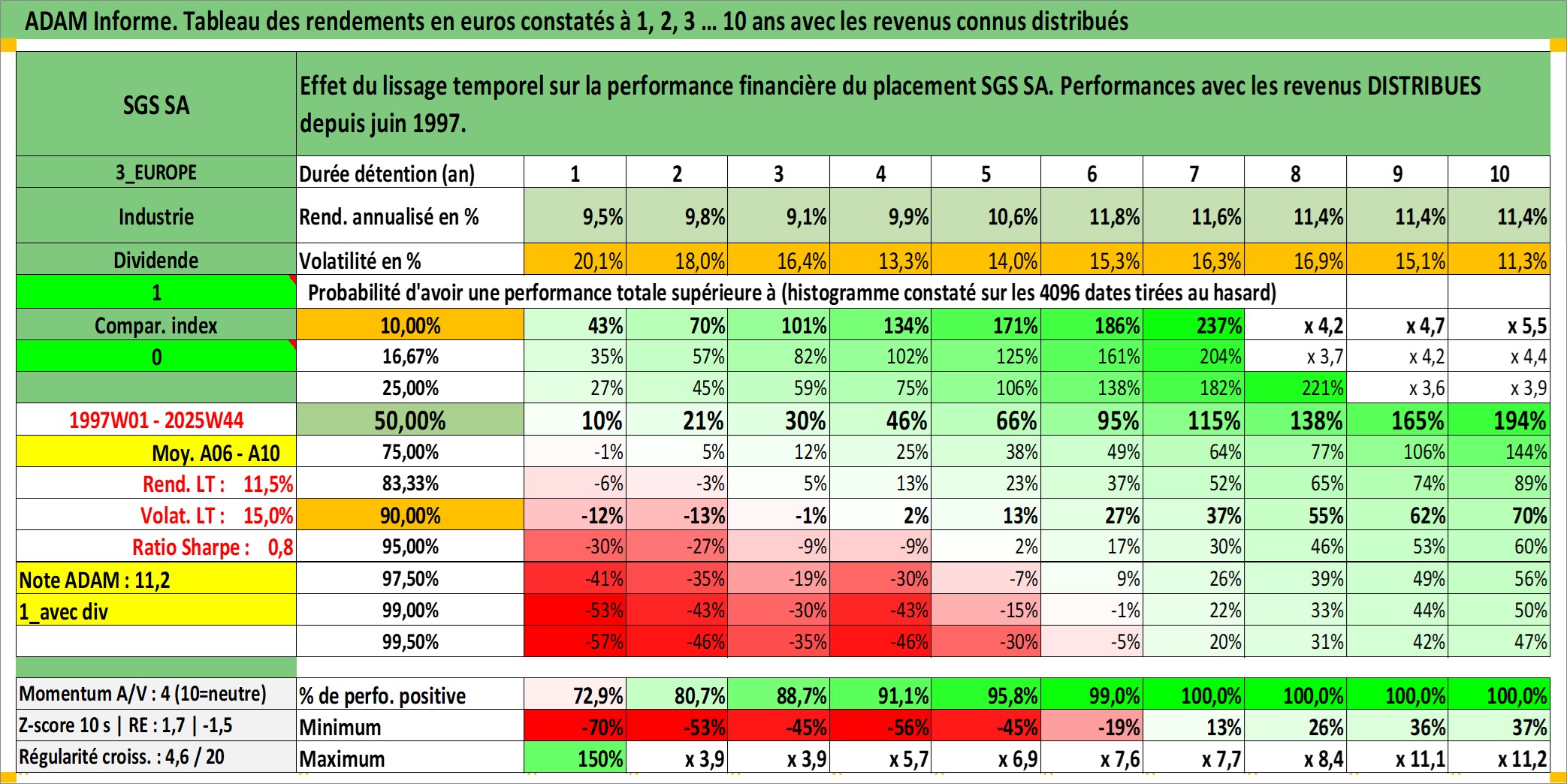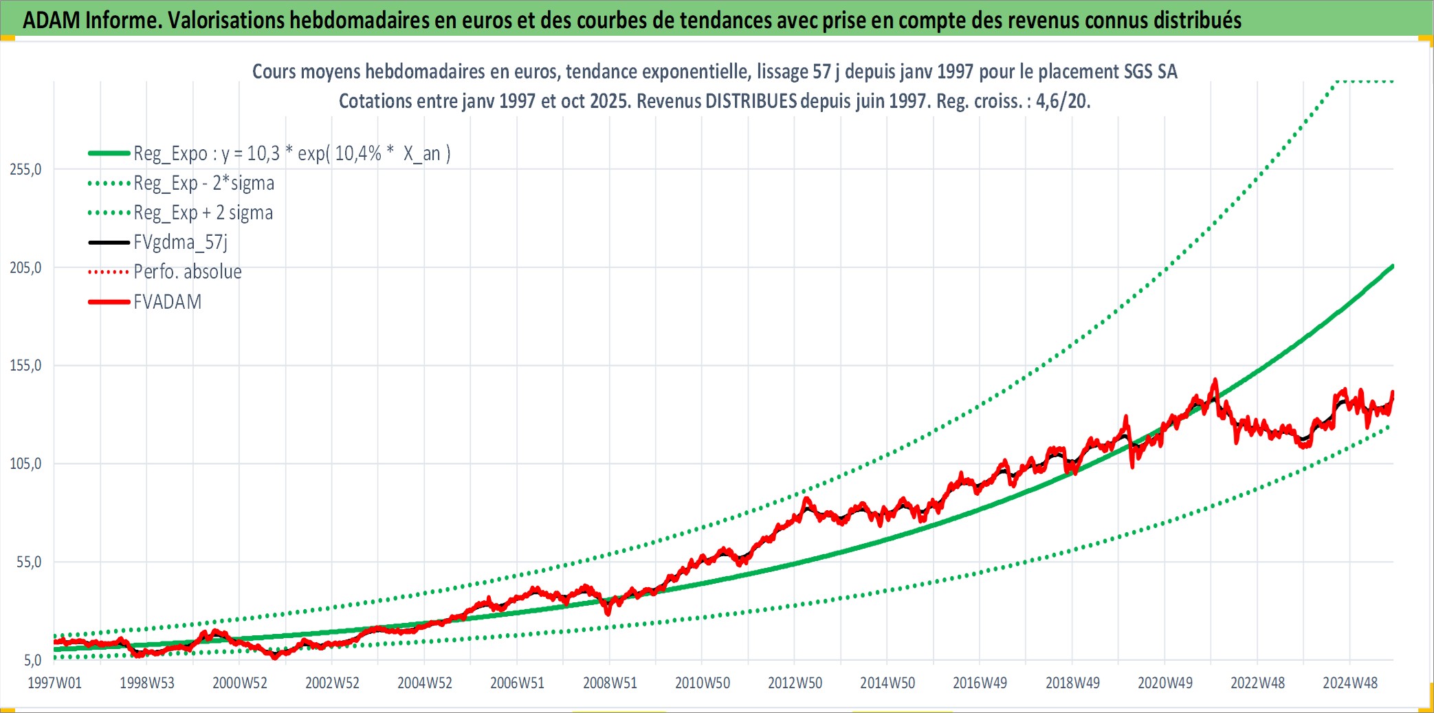 Site dédié aux investisseursPage dédiée sur site financeAnalyse des valorisations hebdomadaires de l'action SGS SA. Cet actif est cote en CHF. Les valorisations sont en contrevaleur EURO et couvrent les semaines 1997W01 a 2025W44. Les revenus de cet actif financier sont pris en compte depuis la semaine 1997W24. La note globale ESG de cet actif est estimee a 11.0 (apres rebasage entre 0 et 20).