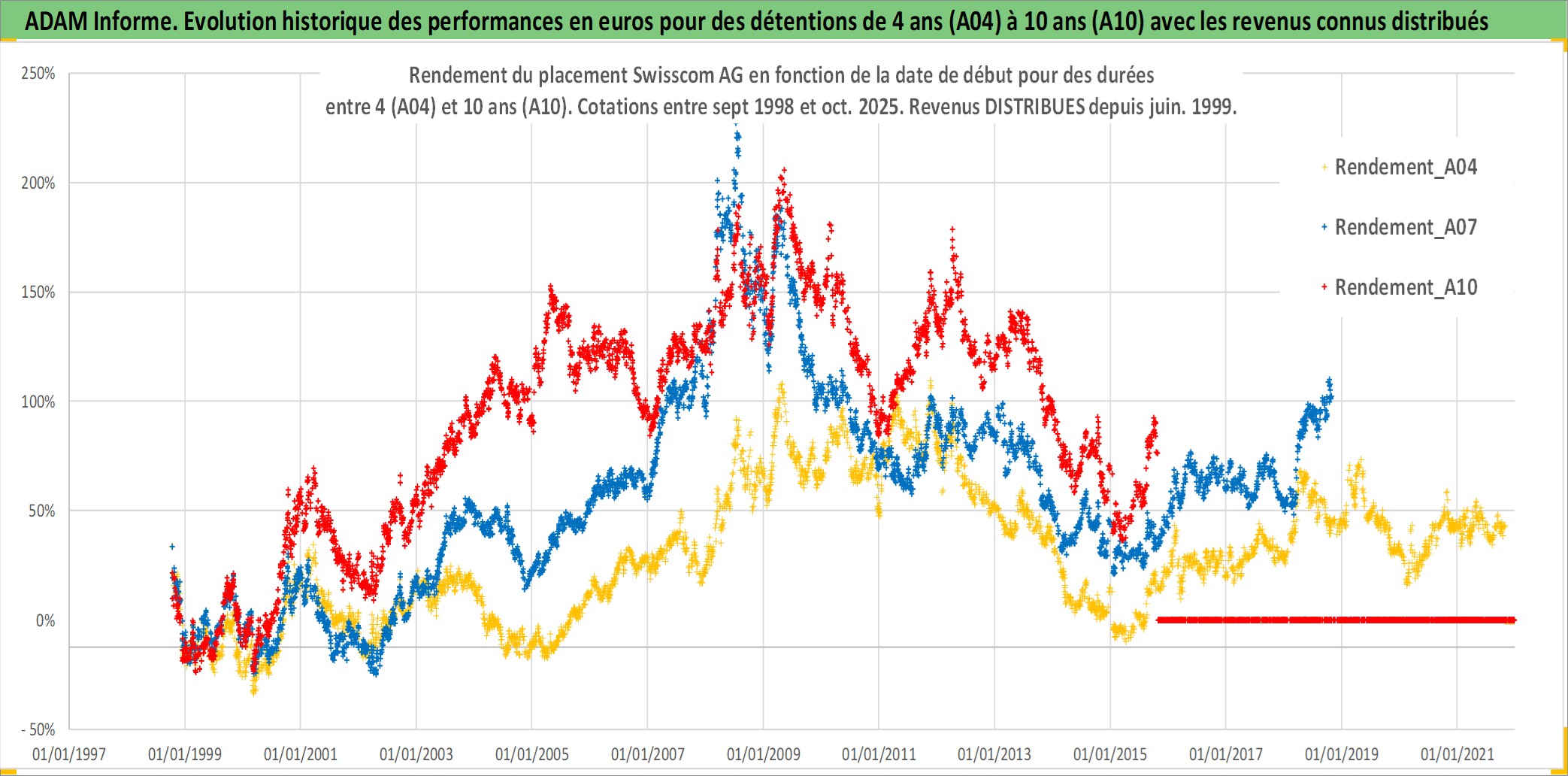 Site dédié aux investisseursPage dédiée sur site financeAnalyse des valorisations hebdomadaires de l'action Swisscom AG. Cet actif est cote en CHF. Les valorisations sont en contrevaleur EURO et couvrent les semaines 1998W40 a 2025W44. Les revenus de cet actif financier sont pris en compte depuis la semaine 1999W22. La note globale ESG de cet actif est estimee a 13.0 (apres rebasage entre 0 et 20).