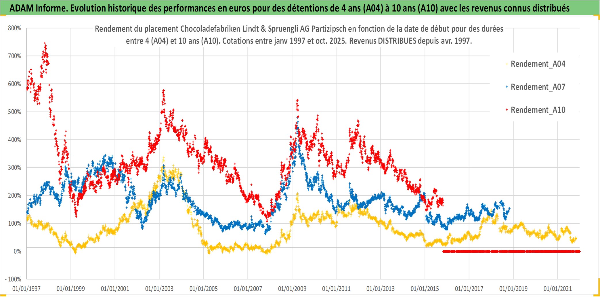Site dédié aux investisseursPage dédiée sur site financeAnalyse des valorisations hebdomadaires de l'action Chocoladefabriken Lindt & Spruengli AG Partizipsch. Cet actif est cote en CHF. Les valorisations sont en contrevaleur EURO et couvrent les semaines 1997W01 a 2025W44. Les revenus de cet actif financier sont pris en compte depuis la semaine 1997W18. La note ESG de cet actif n'est pas connue.