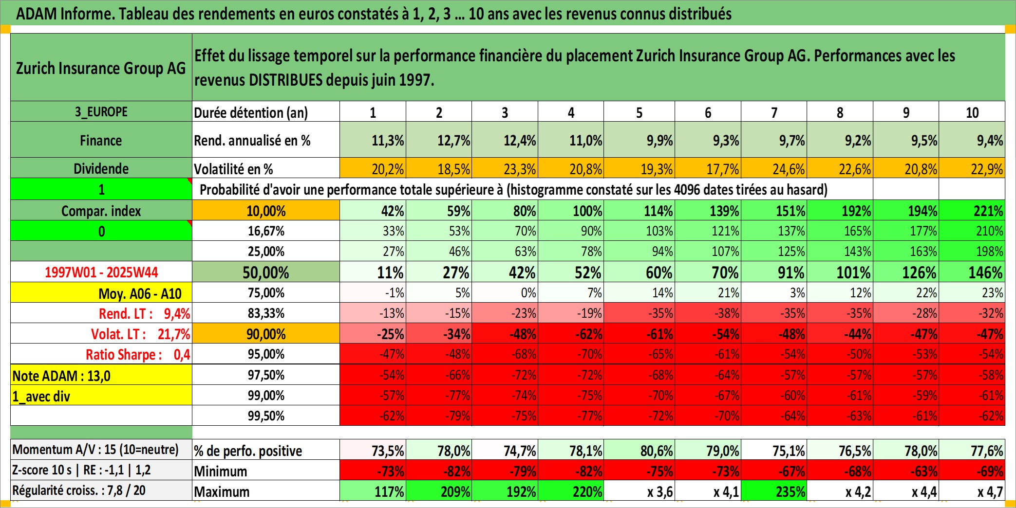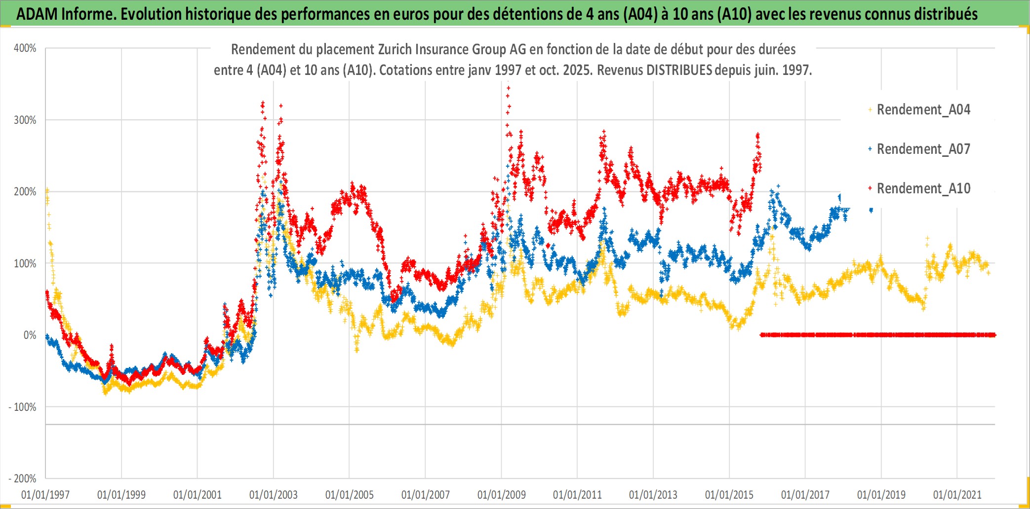 Site dédié aux investisseursPage dédiée sur site financeAnalyse des valorisations hebdomadaires de l'action Zurich Insurance Group AG. Cet actif est cote en CHF. Les valorisations sont en contrevaleur EURO et couvrent les semaines 1997W01 a 2025W44. Les revenus de cet actif financier sont pris en compte depuis la semaine 1997W25. La note globale ESG de cet actif est estimee a 11.0 (apres rebasage entre 0 et 20).
