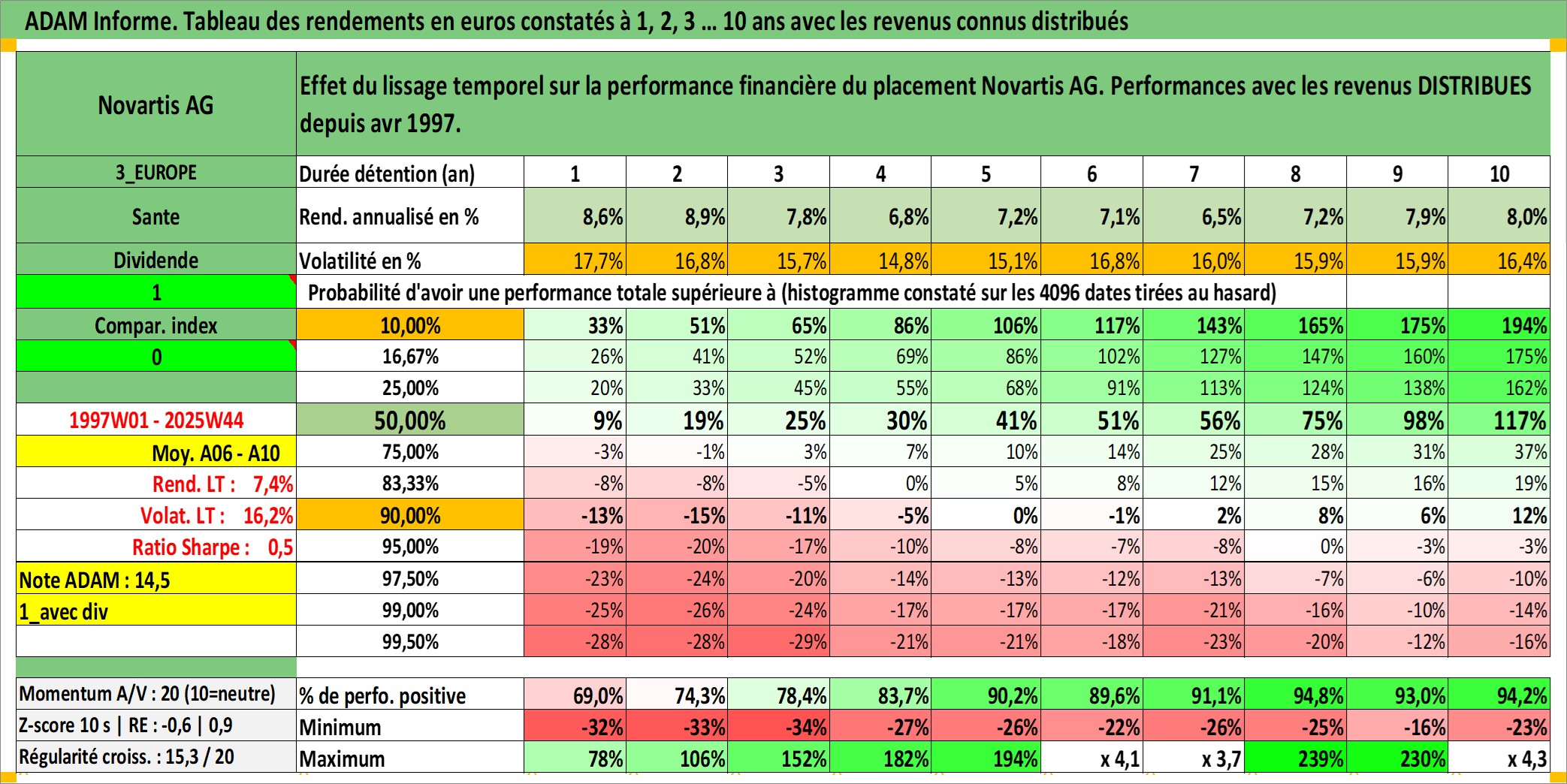 Site dédié aux investisseursPage dédiée sur site financeAnalyse des valorisations hebdomadaires de l'action Novartis AG. Cet actif est cote en CHF. Les valorisations sont en contrevaleur EURO et couvrent les semaines 1997W01 a 2025W44. Les revenus de cet actif financier sont pris en compte depuis la semaine 1997W17. La note globale ESG de cet actif est estimee a 12.0 (apres rebasage entre 0 et 20).