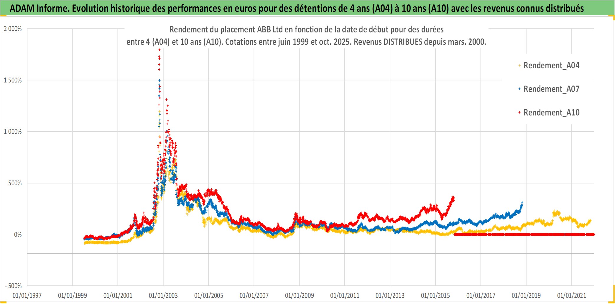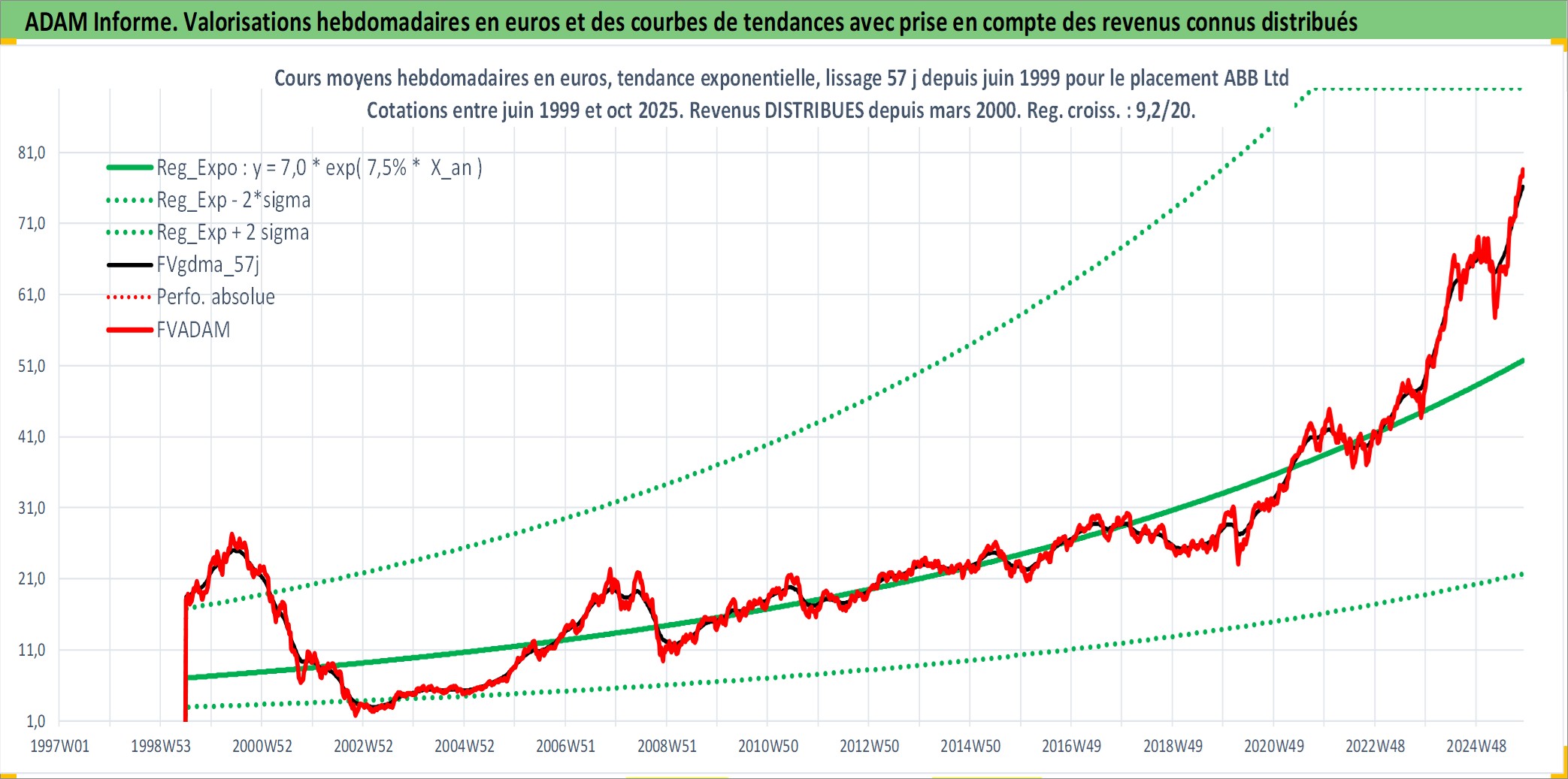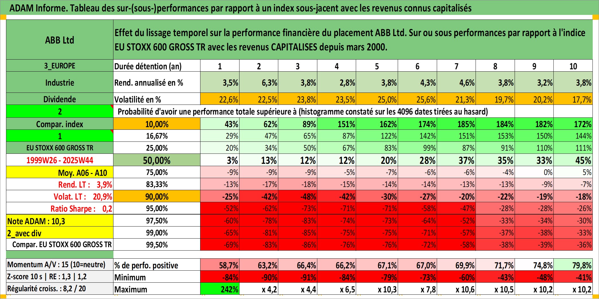 Site dédié aux investisseursPage dédiée sur site financeAnalyse des valorisations hebdomadaires de l'action ABB Ltd. Cet actif est cote en CHF. Les valorisations sont en contrevaleur EURO et couvrent les semaines 1999W26 a 2025W44. Les revenus de cet actif financier sont pris en compte depuis la semaine 2000W12. La note globale ESG de cet actif est estimee a 12.0 (apres rebasage entre 0 et 20).