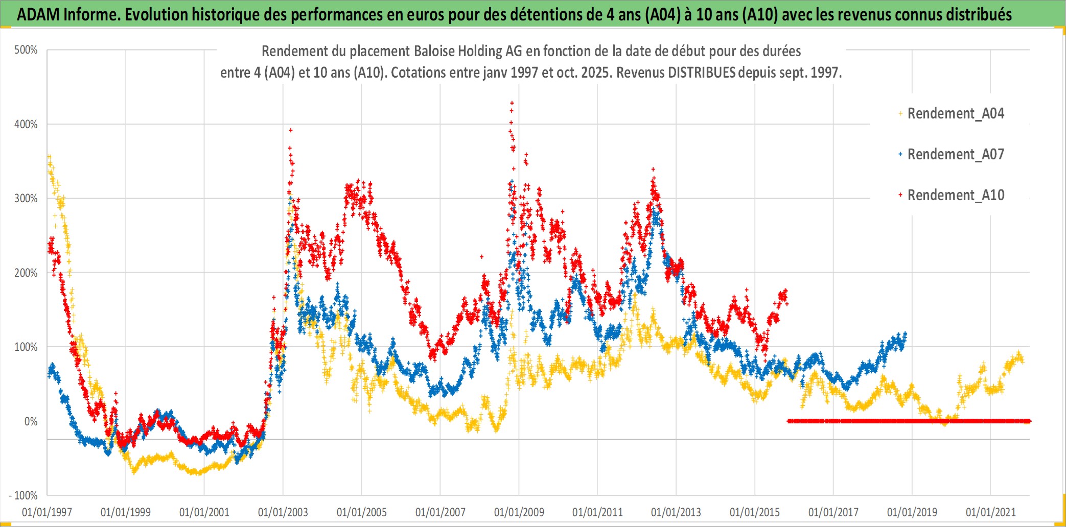 Site dédié aux investisseursPage dédiée sur site financeAnalyse des valorisations hebdomadaires de l'action Baloise Holding AG. Cet actif est cote en CHF. Les valorisations sont en contrevaleur EURO et couvrent les semaines 1997W01 a 2025W44. Les revenus de cet actif financier sont pris en compte depuis la semaine 1997W37. La note globale ESG de cet actif est estimee a 10.0 (apres rebasage entre 0 et 20).