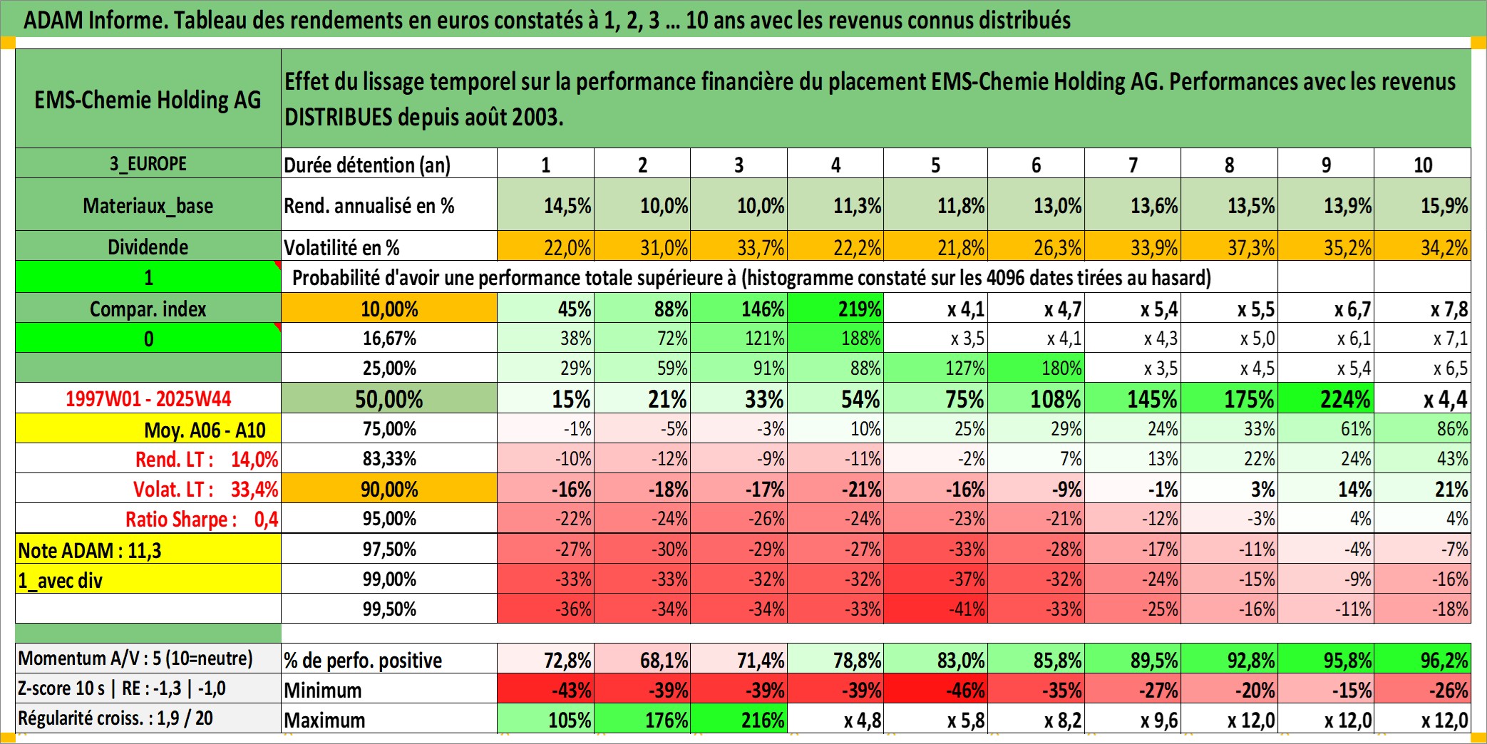 Site dédié aux investisseursPage dédiée sur site financeAnalyse des valorisations hebdomadaires de l'action EMS-Chemie Holding AG. Cet actif est cote en CHF. Les valorisations sont en contrevaleur EURO et couvrent les semaines 1997W01 a 2025W44. Les revenus de cet actif financier sont pris en compte depuis la semaine 2003W34. La note globale ESG de cet actif est estimee a 3.0 (apres rebasage entre 0 et 20).