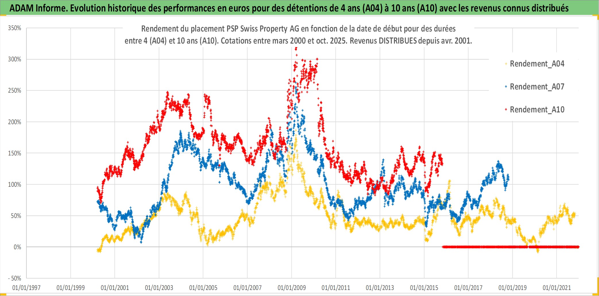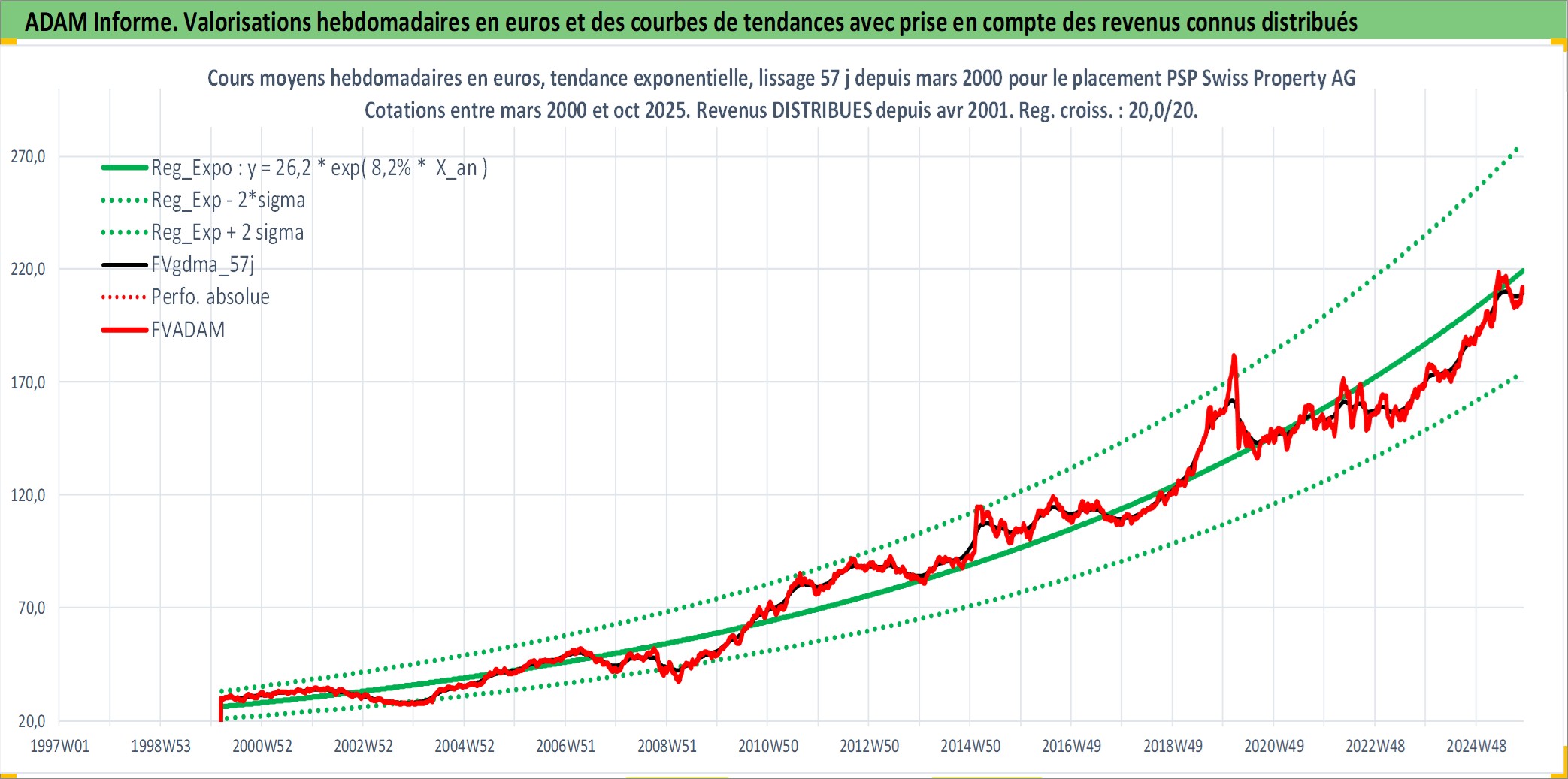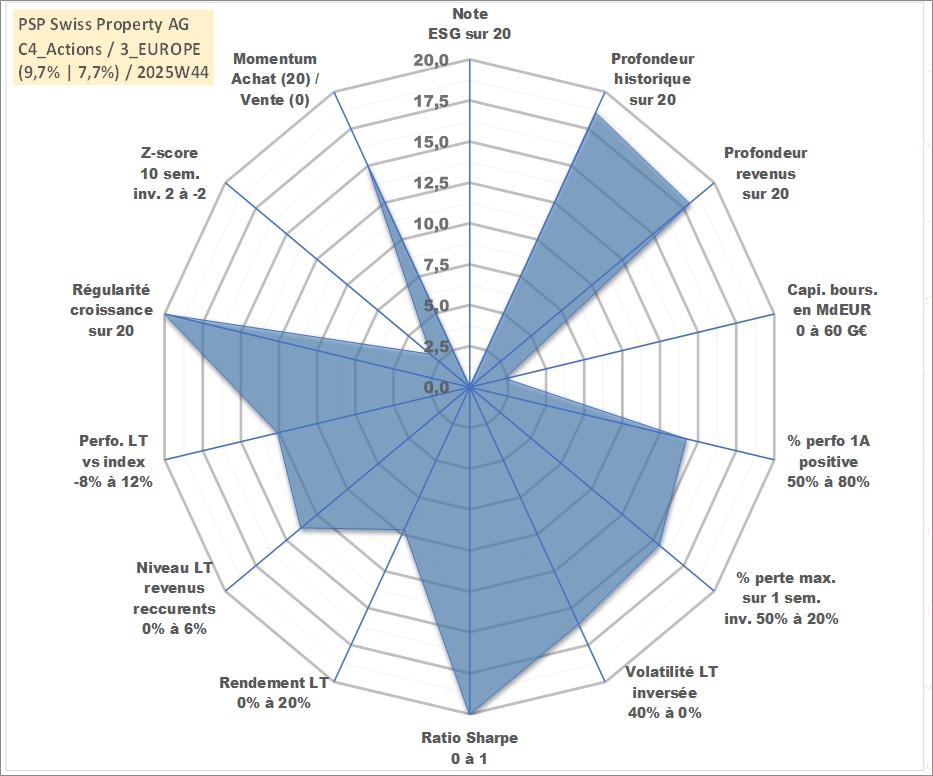 Site dédié aux investisseursPage dédiée sur site financeAnalyse des valorisations hebdomadaires de l'action PSP Swiss Property AG. Cet actif est cote en CHF. Les valorisations sont en contrevaleur EURO et couvrent les semaines 2000W10 a 2025W44. Les revenus de cet actif financier sont pris en compte depuis la semaine 2001W16. La note ESG de cet actif n'est pas connue.