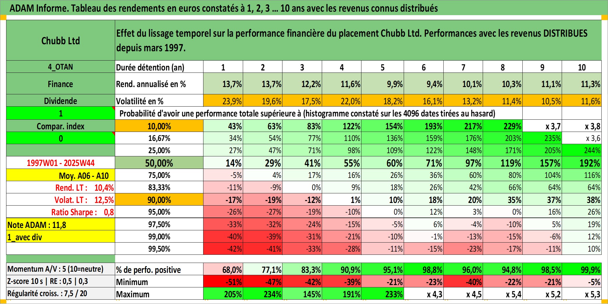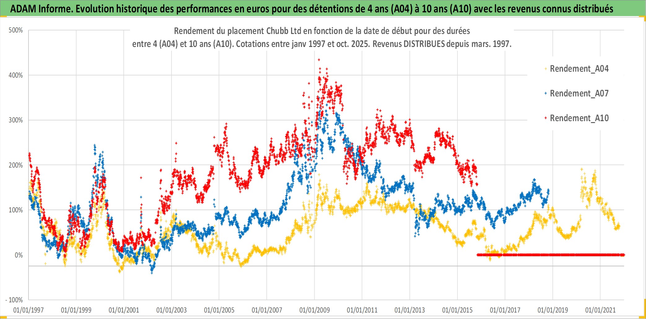 Site dédié aux investisseursPage dédiée sur site financeAnalyse des valorisations hebdomadaires de l'action Chubb Ltd. Cet actif est cote en USD. Les valorisations sont en contrevaleur EURO et couvrent les semaines 1997W01 a 2025W44. Les revenus de cet actif financier sont pris en compte depuis la semaine 1997W13. La note globale ESG de cet actif est estimee a 8.0 (apres rebasage entre 0 et 20).