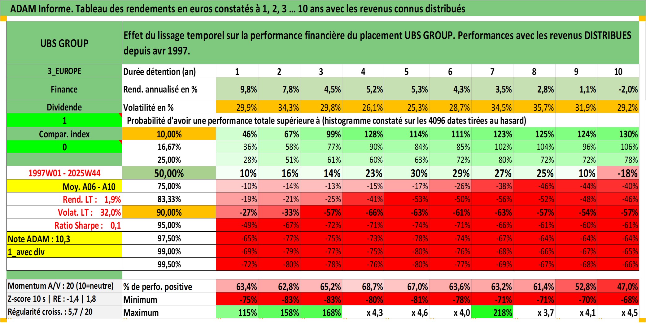 Site dédié aux investisseursPage dédiée sur site financeAnalyse des valorisations hebdomadaires de l'action UBS GROUP. Cet actif est cote en CHF. Les valorisations sont en contrevaleur EURO et couvrent les semaines 1997W01 a 2025W44. Les revenus de cet actif financier sont pris en compte depuis la semaine 1997W17. La note globale ESG de cet actif est estimee a 9.0 (apres rebasage entre 0 et 20).