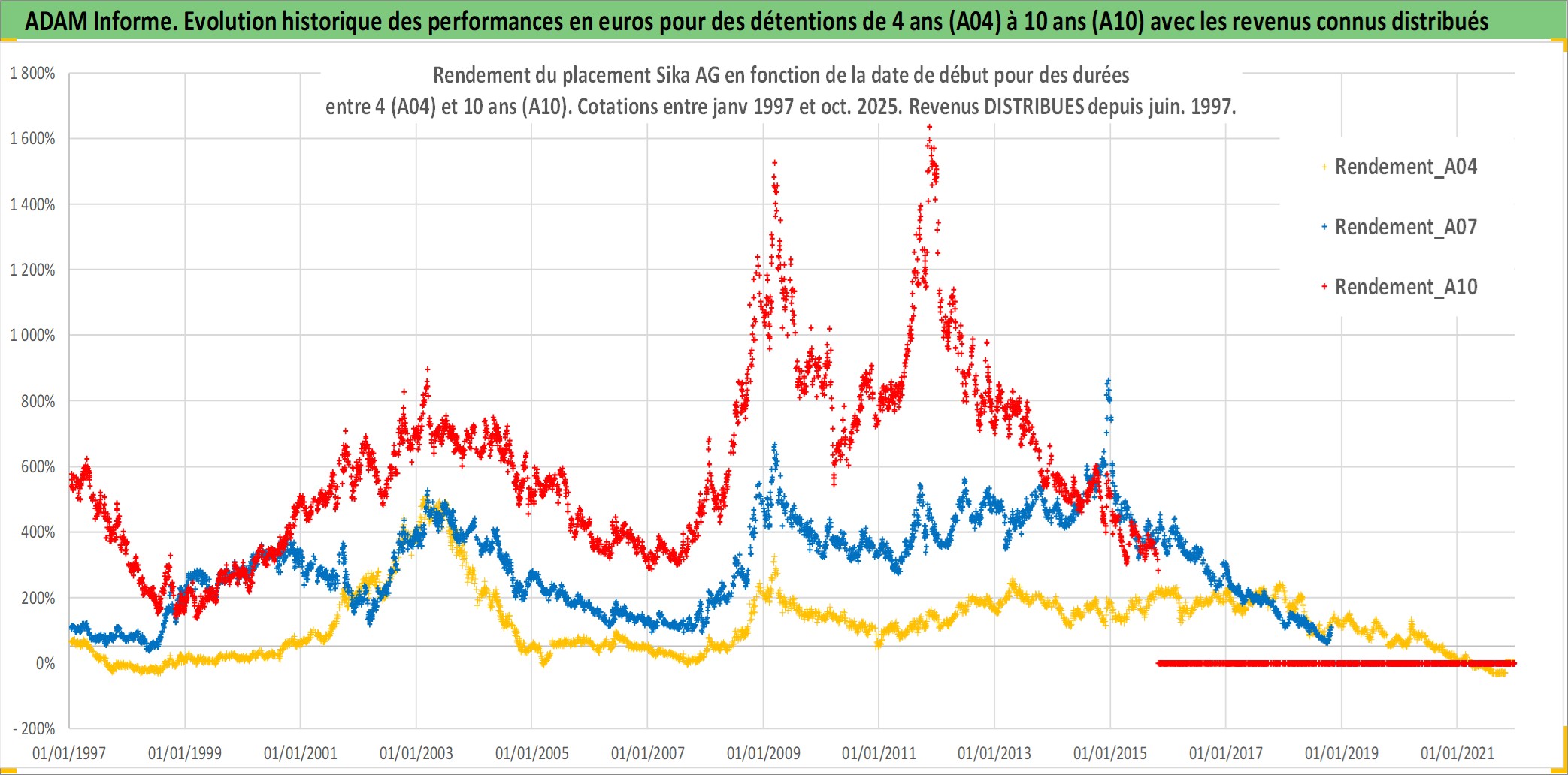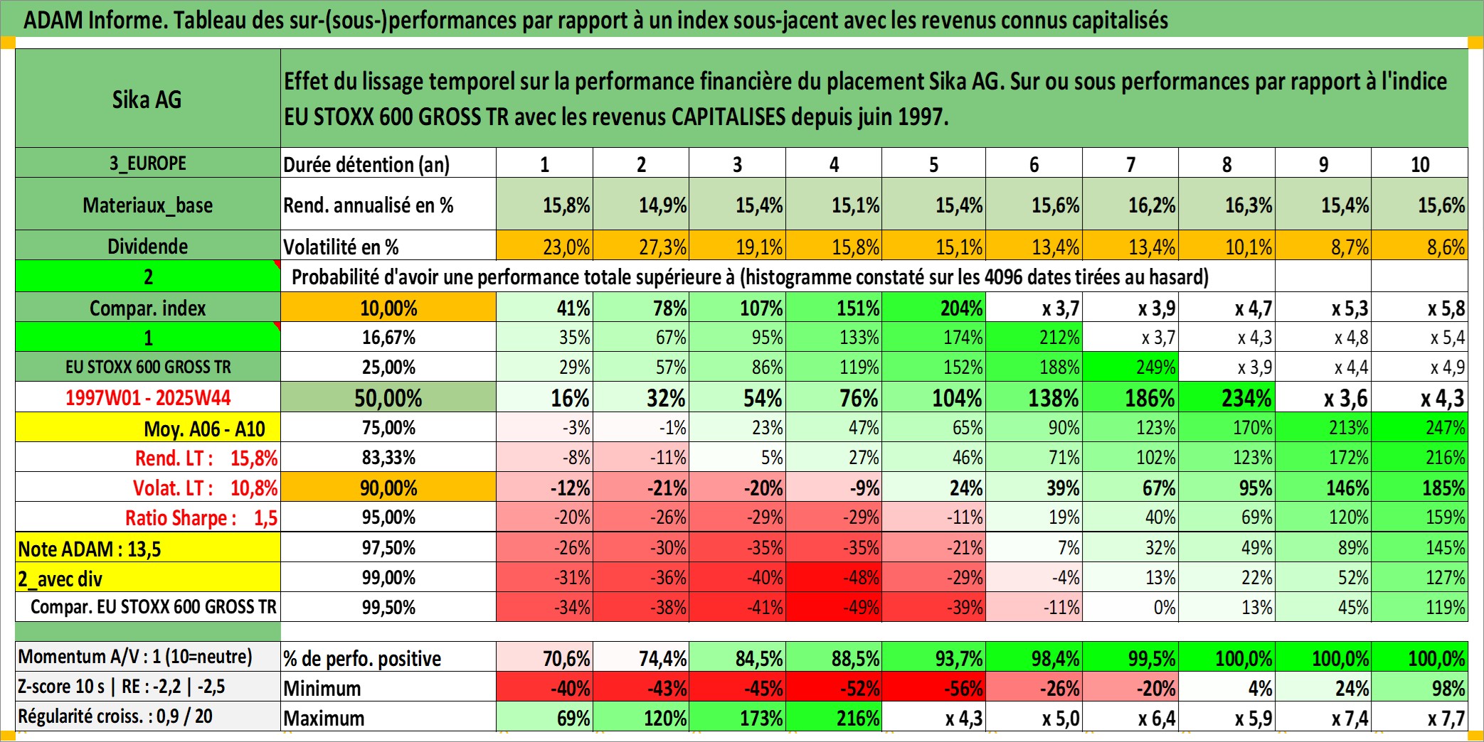 Site dédié aux investisseursPage dédiée sur site financeAnalyse des valorisations hebdomadaires de l'action Sika AG. Cet actif est cote en CHF. Les valorisations sont en contrevaleur EURO et couvrent les semaines 1997W01 a 2025W44. Les revenus de cet actif financier sont pris en compte depuis la semaine 1997W23. La note globale ESG de cet actif est estimee a 9.0 (apres rebasage entre 0 et 20).